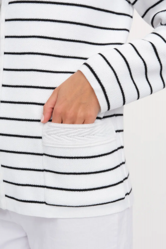 Жакет женский вязаный полуприлегающего силуэта в классическом стиле с круглым вырезом горловины и втачным рукавом полной длины. Застежка спереди на ряд крупных контрастных пуговиц. По бокам два прорезных кармана с пуговицей.  Жакет выполнен жаккардовым переплетением рисунок клетка.