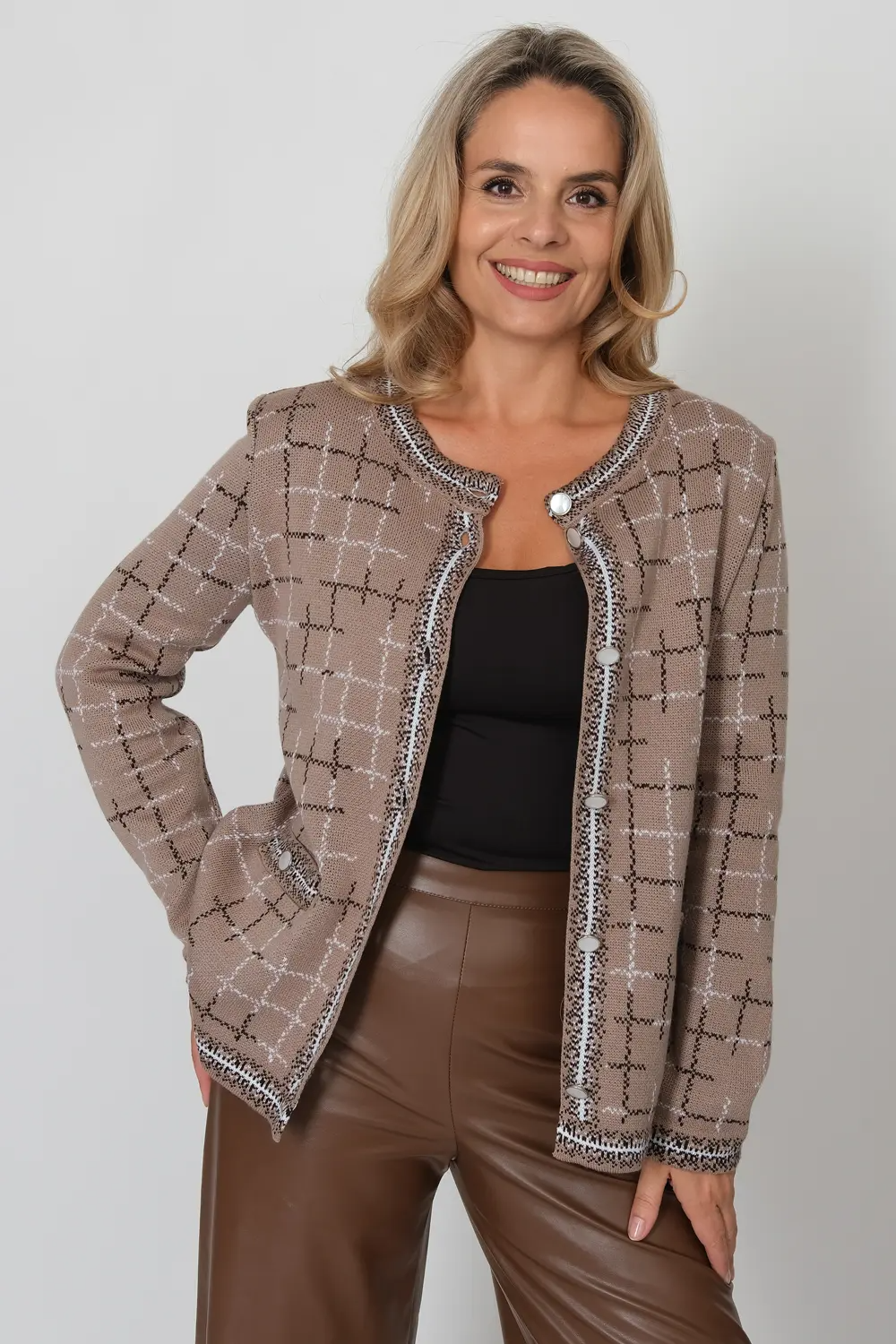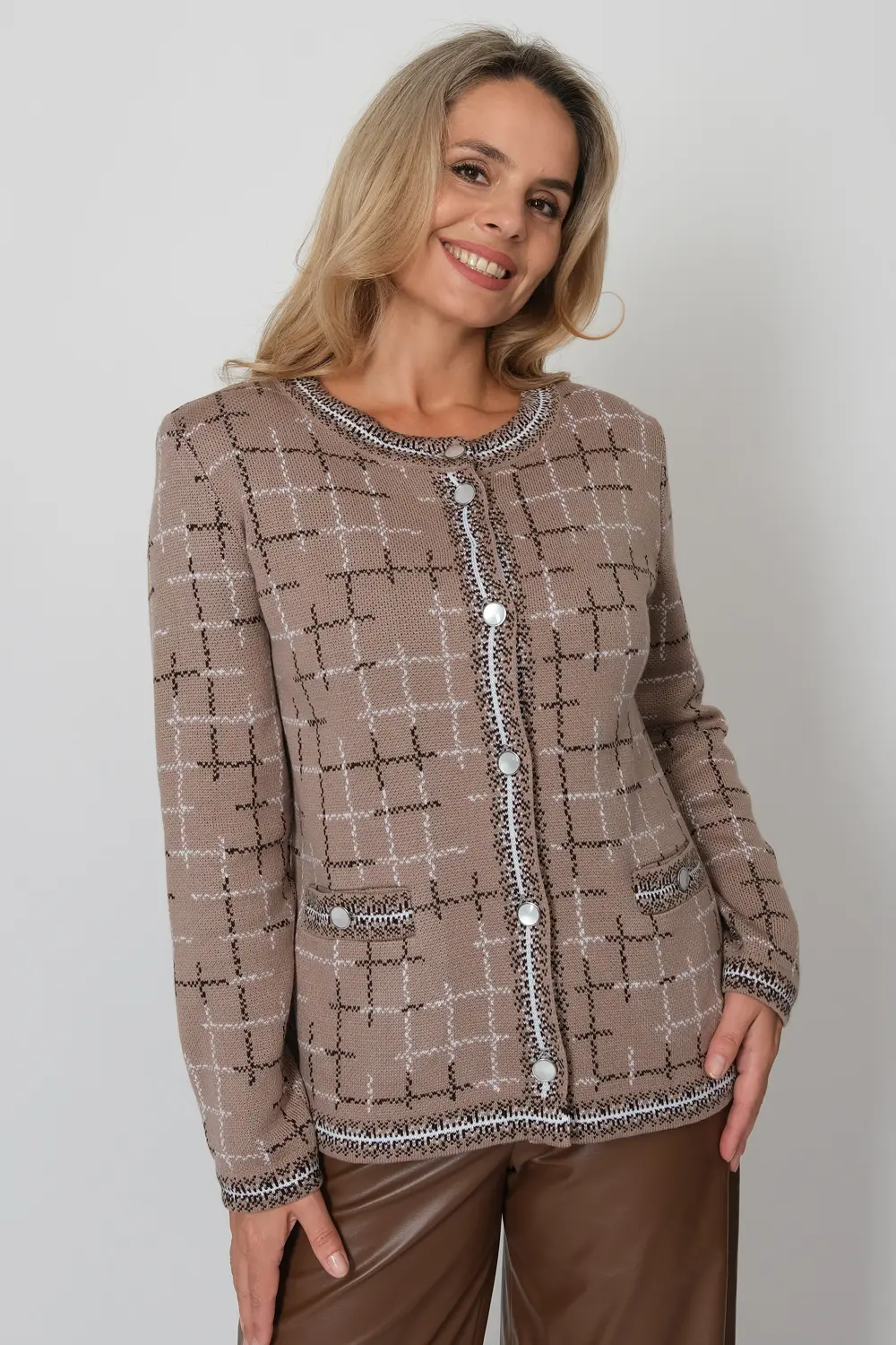 Жакет женский вязаный полуприлегающего силуэта в классическом стиле с круглым вырезом горловины и втачным рукавом полной длины. Застежка спереди на ряд крупных контрастных пуговиц. По бокам два прорезных кармана с пуговицей.  Жакет выполнен жаккардовым переплетением рисунок клетка. кофе