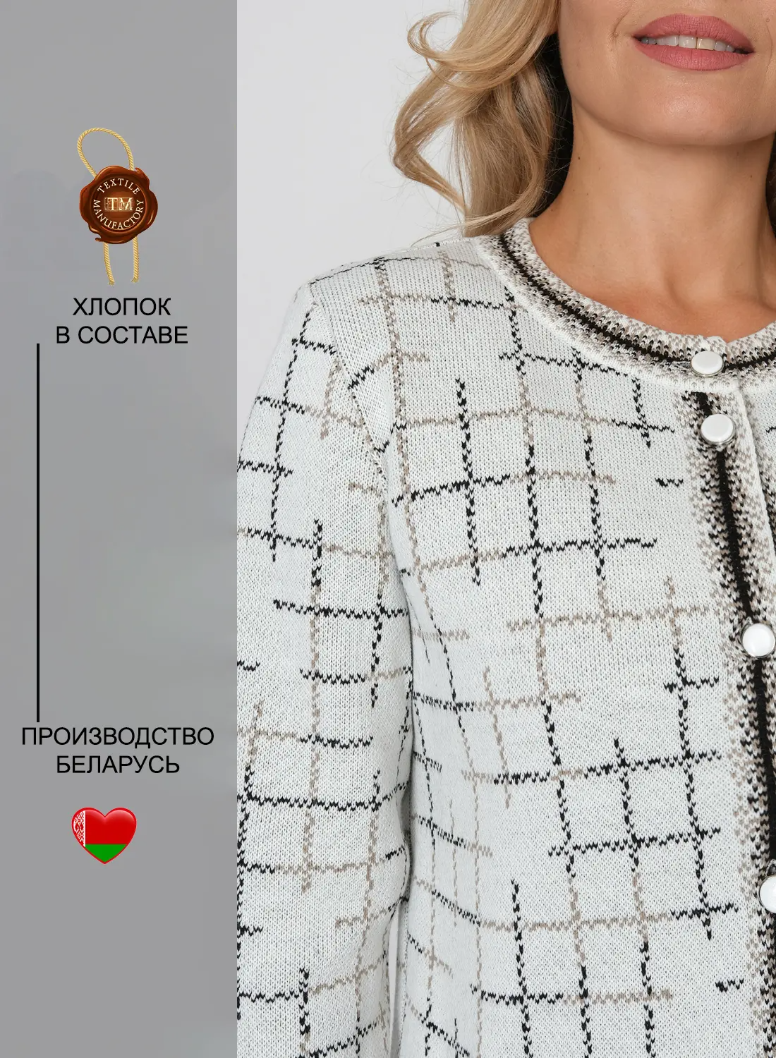 Жакет женский вязаный полуприлегающего силуэта в классическом стиле с круглым вырезом горловины и втачным рукавом полной длины. Застежка спереди на ряд крупных контрастных пуговиц. По бокам два прорезных кармана с пуговицей.  Жакет выполнен жаккардовым переплетением рисунок клетка. молочный
