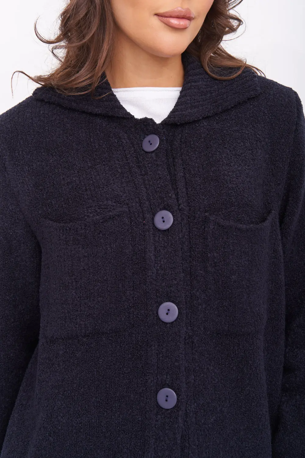 Женский вязаный жакет прямого силуэта с воротничком, на пуговицах. На груди два накладных кармана. Рукава втачные длинные с эластичными манжетами. Жакет выполнен из качественной буклированной пряжи с составом 30% хлопок/70% ПАН, очень мягкой, нежной и приятной к телу.