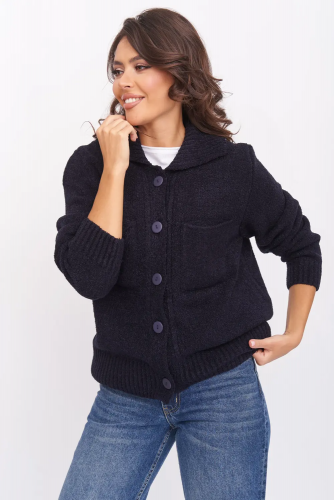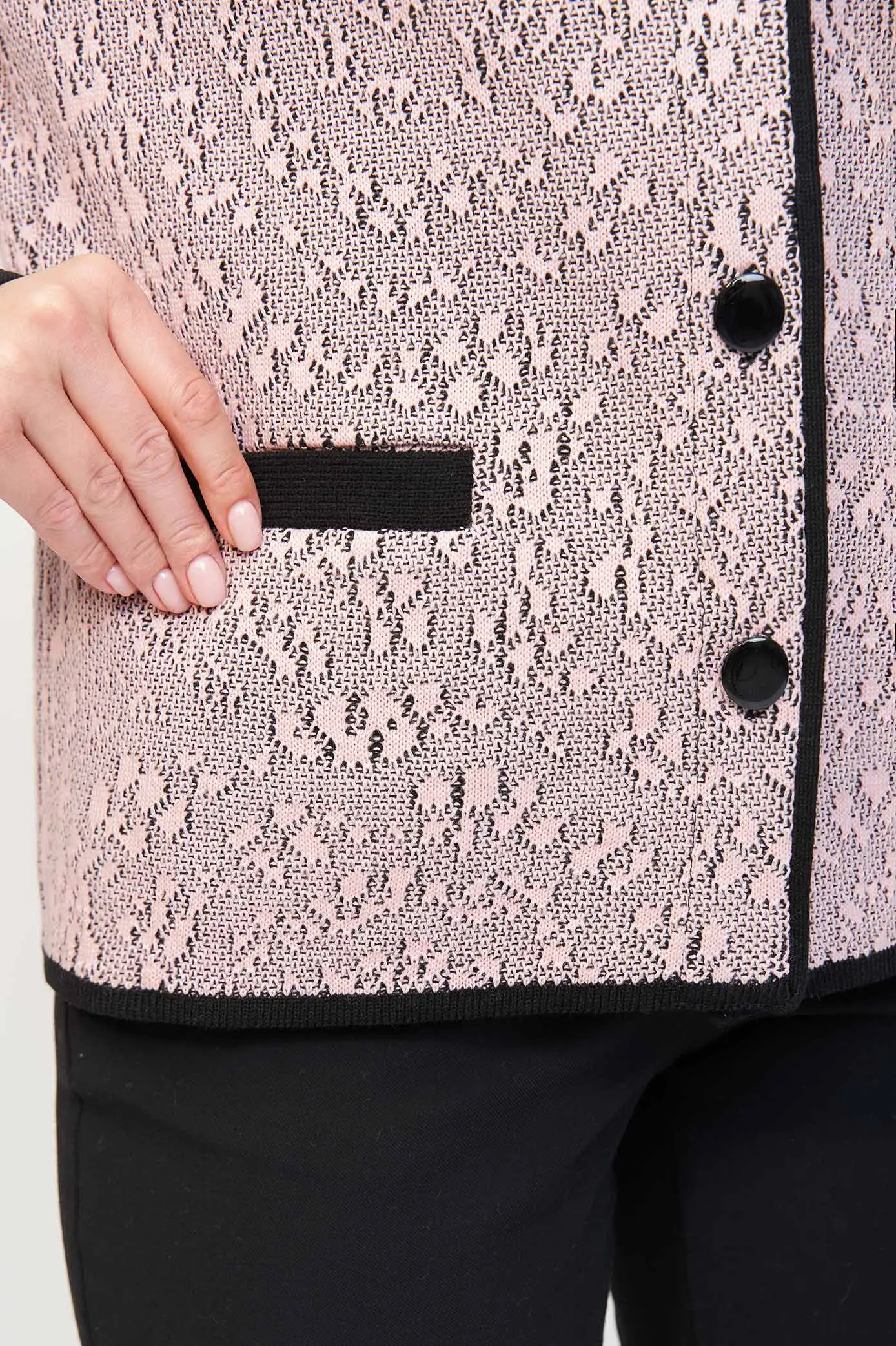 Женский вязаный жакет полуприлегающего силуэта на пуговицах. Трикотажный пиджак выполнен из высококачественной пряжи с составом 30% хлопок 70% ПАН. Теплая кофта на пуговицах имеет круглую горловину без воротника, рукава втачные длинные. Длина изделия 62 см, длина рукава 61 см. В трикотажном жакете предусмотрены функциональные прорезные карманы. Вязаный пиджак выполнен жаккардовым переплетением, образующим мерцающий орнамент. Горловина, низ рукавов, низ изделия и вход в карманы обработаны бейкой контрастного цвета. Нарядный жакет украшен элегантным узором из трикотажных шнуров и натурального меха кролика. Эффектный пиджак полуприлегающего силуэта подойдет для любого типа фигуры и составит модный, праздничный образ с любым низом: брюки, джинсы, юбка. черно-розовый