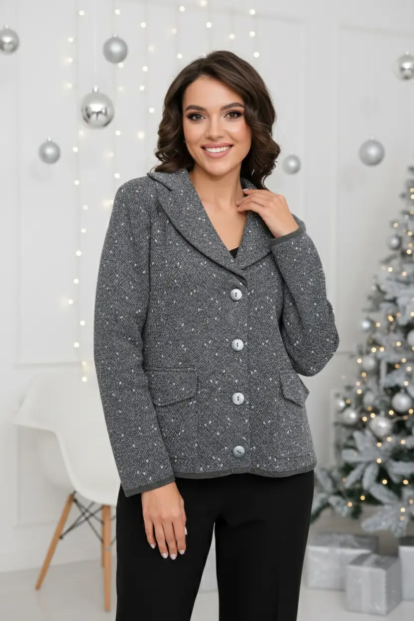 Женский вязаный жакет прямого  силуэта с V-образным вырезом, английским воротником. Рукав втачной длинный. Застёжка на пуговицы. Два накладных кармана с клапаном. Изделие выполнено жаккардовым переплетением. Жакет подойдет для работы в офис и деловых встреч, в нем Вы будете выглядеть модно, но при этом лаконично и сдержанно.