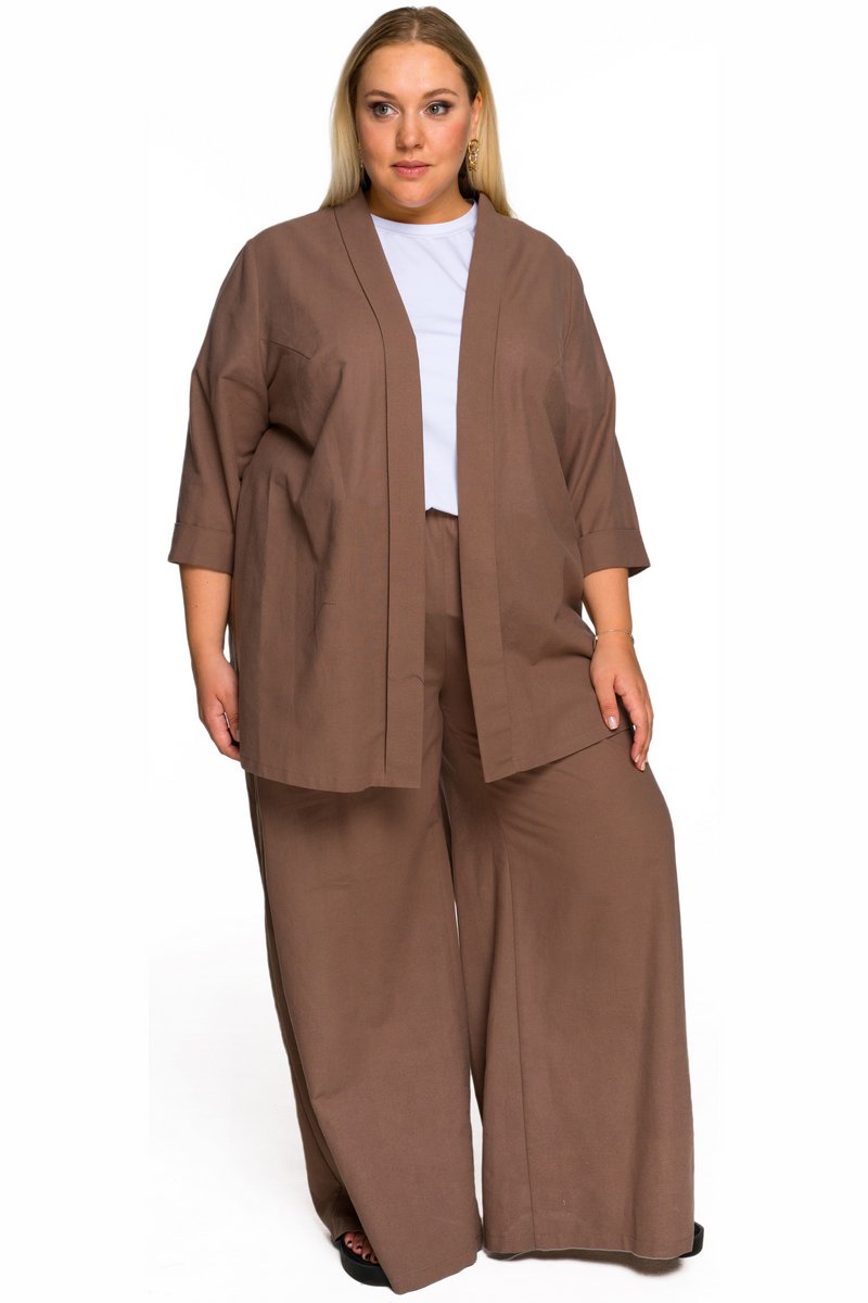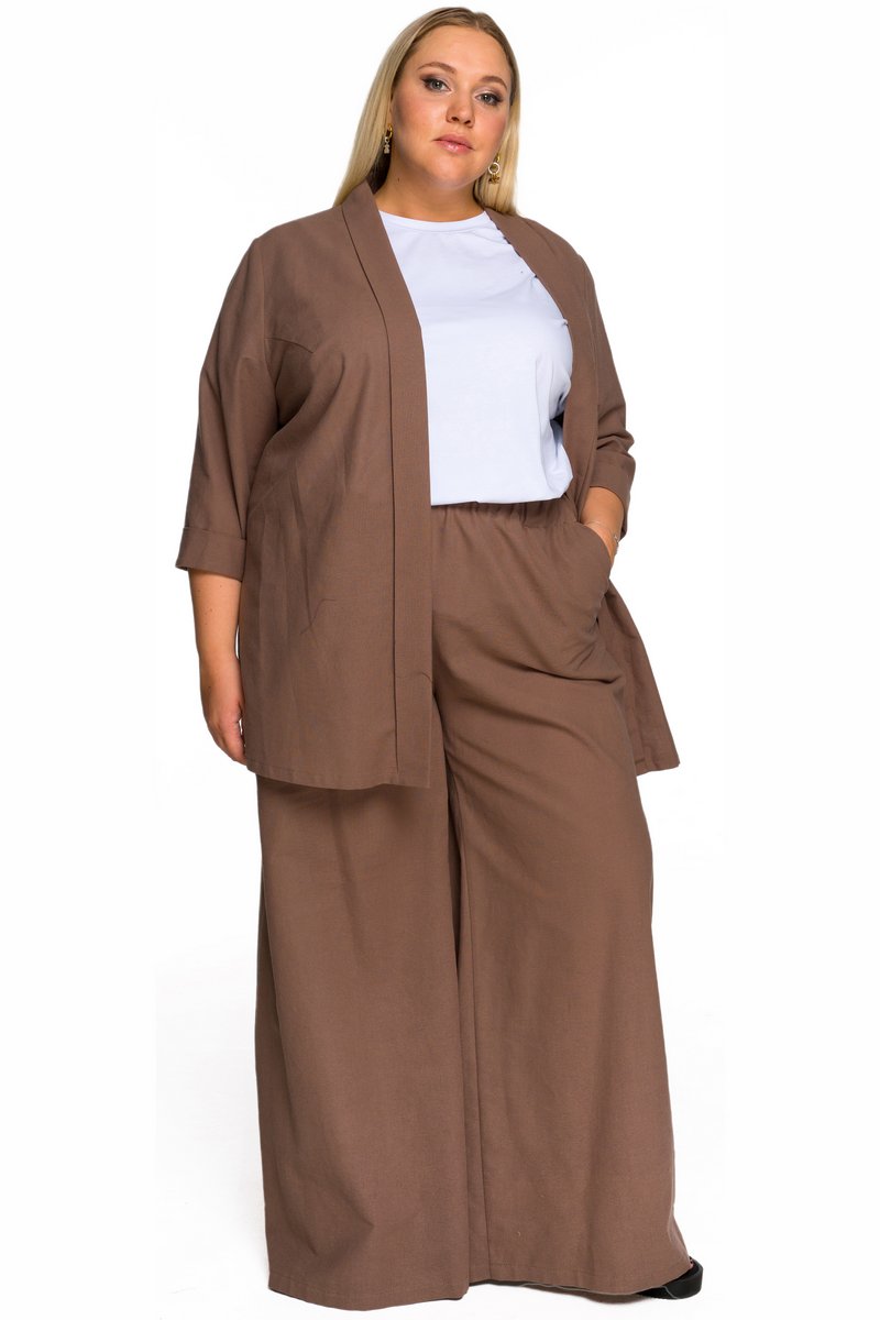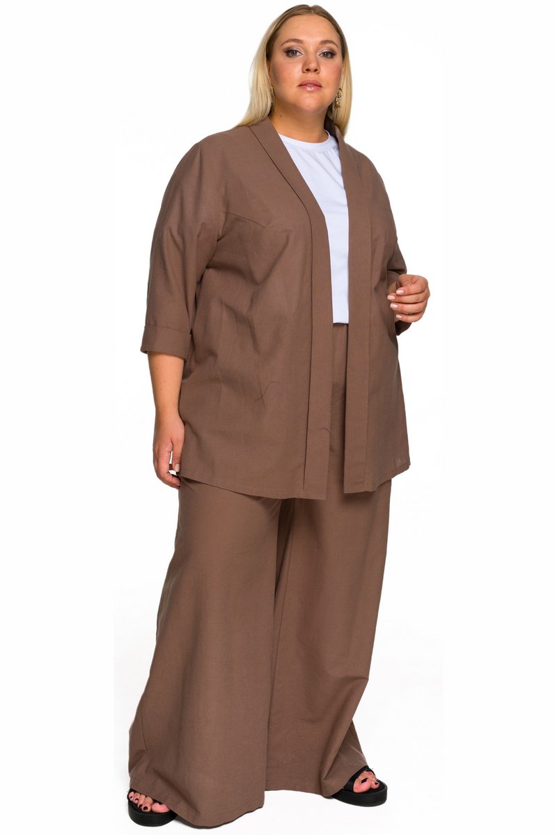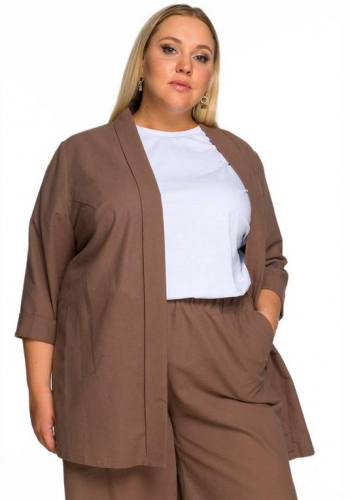 Жакет прямого силуэта из смесовой ткани, содержащей в составе лен и вискозу.. По бортам и низу рукавов притачные отвороты.