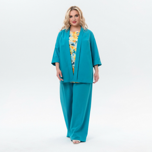 Жакет прямого силуэта из плательно-костюмной ткани. По бортам и низу рукавов притачные отвороты.