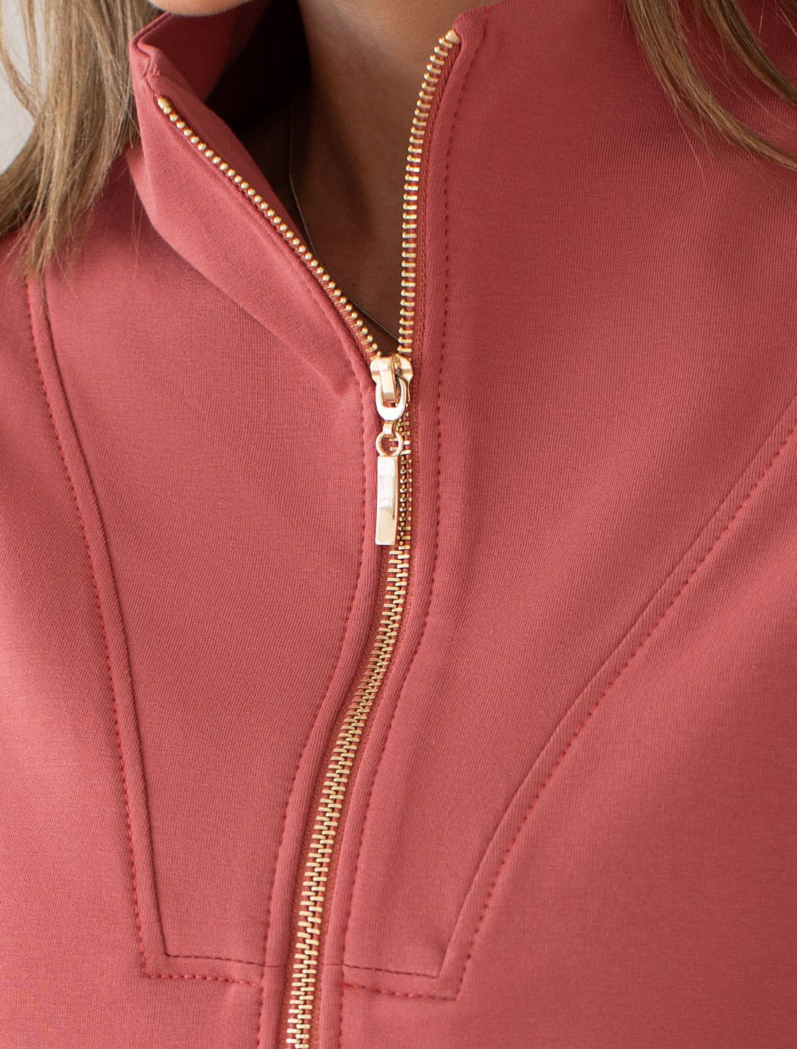 Жакет выполнен из футера двухнитки с эластаном. Модель без карманов с воротом стойка и застежкой на молнию золотистого цвета. Эластичный материал гарантирует комфорт и формоустойчивость. Сочетается в костюме с брюками D44.138, D44.139, D44.140 и шортами D48.008. Изделие дополнено металлическим логотипом бренда. терракота