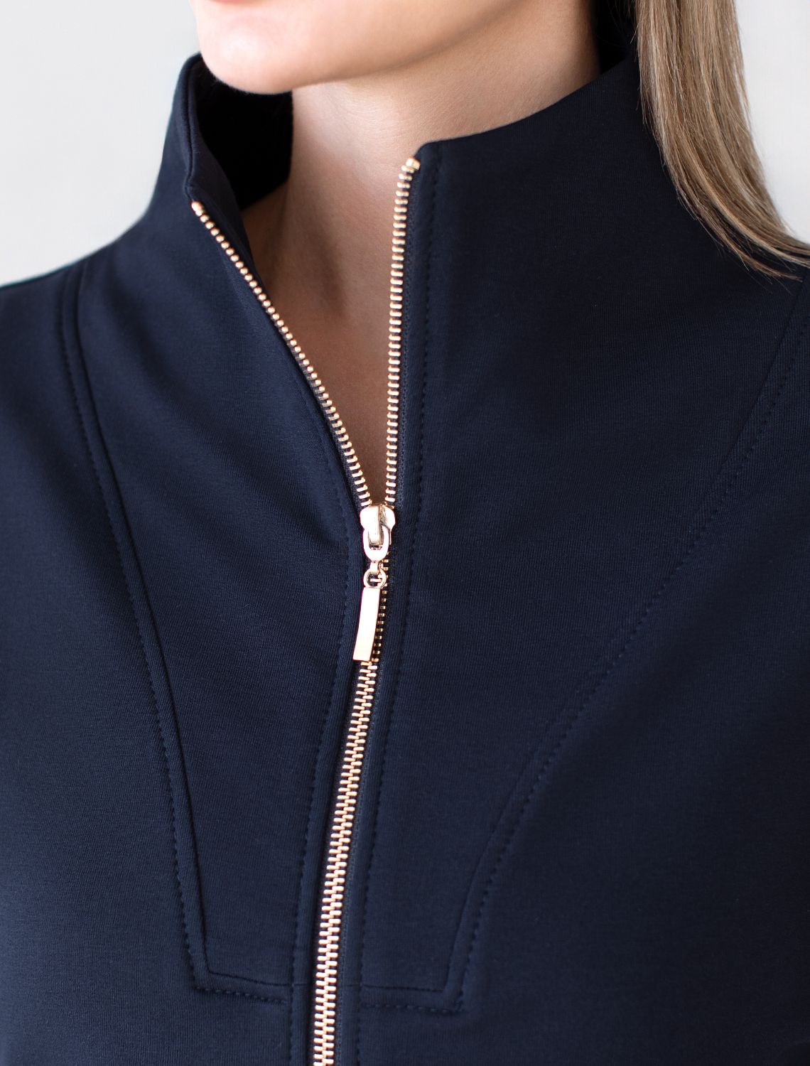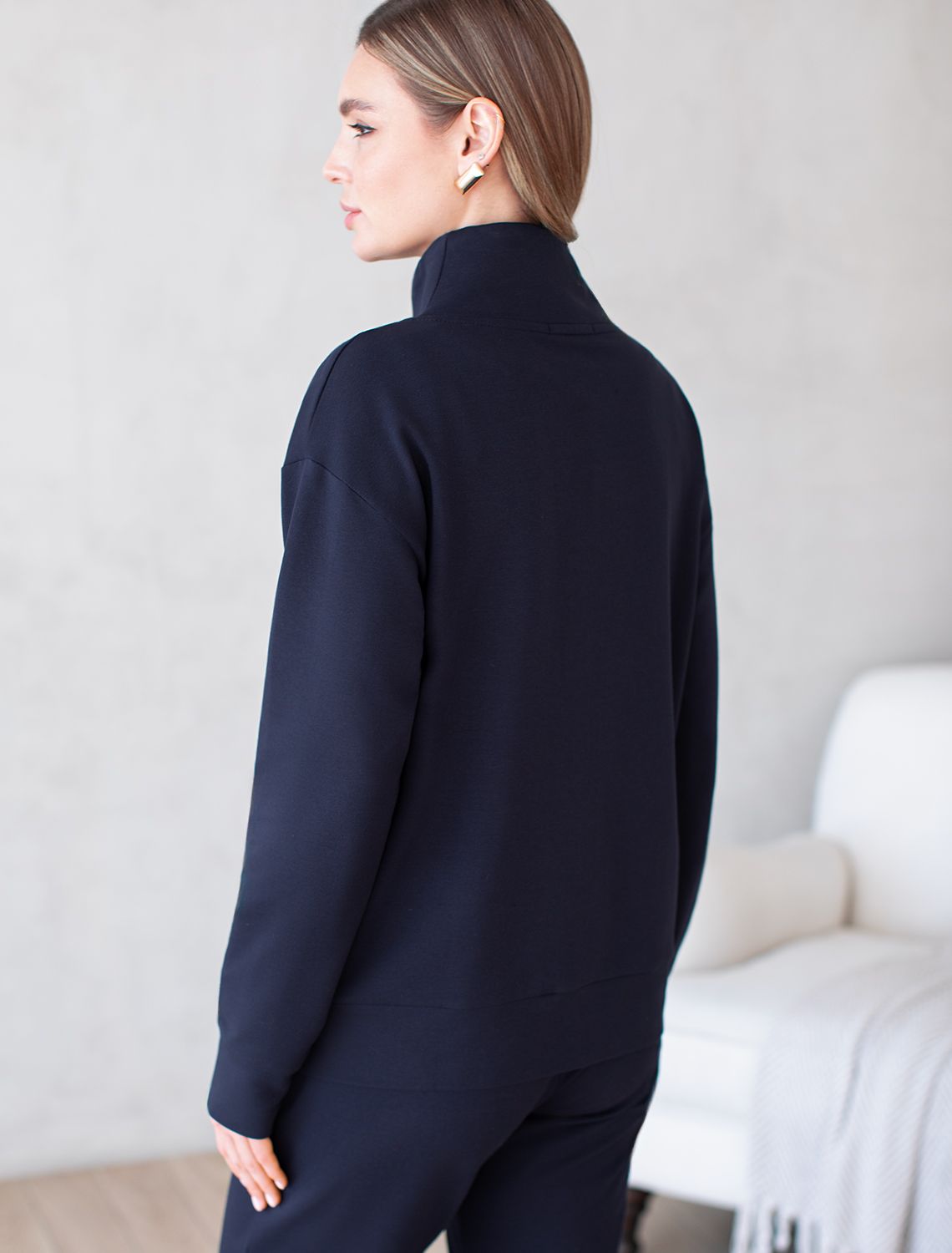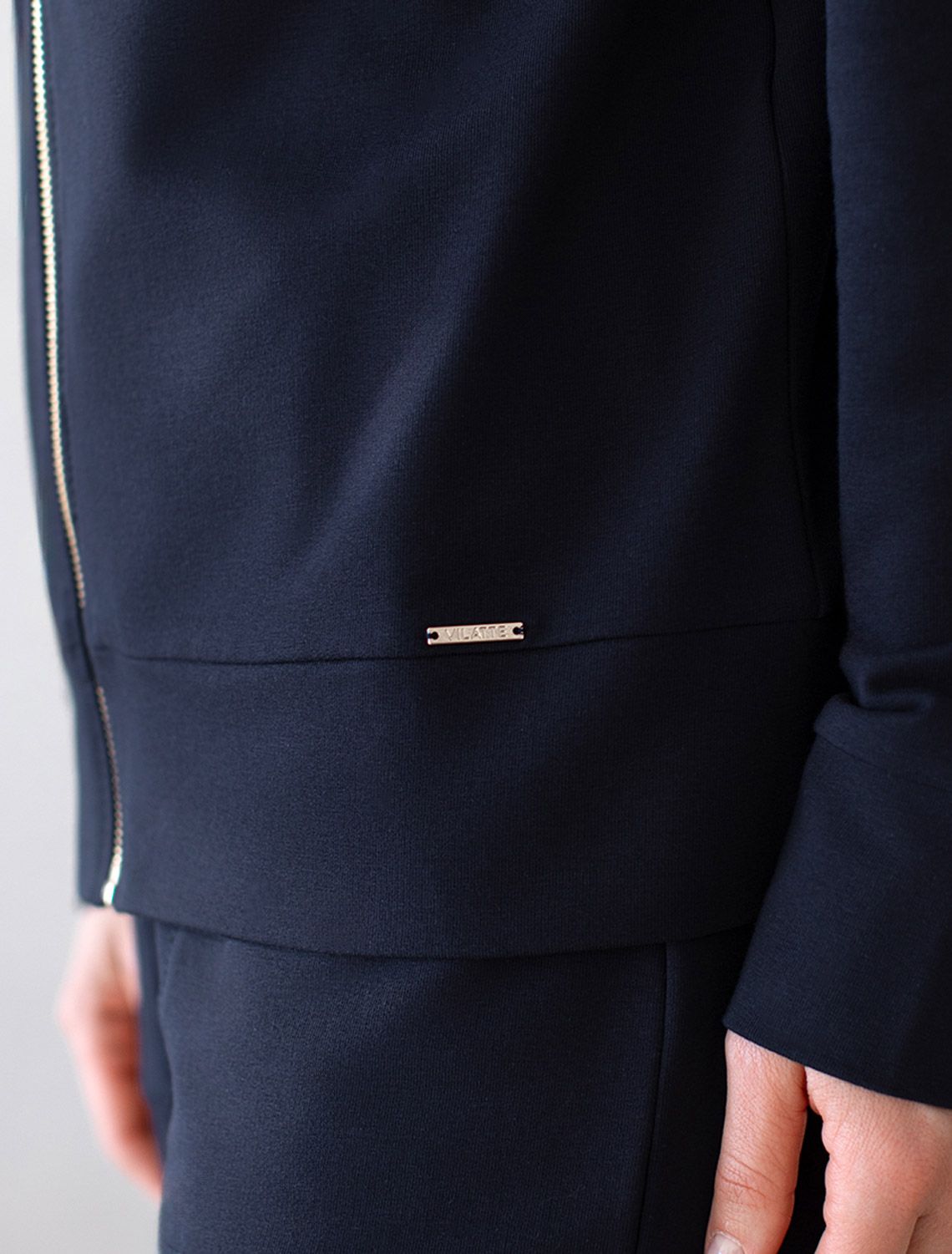 Жакет выполнен из футера двухнитки с эластаном. Модель без карманов с воротом стойка и застежкой на молнию золотистого цвета. Эластичный материал гарантирует комфорт и формоустойчивость. Сочетается в костюме с брюками D44.138, D44.139, D44.140 и шортами D48.008. Изделие дополнено металлическим логотипом бренда. т.синий