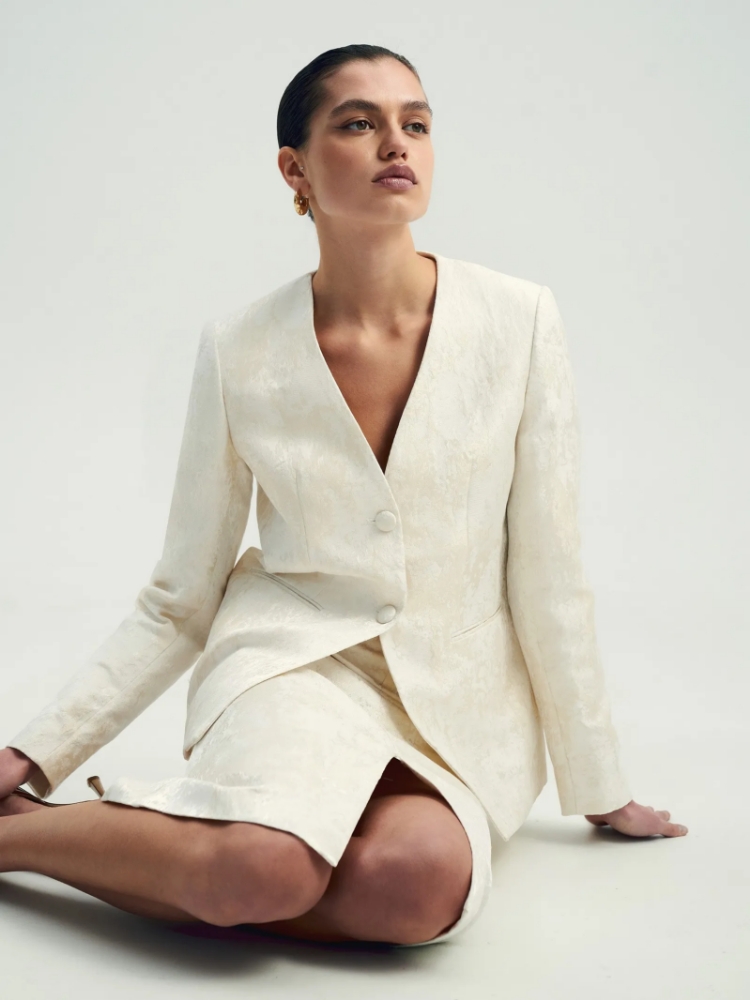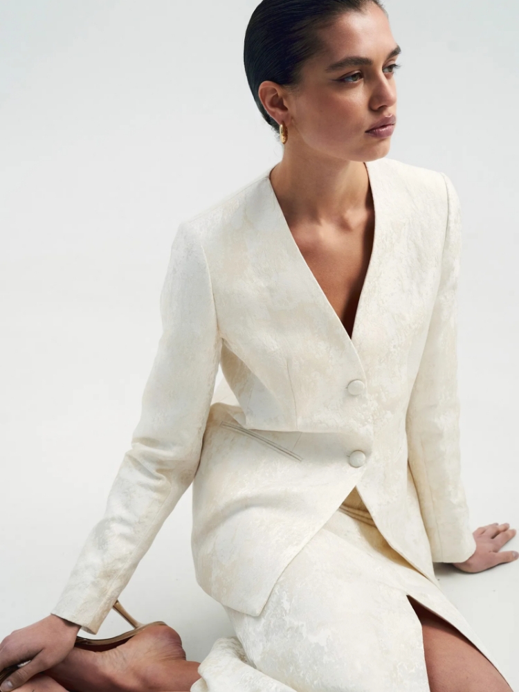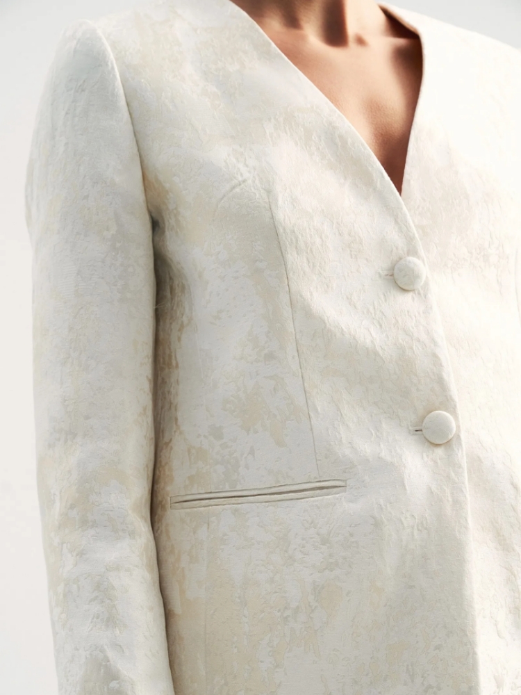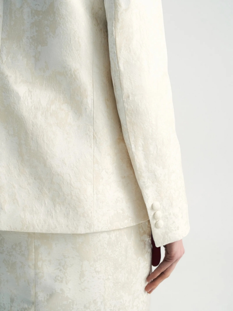 Идеальный жакет для торжественных случаев или для того, чтобы создать себе ощущение праздника каждый день. Сделан из роскошного двухтонного жаккарда — кремовый узор на сливочном фоне. Сочетание двух оттенков молочного цвета создаёт дорогой и изысканный образ. Материал наполовину состоит из натурального хлопка. Дополняет жаккард гладкая молочная подкладка с высоким содержанием вискозы. Прямой жакет можно приталить поясом, который идёт в комплекте. Элегантная модель без лацканов имеет V-вырез, тонкие карманы с листочками и две обтянутые тканью пуговицы. Смотрится свежо и утончённо. Завершить образ с жакетом можно юбкой из комплекта