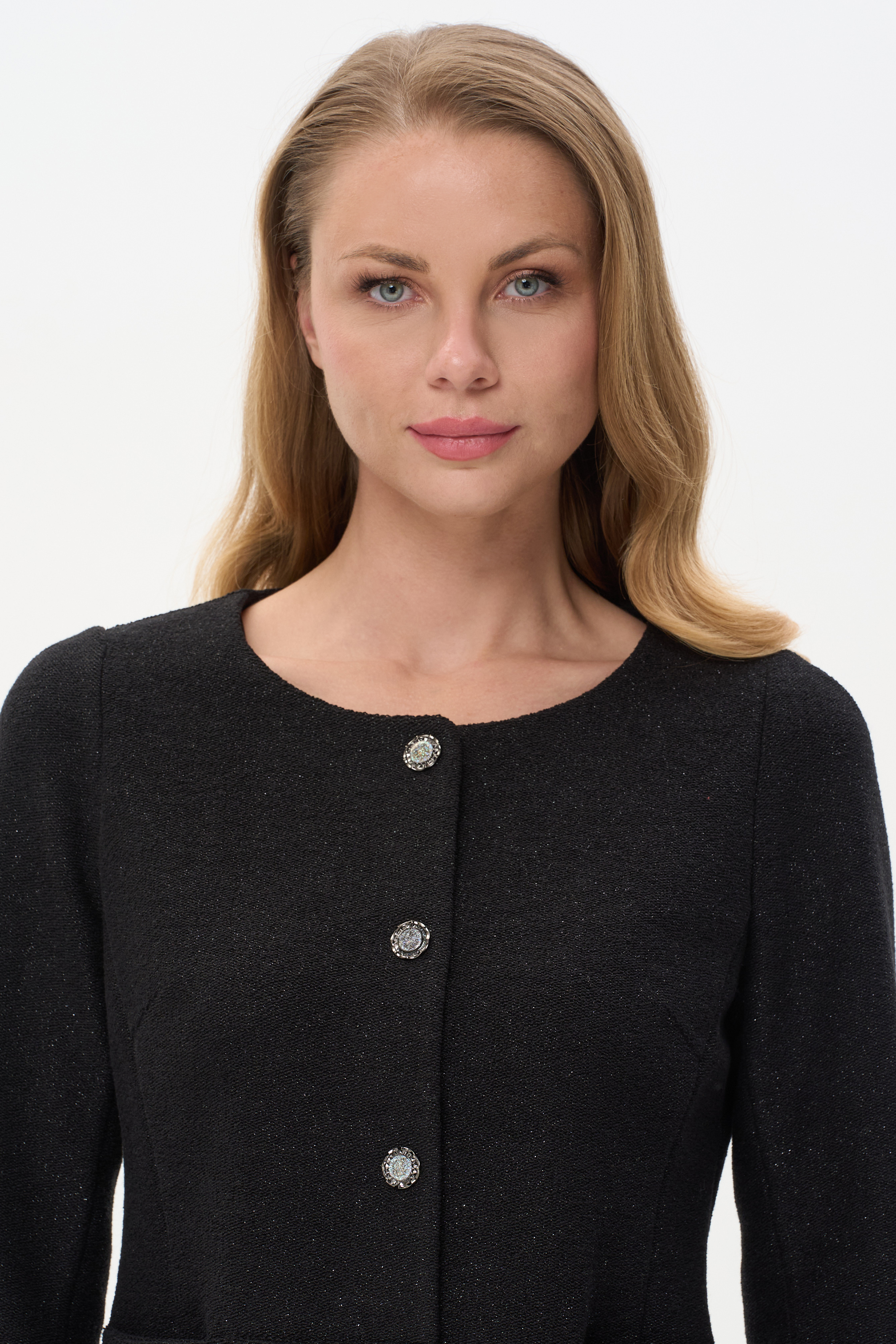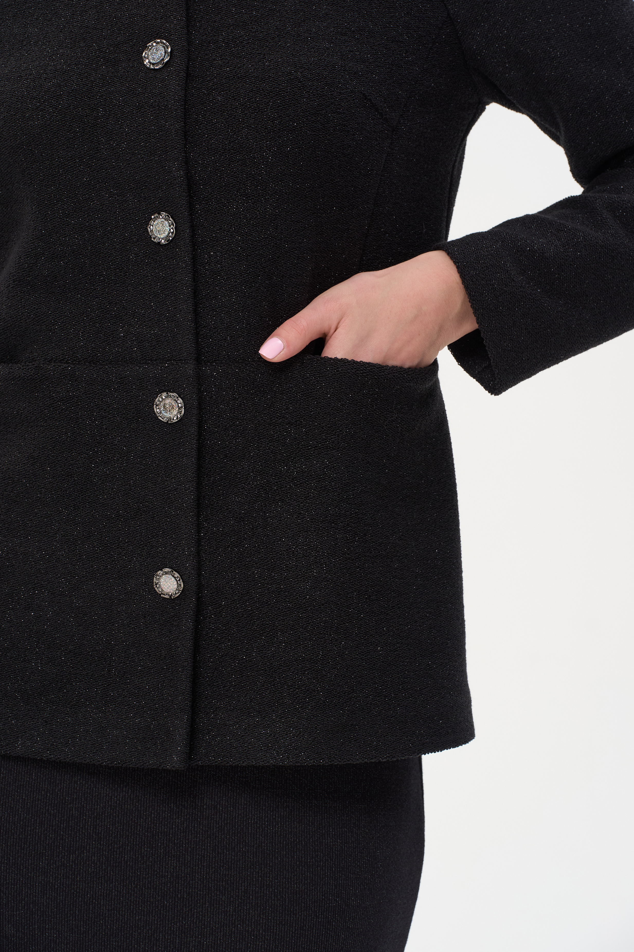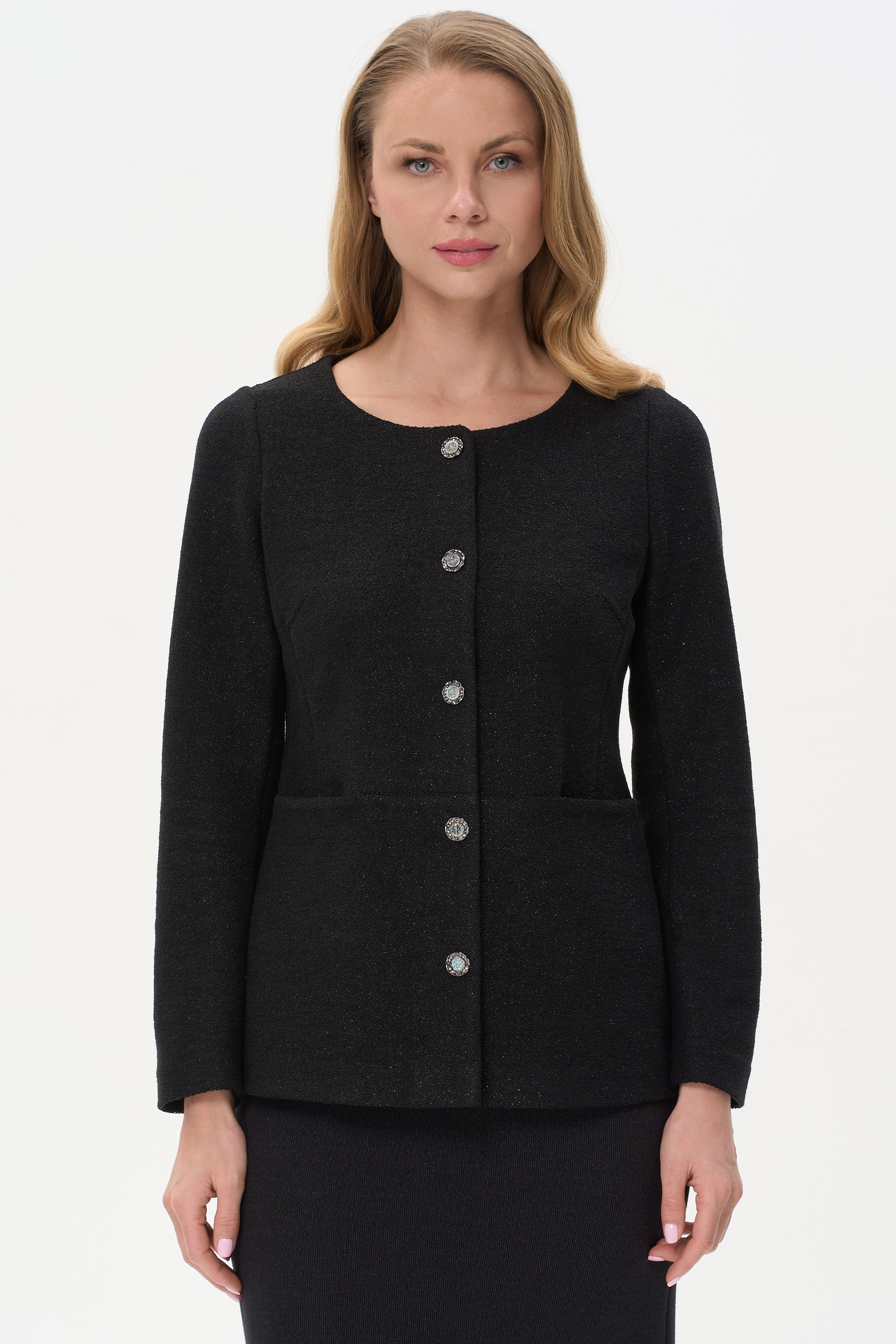 Элегантный жакет в стиле Chanel из трикотажного полотна с люрексом по лицевой стороне и гладкой изнаночной. Акцентный глубокий вырез позволяет открыть шею и подчеркнуть её красивыми украшениями. Выделяют жакет нарядные кнопки. Конструктивные линии и шов по спинке стройнит фигуру. Рост модели 175 см