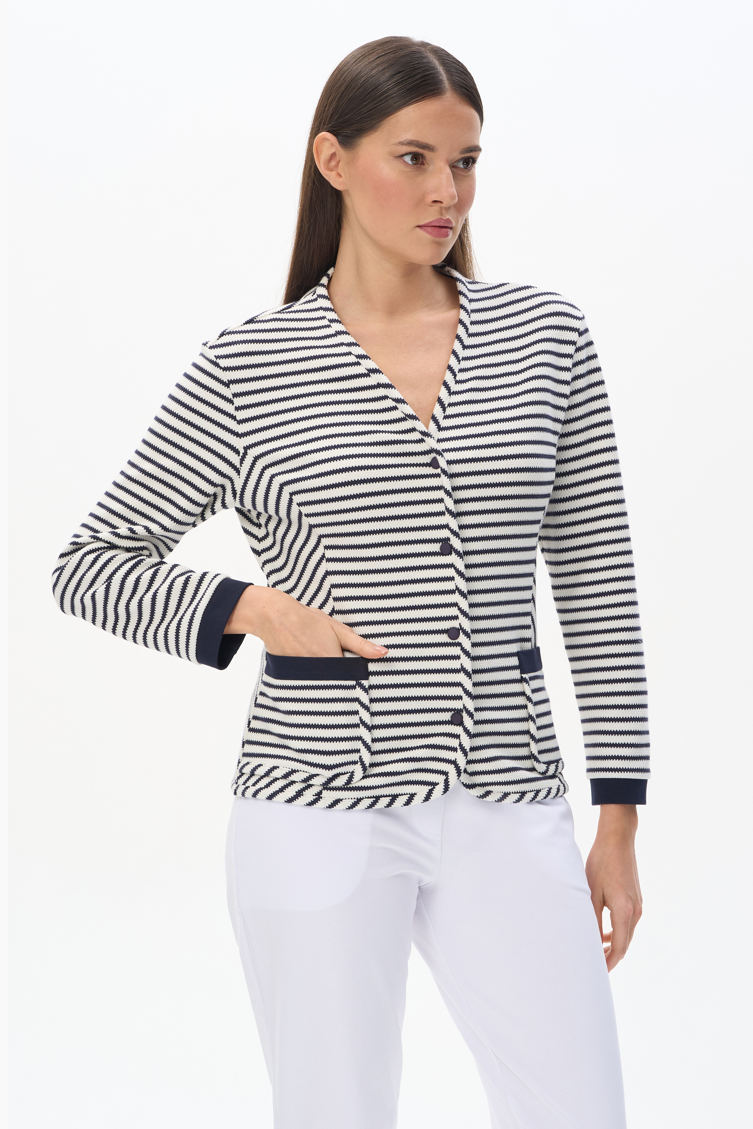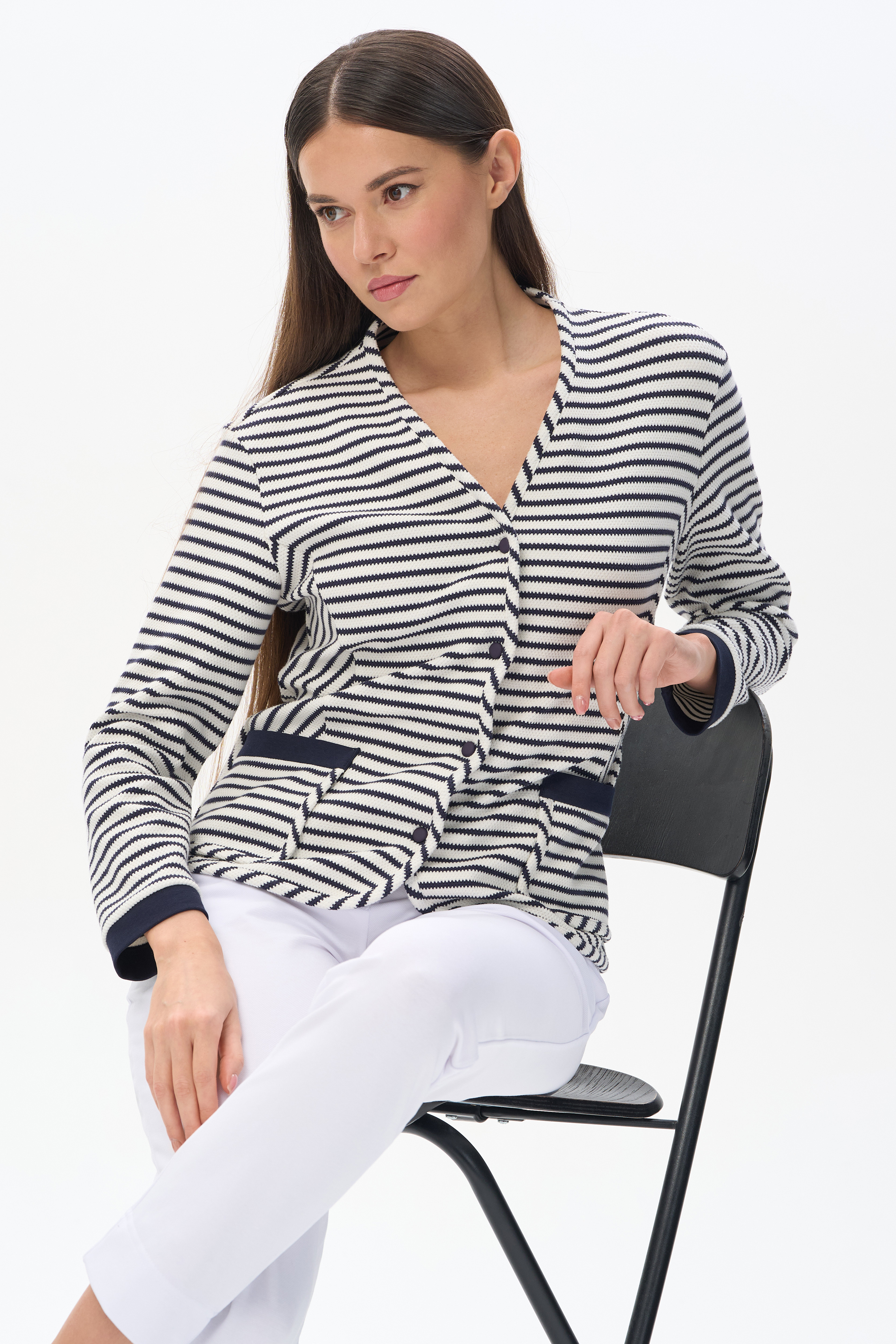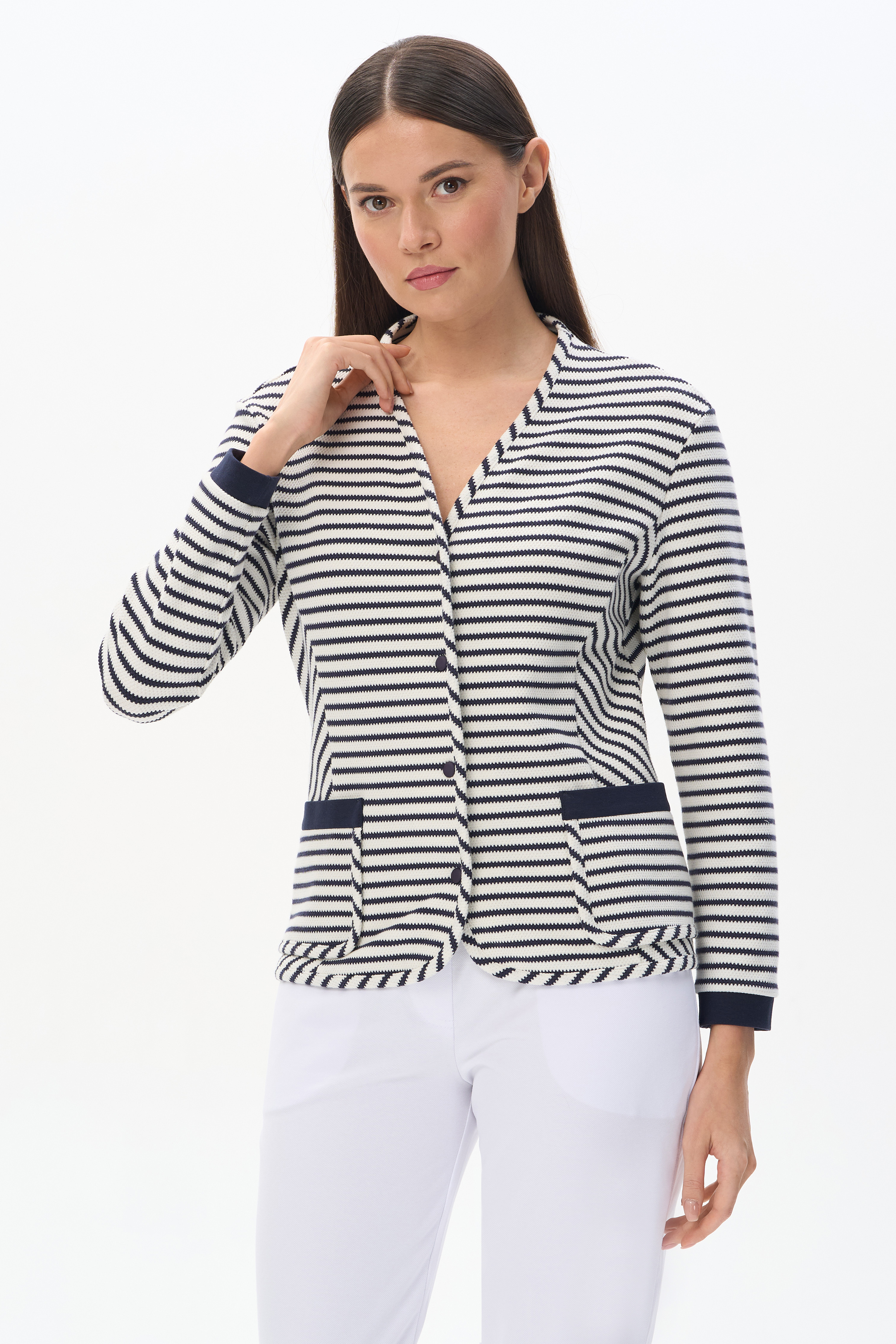 75% хлопок, 25% полиэстер Жакет из хлопкового жаккарда в бело-синюю фактурную полоску 280 гр. Благодаря своим пластичным свойства это полотно идеально для этой приталенной модели. Жакет на кнопках, с рельефами и накладными карманами. Красивый V-образный вырез, длинные рукава. Край карманов и манжеты - из контрастной рибаны. Комфортная, приятная модель для создания современных образов. Комбинируется со всеми моделями коллекции. Рост модели 175 см.