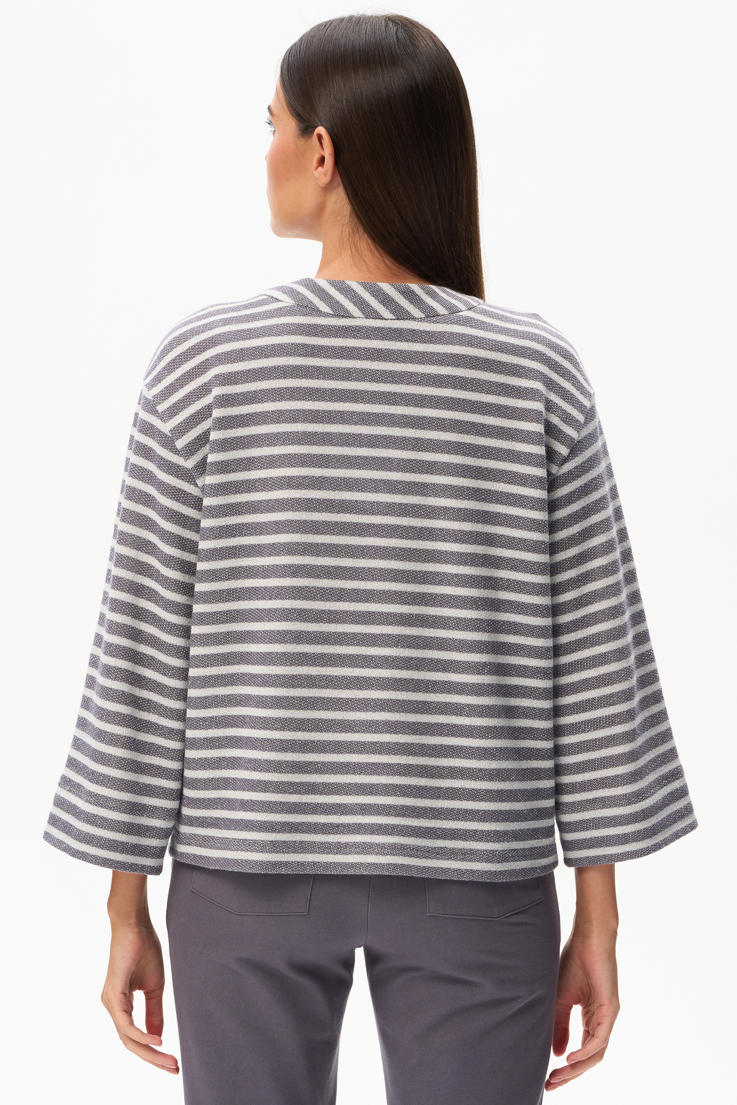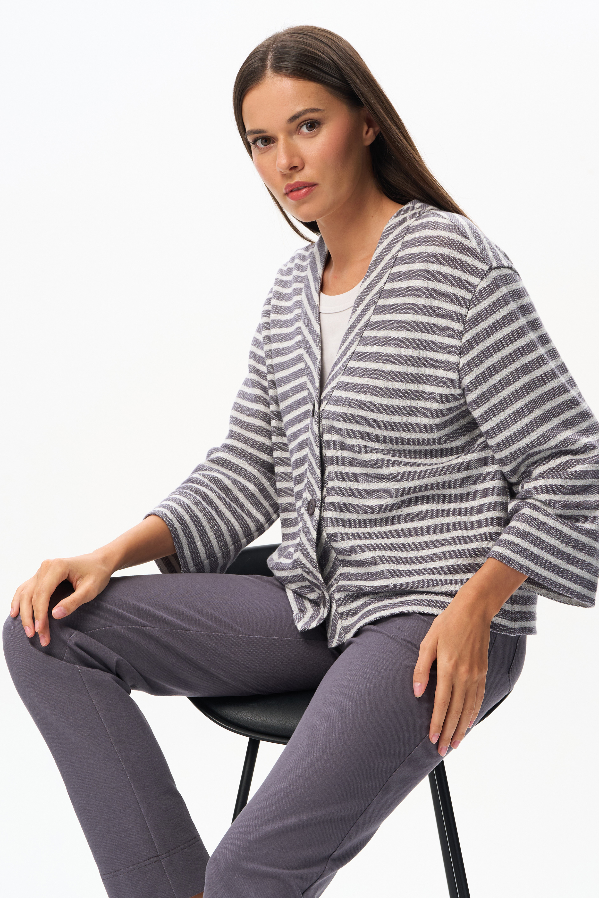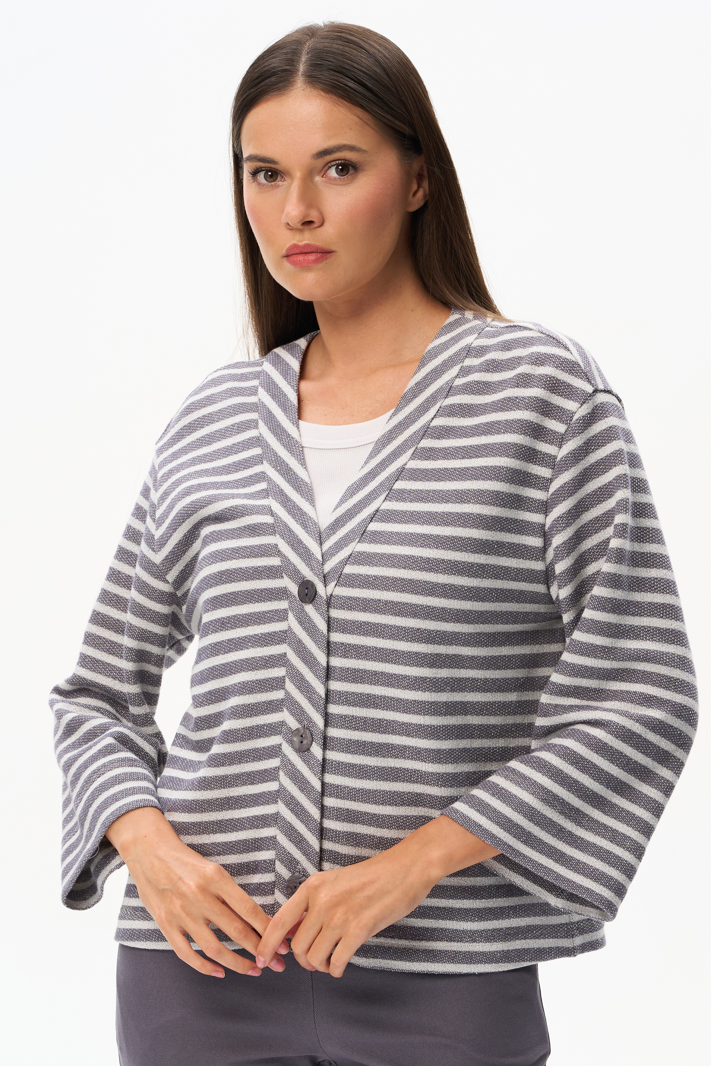 75% хлопок/ 22% полиэстер/ 3% люрекс Классической кардиган из фактурного жаккарда в полоску в оттенках коллекции 200 гр. Планка с застежкой на пуговицы, рукава укороченные, с заниженной проймой. Серебристый люрекс в составе полотна придает эксклюзивный вид изделию. Рост модели 175 см.