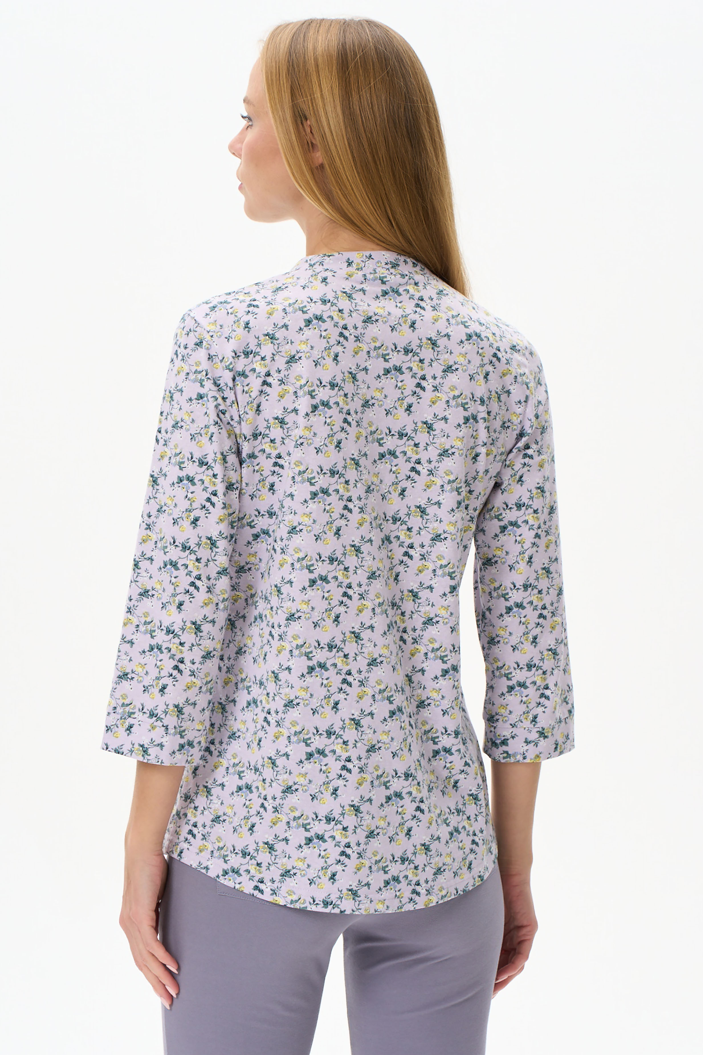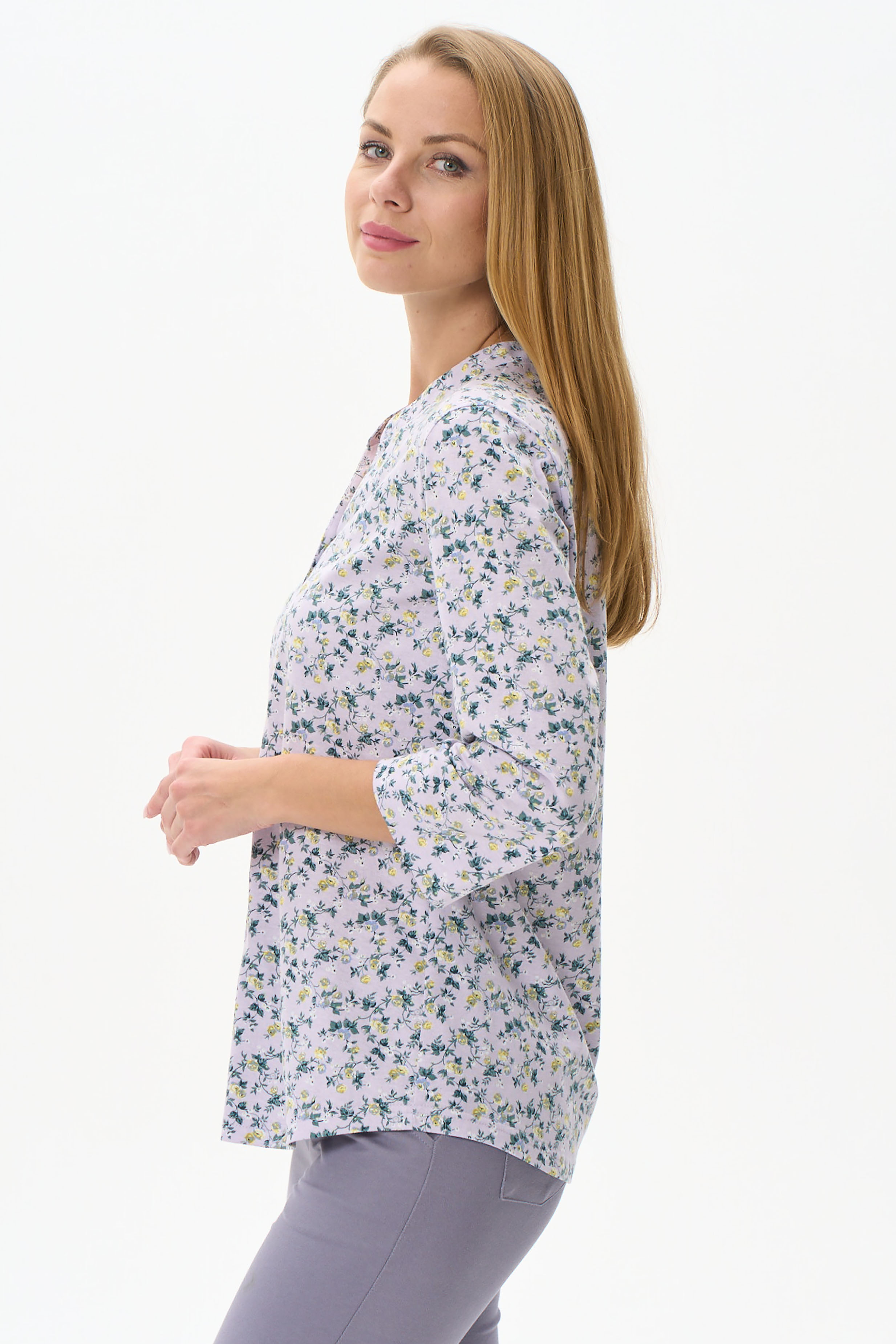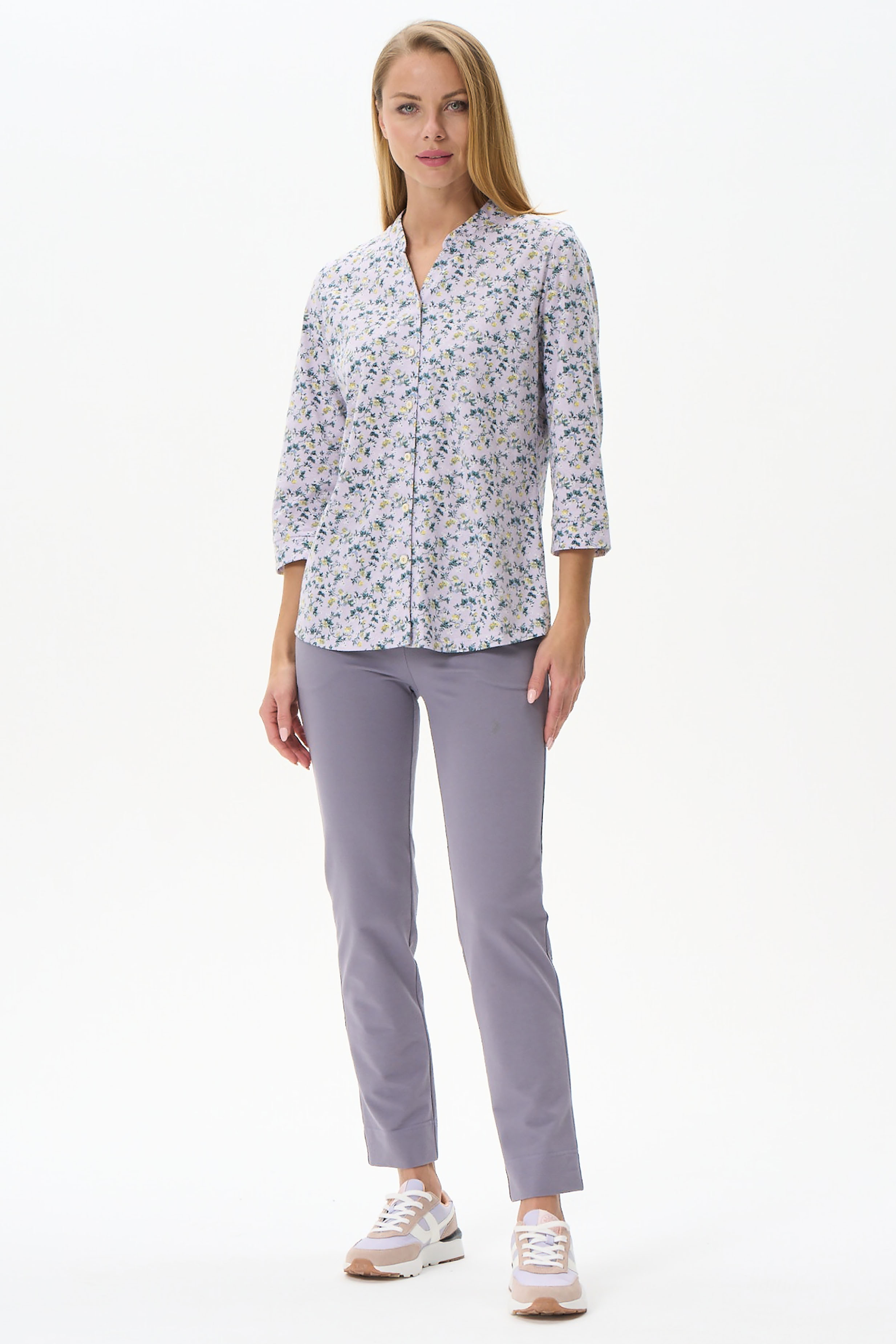 100% хлопок Блузка прямого силуэта из хлопкового полотна. Воротник стойка, переходящий в планку, застежка на пуговицы. Втачной рукав 7/8. Рост модели 175 см.
