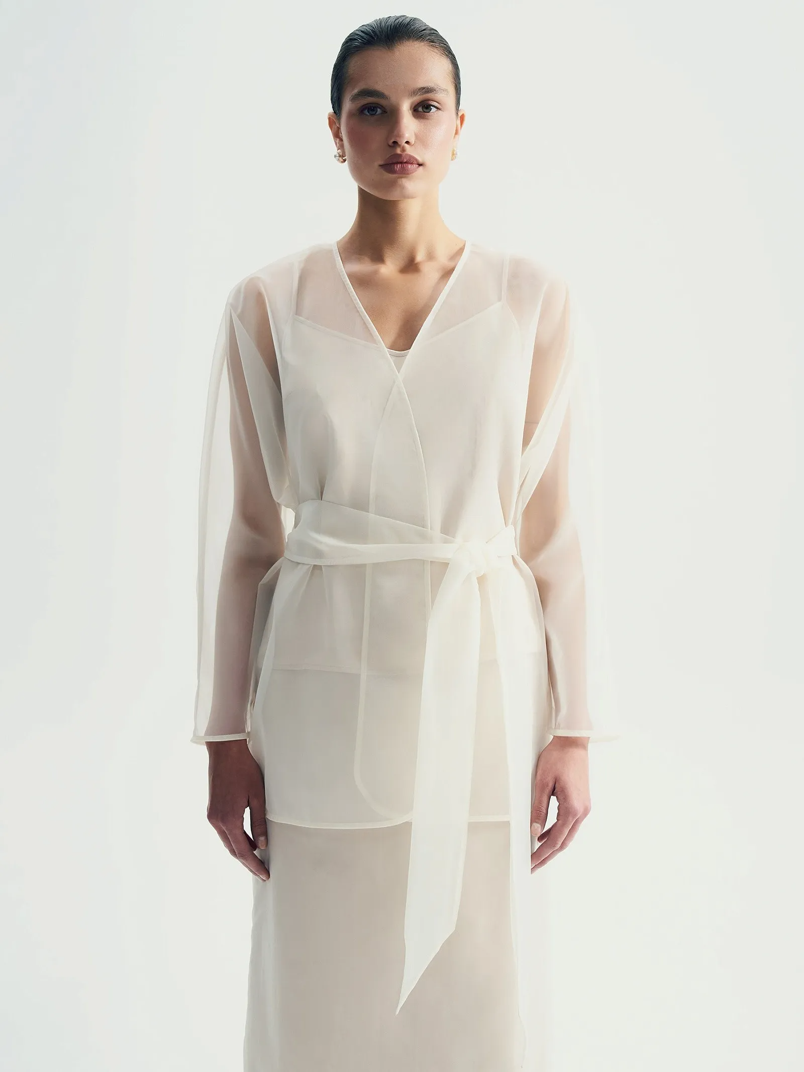Кимоно в молочном цвете из слегка "хрустящей" плотной органзы подойдёт к празднику и не только. Дополнено широким поясом. Кимоно идёт без топа в комплекте, но подойдёт к любому топу в вашем гардеробе.