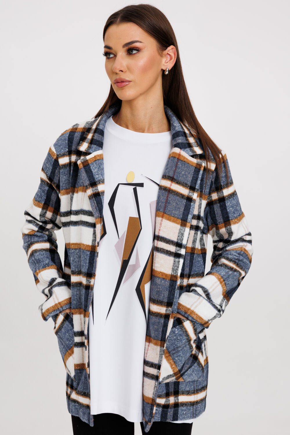 Представляем вам элегантный жакет из фланели, который станет незаменимой частью вашего гардероба. Этот жакет с отложным воротником и накладными карманами сочетает в себе классический стиль и современную функциональность.