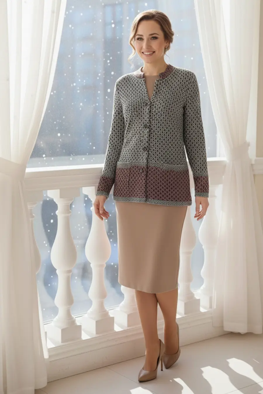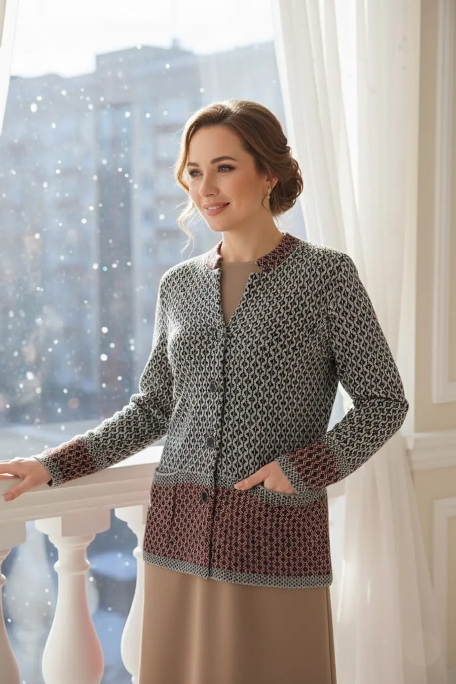 Женский трикотажный жакет полуприлегающего силуэта. Рукава втачные длинные. Жакет застегивается на пуговицы, горловина круглая, с небольшим воротником-стойкой. Два накладных кармана квадратной формы.  Изделие выполнено жаккардовым переплетние образующим геометрический рисунок "мелкие ромбы" терракот