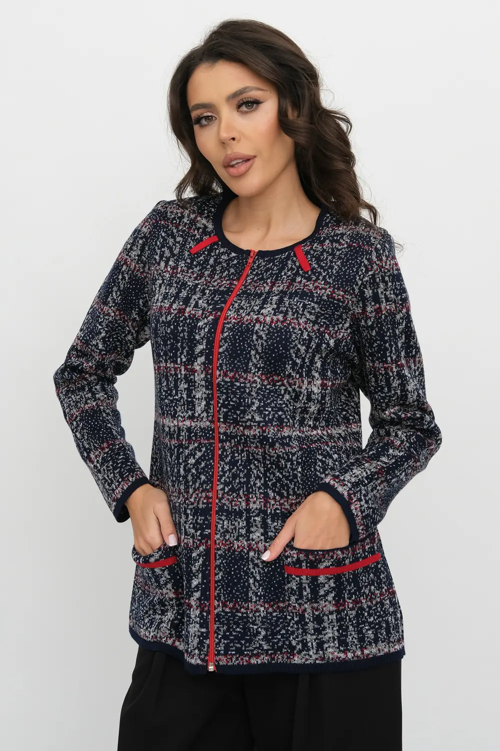 Женский жакет на молнии полуприлегающего силуэта. Горловина круглая обработана контрастной бейкой. Длинный втачной рукав, накладные карманы. Жакет выполнен жаккардовым переплетением с классическим узором клетка с добавлением акцентных красных деталей.  Жакет очень комфортный, прекрасно садится на любой тип фигуры. Отличный как повседневный. так и деловой вариант. синий