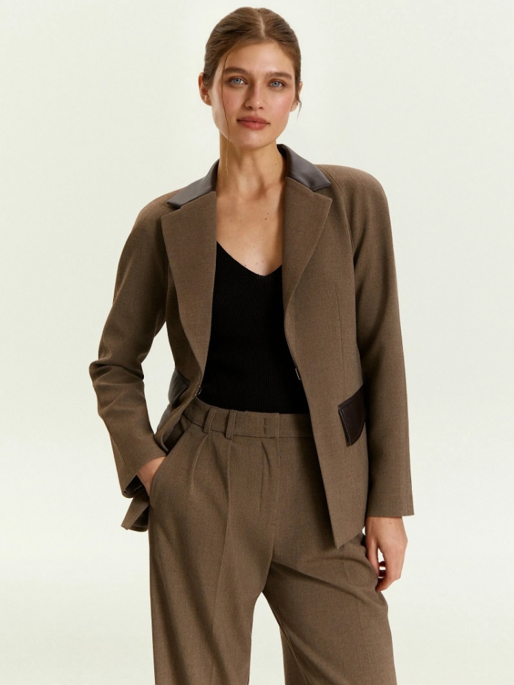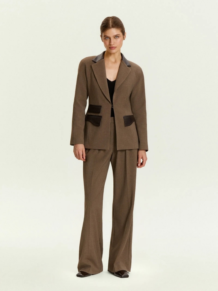 Оригинальный жакет для разнообразных и трендовых образов на каждый день. Приталенный жакет с широкими лацканами дополнен кожаными накладками-клапанами: прямоугольными и фигурными. Модель застёгивается на удобный крючок.Изделие выполнено на подкладке с высоким содержанием вискозы