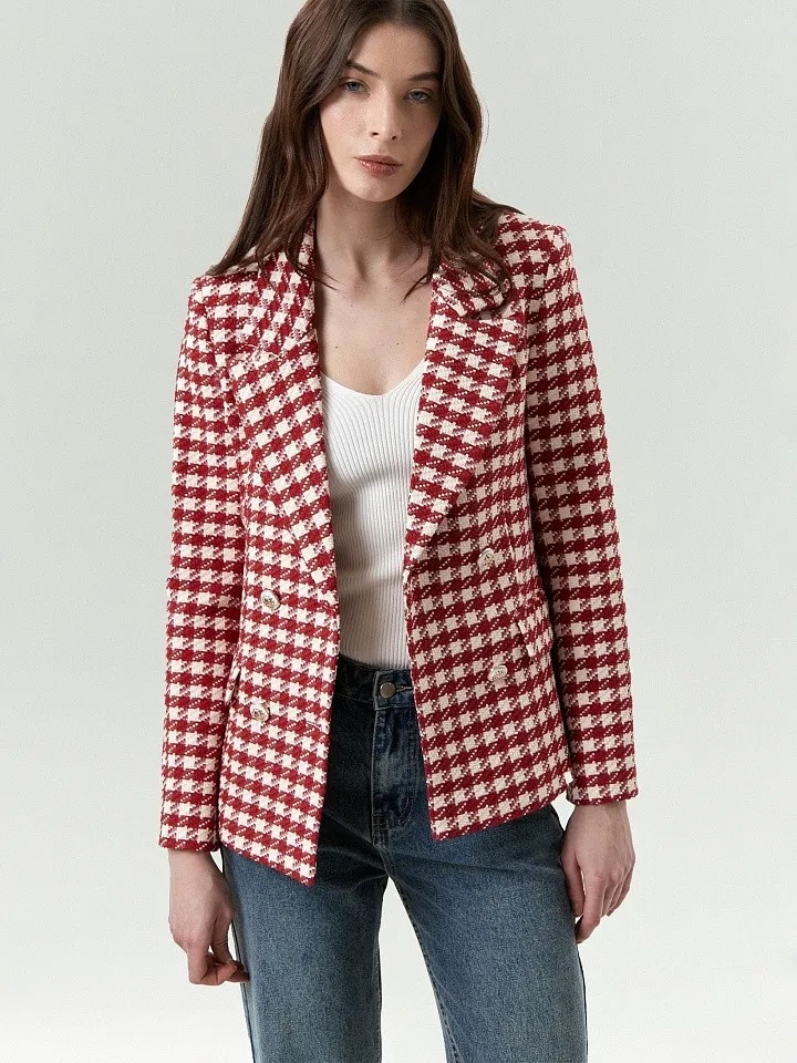 Яркий жакет в гусиную лапку из хлопкового твида поможет создавать запоминающиеся образы даже в рамках дресс-кода. Нарядное сочетание красного и белого, нарядные пуговицы с эмалью и чеканкой в золотом цвете создают настроение. Двубортная удлинённая модель заметно приталена. Жакет отлично сочетается с любыми базовыми брюками и джинсами. Материал почти полностью состоит из хлопка, что делает вещь комфортной на любой сезон; имеется подкладка с вискозой