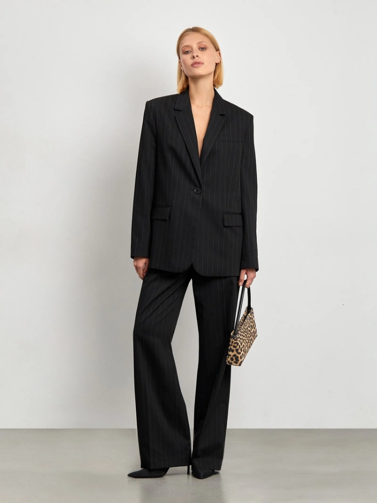 Чёрный жакет в полоску для повседневных и деловых образов. Удлинённая модель с увеличенными плечами имеет прямой крой и скруглённые борта. Дополнена английским воротником и карманами с клапанами по бокам, а также фальш-карманом с листочкой на груди. Застёгивается на одну пуговицу чуть ниже уровня талии. Сзади имеется шлица. Завершить образ можно водолазкой или топом и брюками из комплекта