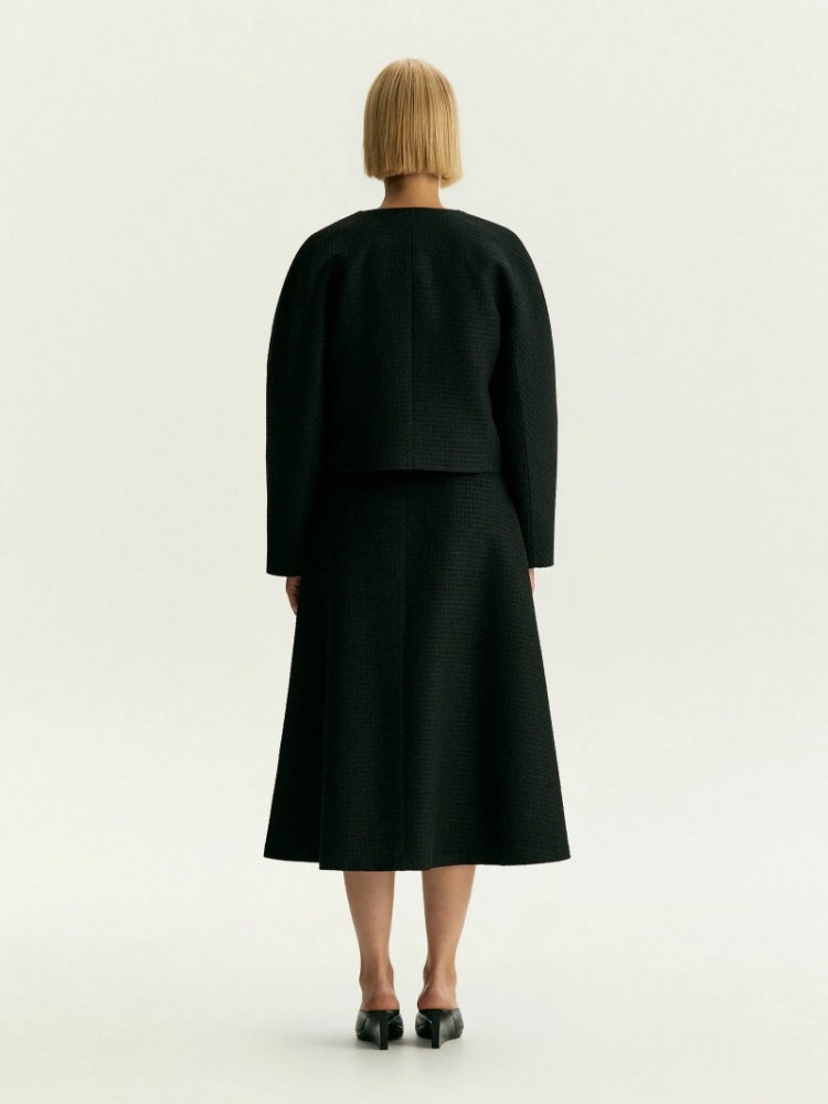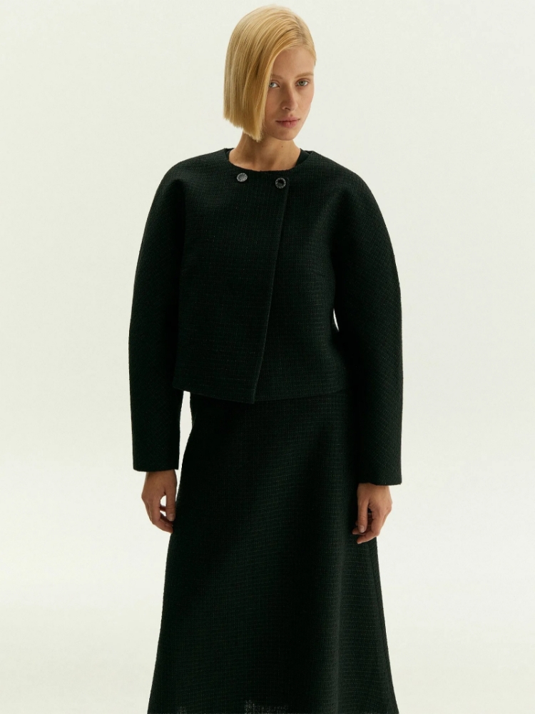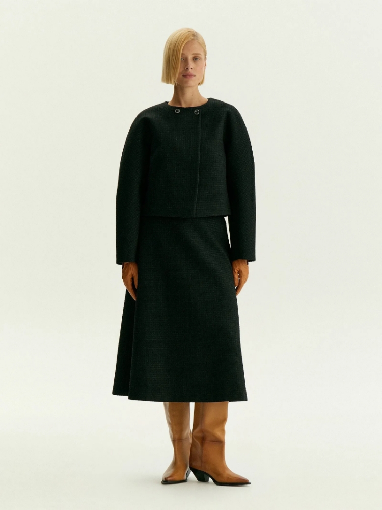 Оригинальный жакет-накидка О-силуэта с двумя пуговицами у горла отлично подойдёт к любому особому случаю. Акцентные пуговицы в виде двойных лавровых венков с эмалевыми вставками чёрного цвета добавляют нарядности. Плотный твид с содержанием хлопка и эластана слегка поблёскивает за счёт вкраплений чёрного люрекса. Материал не колется, даёт интересные тактильные ощущения и стильно смотрится. Жакет выполнен на подкладке с высоким содержанием вискозы. Завершить образ с жакетом можно юбкой из комплекта, а также любыми базовыми брюками или джинсами