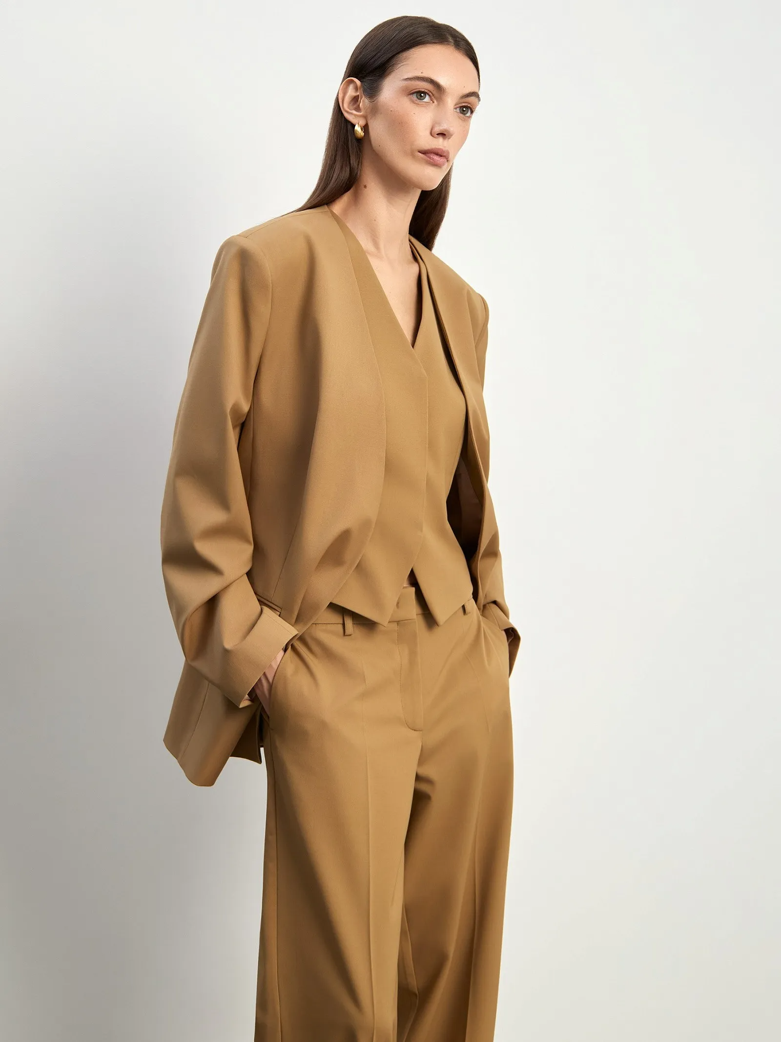 Модный жакет без лацканов с потайными пуговицами. Плотный материал в бежевом цвете почти наполовину состоит из шерсти. Удлинённая модель имеет прямой крой, расширенную линию плеч и скруглённые углы бортов. Дополнена карманами с клапанами. Завершить образ можно элегантными брюками или юбкой, а также жакетом из комплекта. Изделие изготовлено на подкладке.