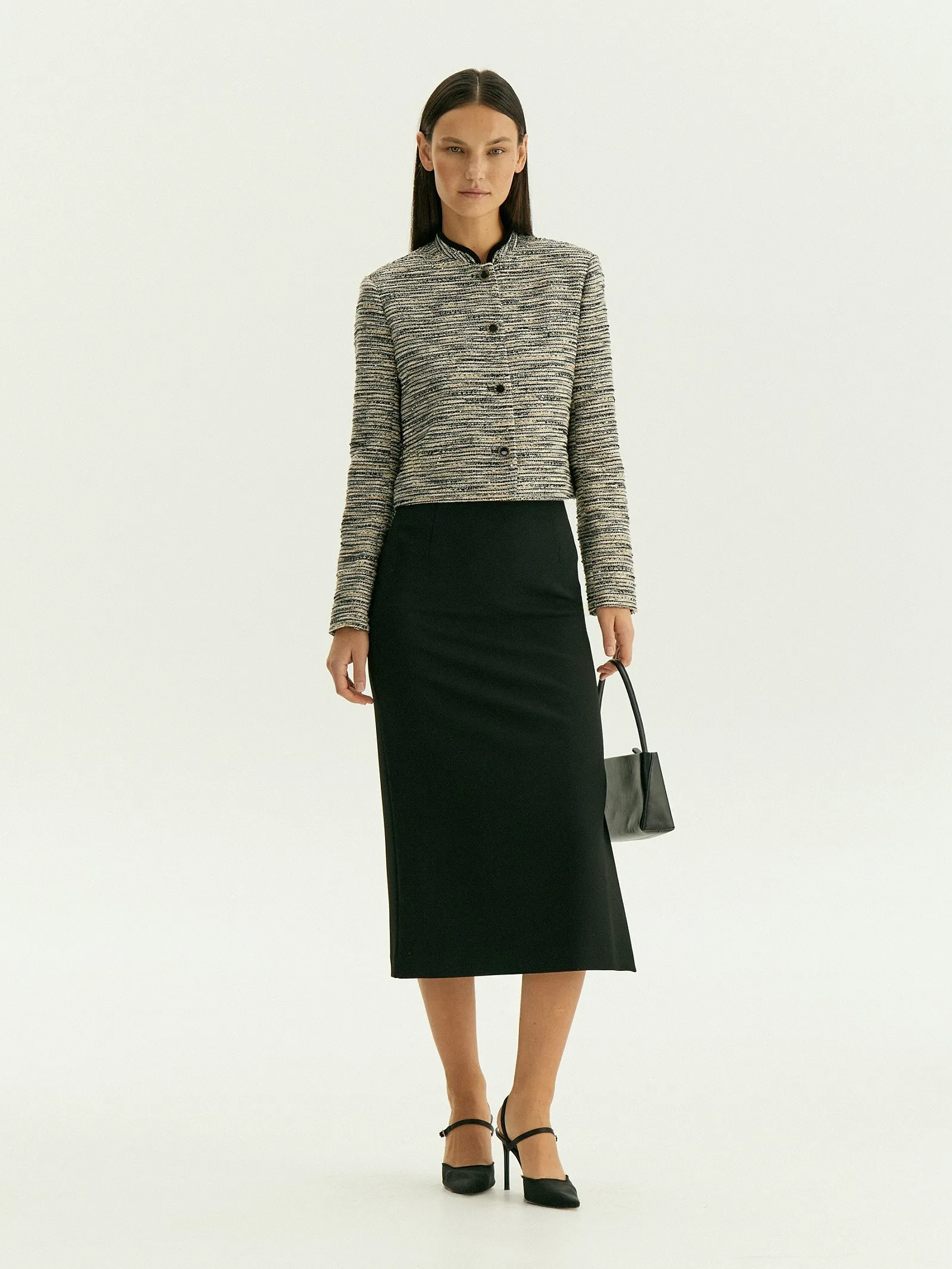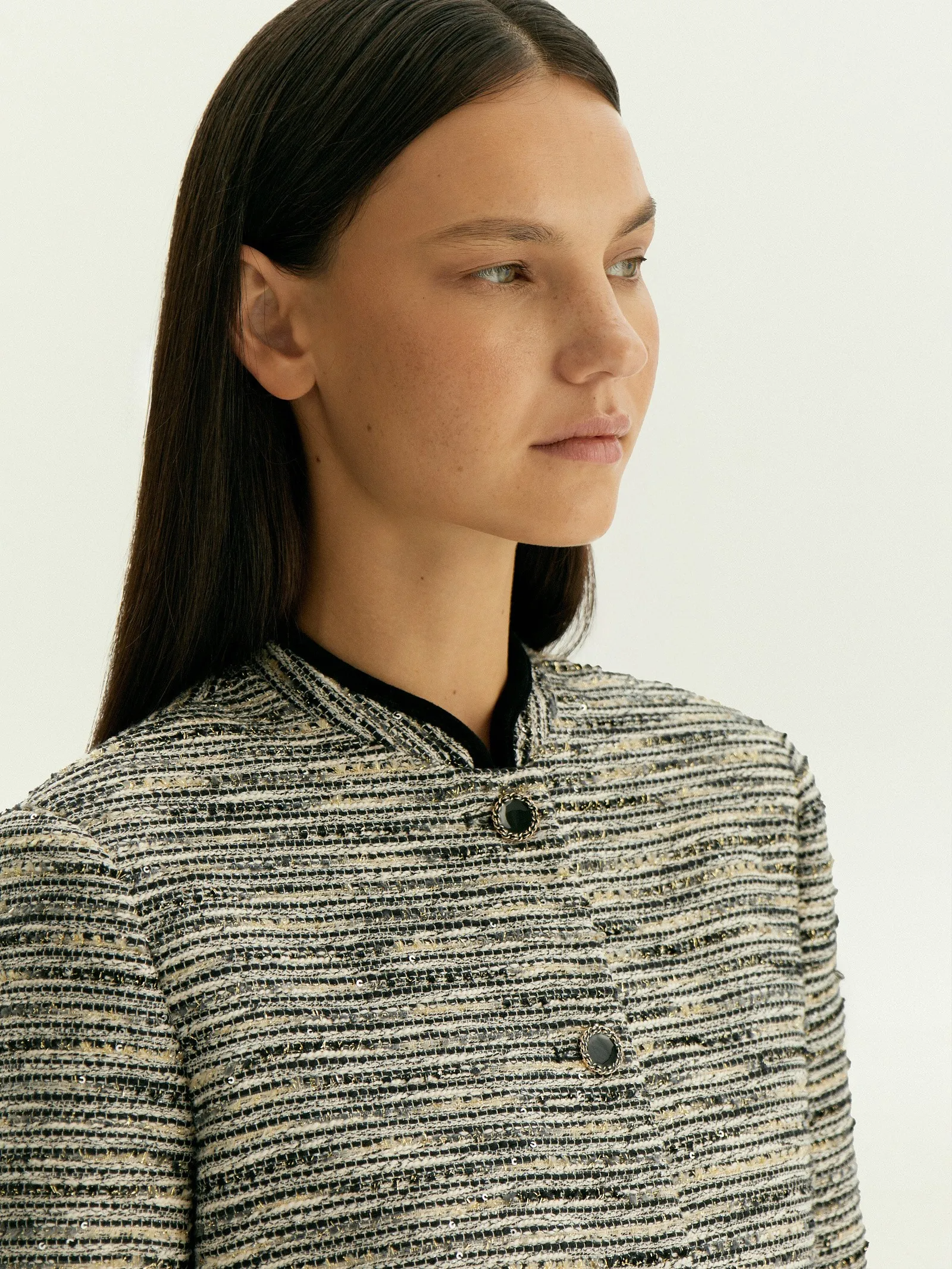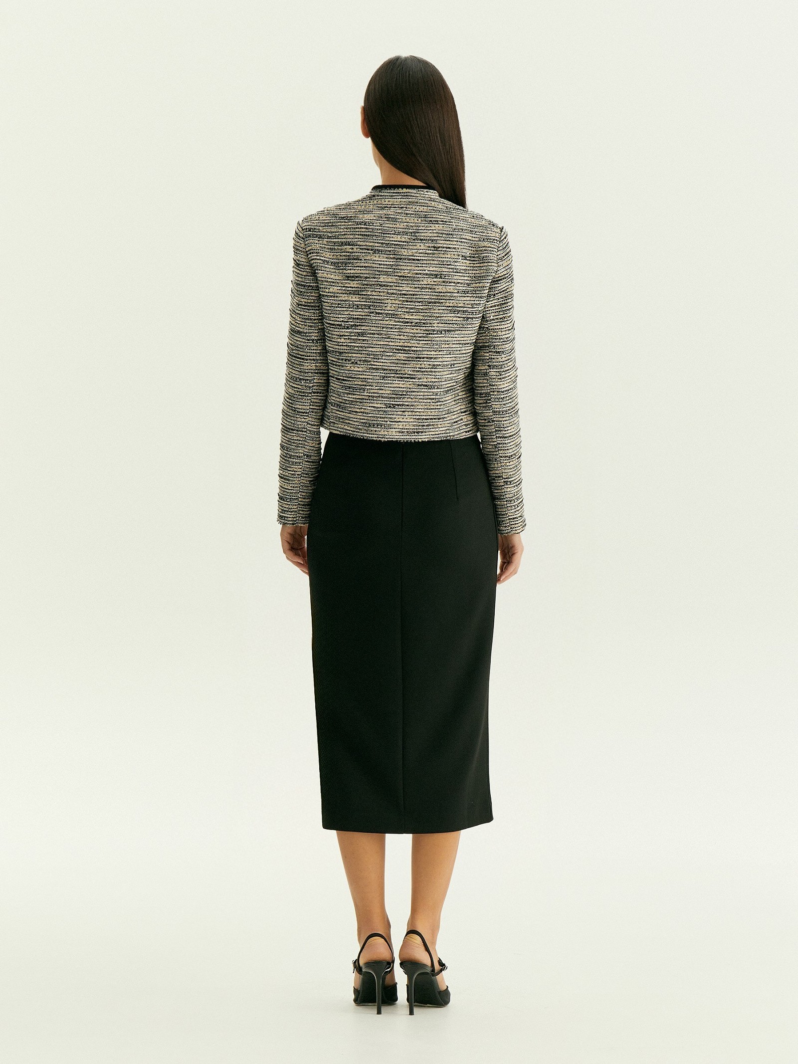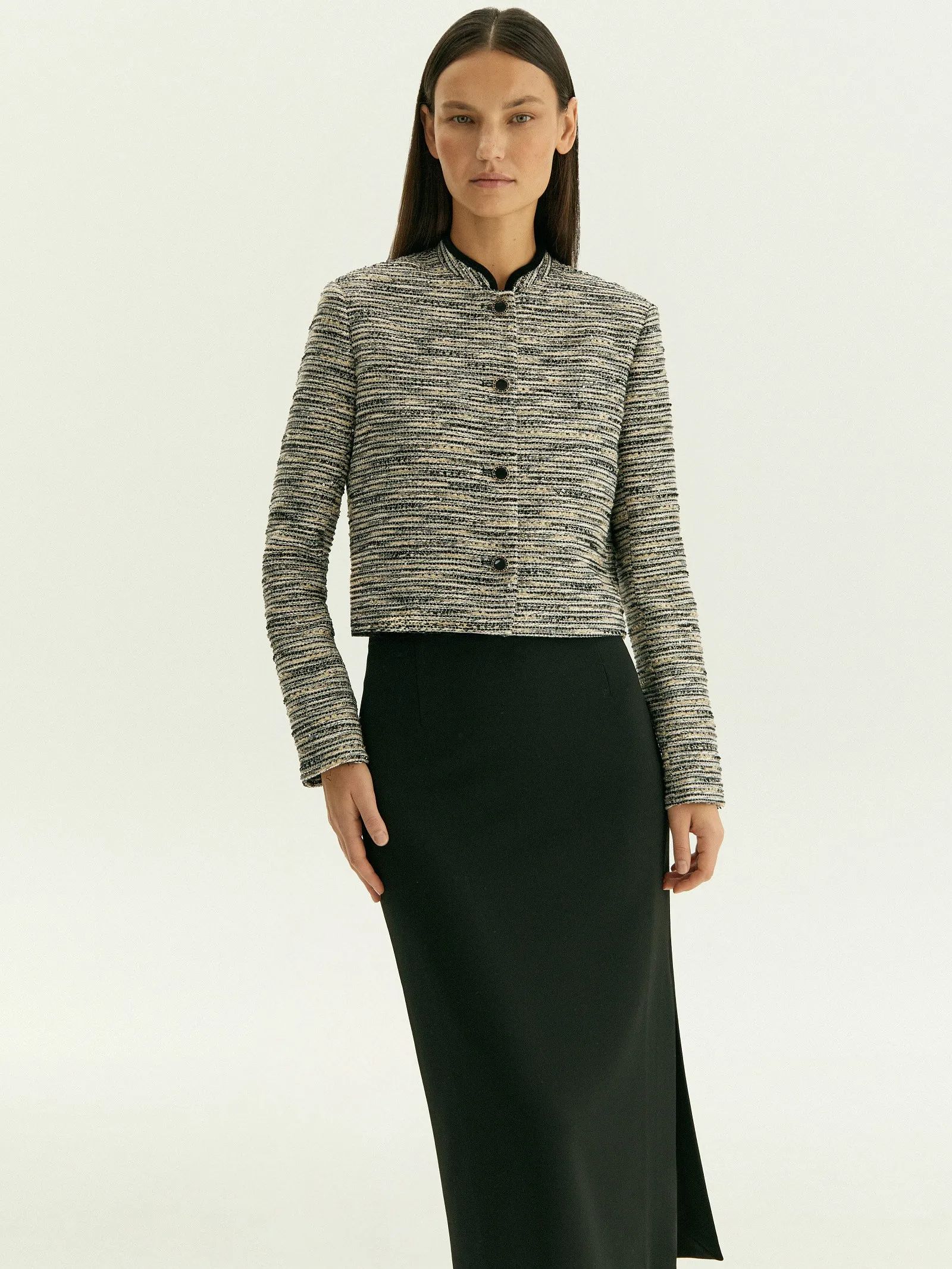 Однобортный кроп-жакет из твида станет стильной основой офисного или коктейльного образа. Его шарм в деталях, которые не бросаются в глаза.