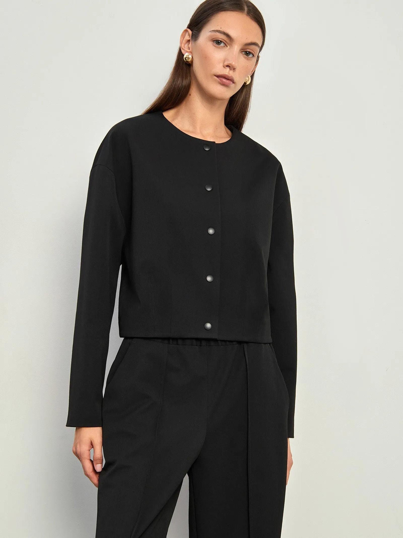 Чёрный укороченный жакет без лацканов гармонично соединяет противоположности. Спущенное плечо с объёмной проймой придаёт верхней части плавность и женственность, уравновешивая прямой силуэт. Изящные вытачки внизу создают лёгкий намёк на приталенность. Комфортный материал на основе вискозы в меру плотный и приятный. Жакет сделан на подкладке. Застёгивается на удобные кнопки. Такая вещь станет отличным выбором на каждый день. Завершить образ можно брюками из комплекта.