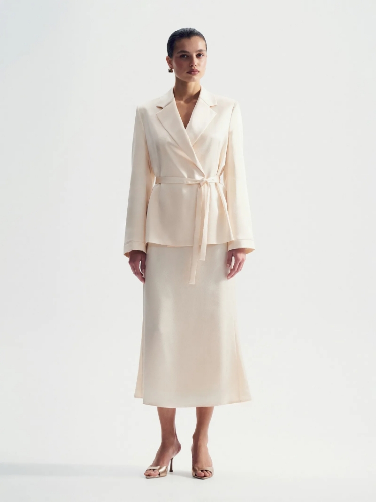 Интересное прочтение бельевого стиля. Атласный жакет с лацканами и поясом станет нетривиальным выбором для особых случаев. Нежный сливочный оттенок делает образ особенно элегантным.Удлинённая прямая модель застёгивается на пуговицу чуть ниже уровня талии. С помощью пояса в комплекте можно сформировать приталенный силуэт. Контраст между талией и плечами дополнительно сакцентируют подплечники. Жакет может стать частью капсулы pitara с юбками, топами и блузой