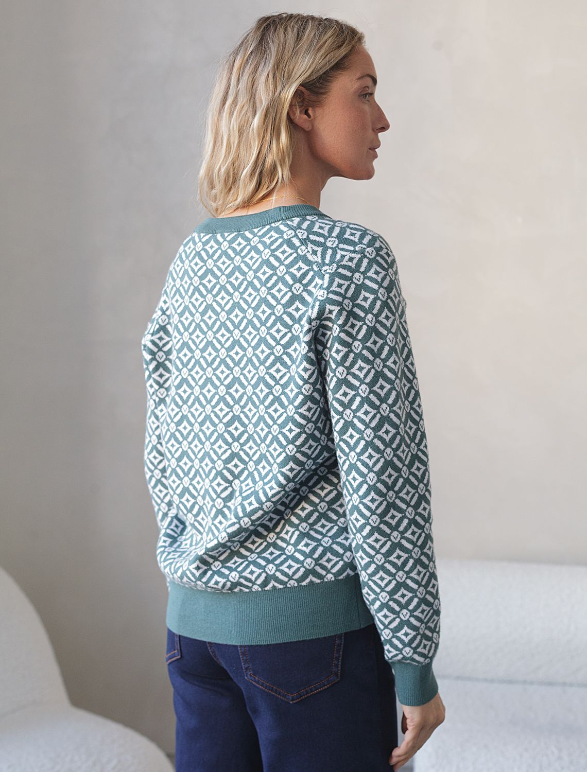 Жакет полынного цвета выполнен из мягкого трикотажа на основе шелковистой эластичной поливискозы. Жаккардовое переплетение образует геометрический узор. Застежка на перламутровые пуговицы подчеркивает гладкую пряжу. Жаккардовое вязание - это один из самых дорогих способов изготовления трикотажных изделий, так как для вязания используется сразу несколько цветов нитей. Жаккард вяжется намного дольше, чем однотонное полотно, имеет гораздо больший вес и плотность. Благодаря этому трикотаж дольше сохраняет красивый внешний вид, не пилингуется и не подвержен спуску петель. Модель станет удачной инвестицией в базовый гардероб. Комфортно носить даже на голое тело или как накидку.