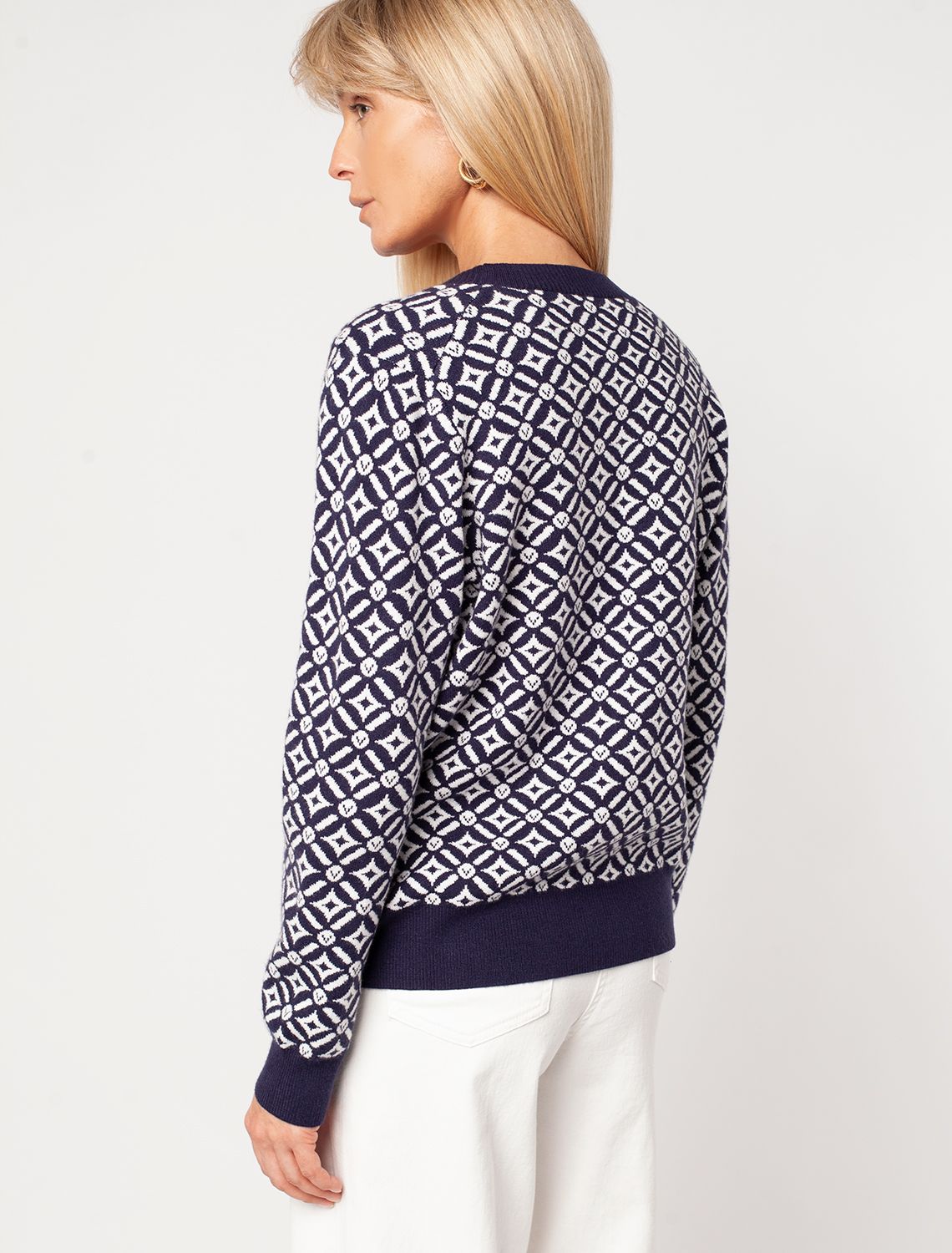 Жакет сине-белого цвета выполнен из мягкого трикотажа на основе шелковистой эластичной поливискозы. Жаккардовое переплетение образует геометрический узор. Застежка на перламутровые пуговицы подчеркивает гладкую пряжу. Жаккардовое вязание - это один из самых дорогих способов изготовления трикотажных изделий, так как для вязания используется сразу несколько цветов нитей. Жаккард вяжется намного дольше, чем однотонное полотно, имеет гораздо больший вес и плотность. Благодаря этому трикотаж дольше сохраняет красивый внешний вид, не пилингуется и не подвержен спуску петель. Модель станет удачной инвестицией в базовый гардероб. Комфортно носить даже на голое тело или как накидку.