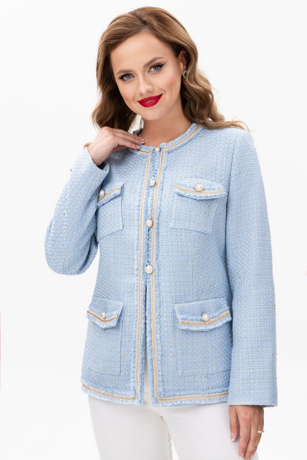 Элегантный твидовый жакет, выполненный в неподражаемом стиле Chanel, придаст вашему образу роскоши и изящества. Отделка из тесьмы подчеркивает его современный, но в то же время классический стиль, который будет актуален во все времена. Носите его в паре с любимыми джинсами или же с юбкой-карандаш для создания неповторимого делового образа. Жакет женский из костюмной текстурированной ткани на подкладке, с центральной бортовой застежкой встык на 4 навесных петли и пуговицы (размер и цвет фурнитуры может незначительно отличаться от фото). Перед жакета с талиевой вытачкой, идущей от низа изделия до центра груди. На переде расположены 2 пары накладных карманов с клапанами, вверху на уровне линии груди и немного ниже линии талии, на клапанах пришиты пуговицы (декоративный элемент). Углы кармана прямые, клапаны фигурной формы. Спинка со средним швом и талиевыми вытачками. Рукава втачные двухшовные, длинные. Горловина круглой формы, обтачная. Линия борта прямая. Край горловины, борт, клапаны и низ изделия оформлен бахромой и отделочной тесьмой. Жакет с плечевыми накладками.