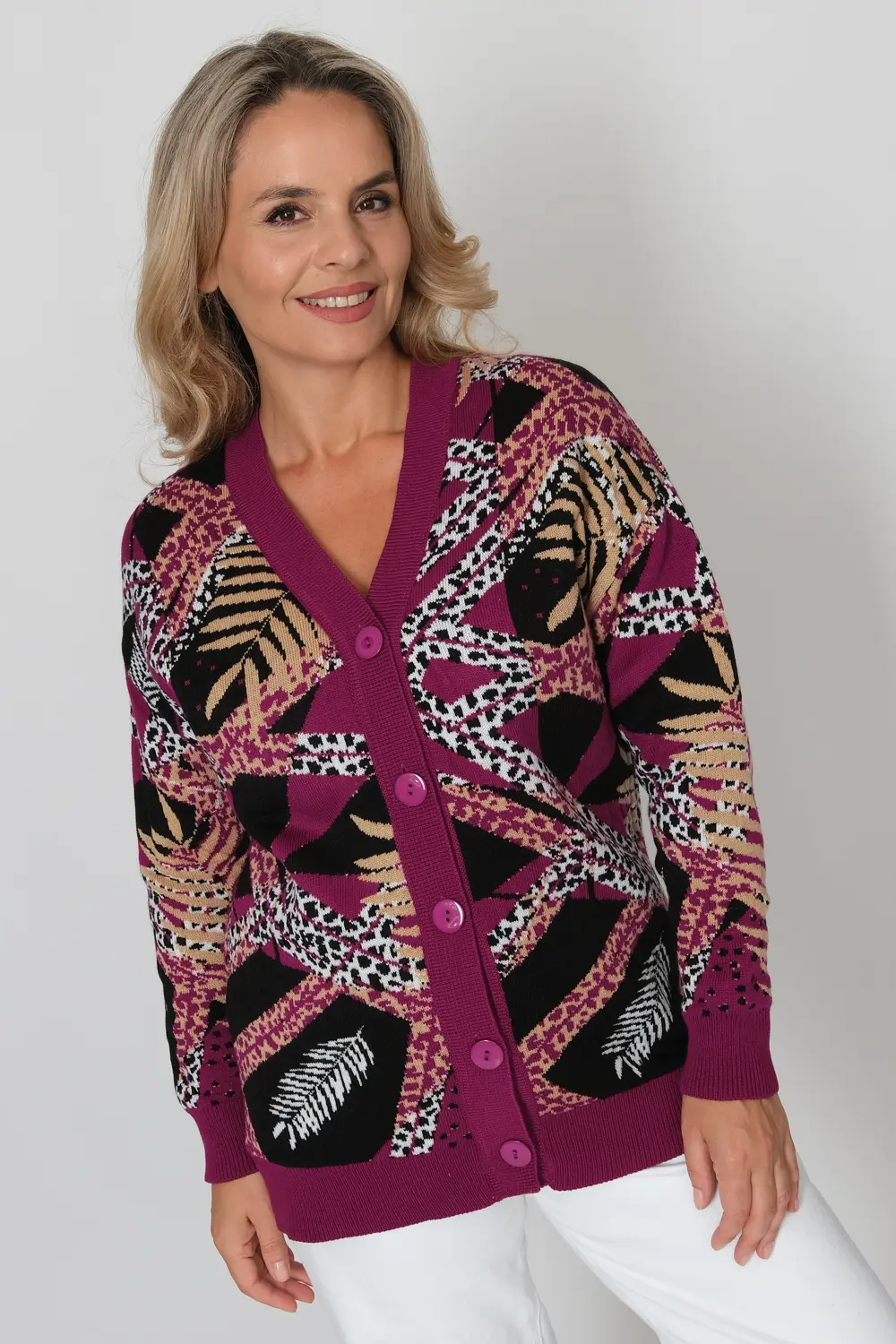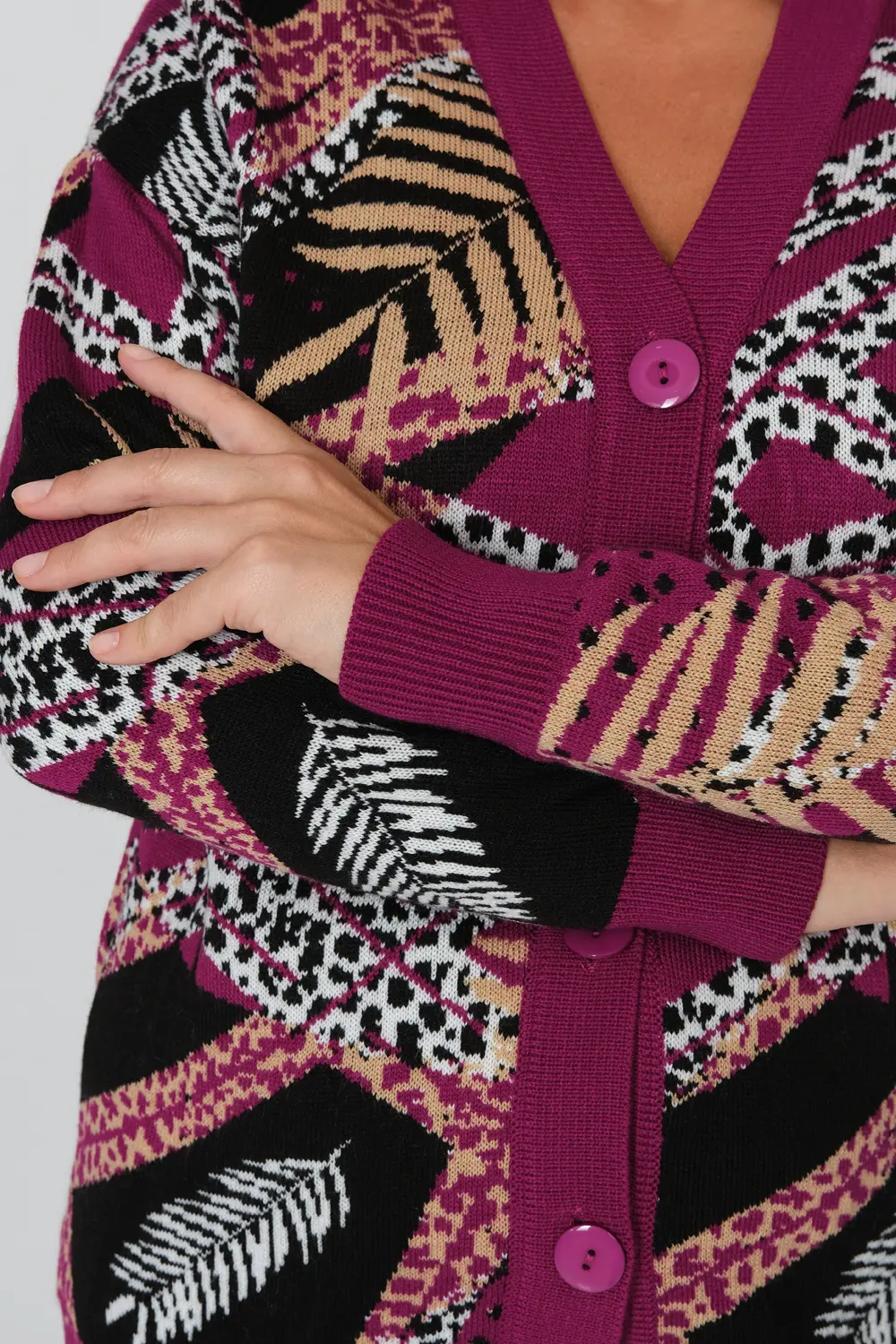 Вязаный женский  жакет свободного силуэта, оверсайз. Плечо спущенное, рукава втачные длинные. Жакет застегивается на пуговицы, образуя V-образный вырез горловины. Жакет выполнен жаккардовым переплетением, рисунок растительный абстрактный. Низ изделия и манжеты выполнены эластичным переплетением. ягодный микс