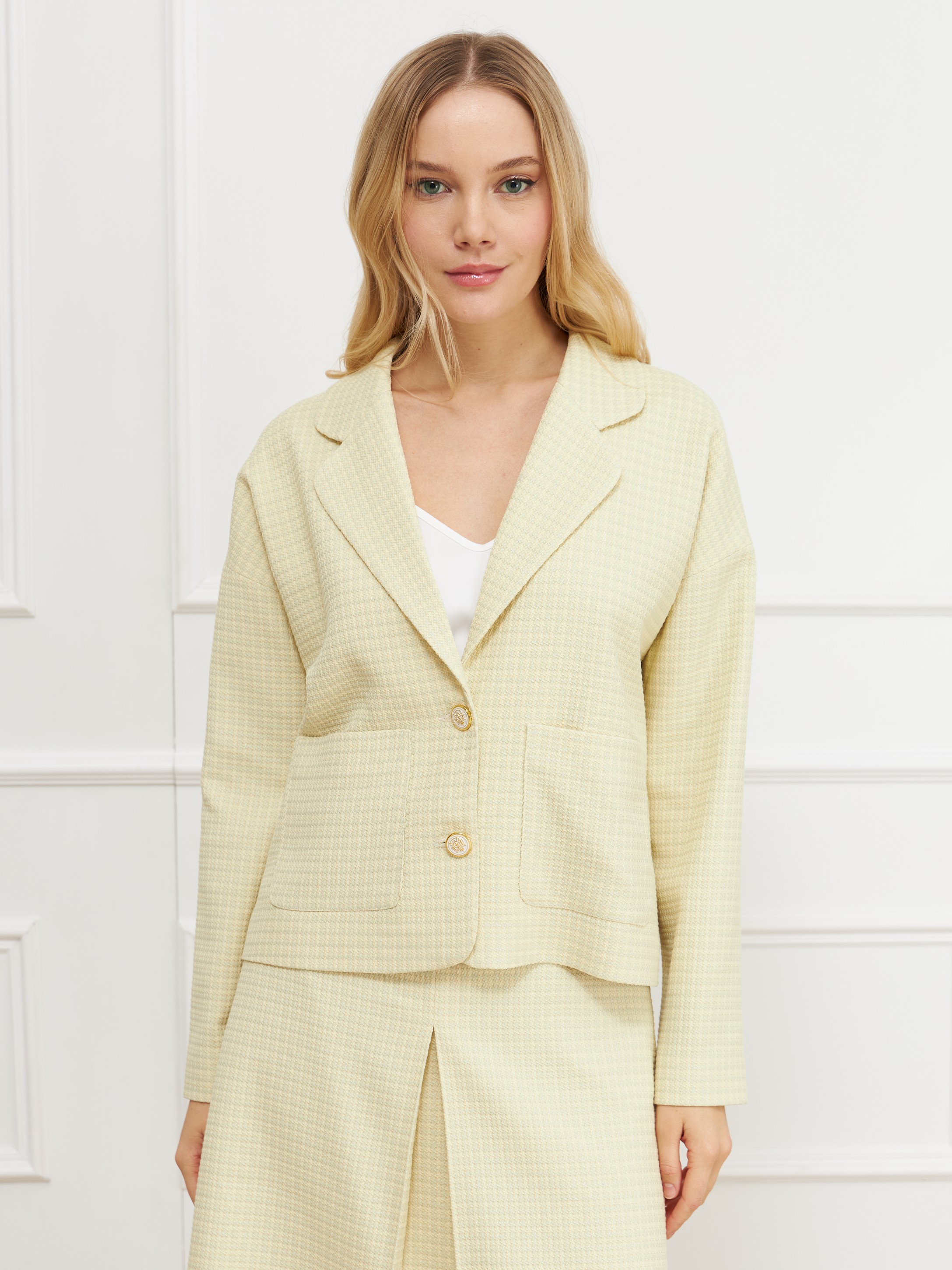 Прямой однобортный жакет, с закругленными лацканами и отложным воротником, дополнен двумя накладными карманами. Мягкий силуэт достигается спущенной линией плеча, тонкая эластичная подкладка не утяжеляет изделие. Модель сшили из костюмного материала с принтом «пье-де-пуль» в нежной желтой палитре, и дополнили тонкой эластичной подкладкой. Роль декора отвели золотистым пуговицам. На фото в паре юбка Юбка А-2027 МЛА(В5).