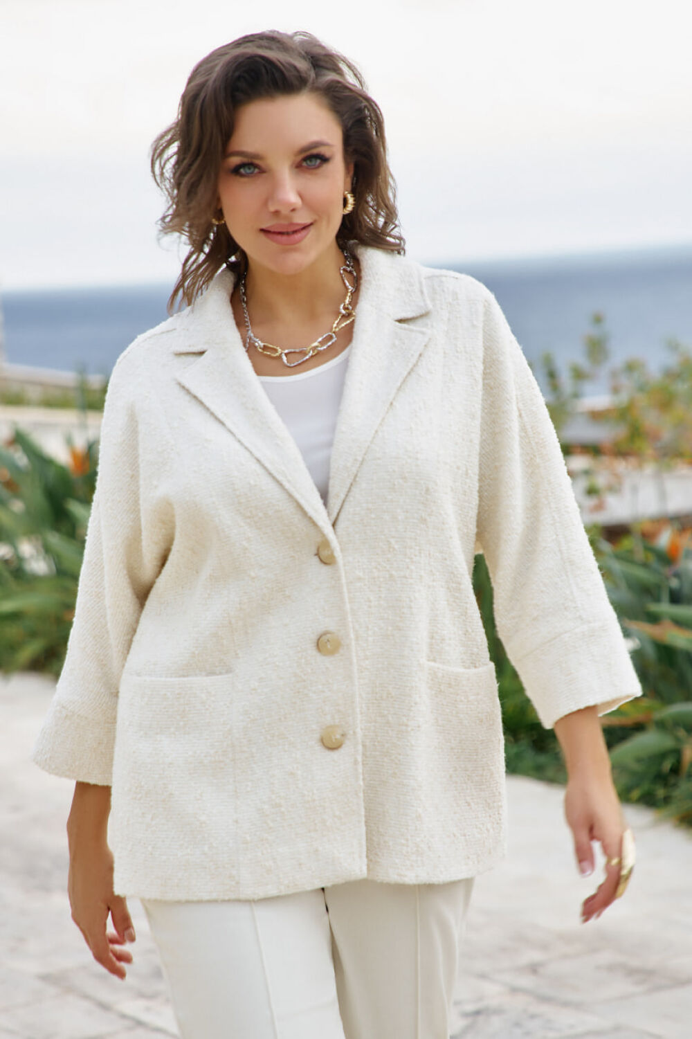 Этот жакет — мягкая архитектура уюта и стиля. Сливочный тон словно согревает взгляд, а рельефная фактура придаёт образу тактильную выразительность: он одновременно строг и ласков, деликатно подчёркивает вкус женщины, которая выбирает комфорт без лишней демонстрации. Жакет прямого силуэта, с центральной бортовой застёжкой по борту на петли-пуговицы. По переду рельефы и накладные карманы, воротник пиджачный отложной с лацканом. Спинка с вертикальными рельефами. Рукав цельнокроеный с поперечной вставкой, низ с манжетом длина 3/4 .  Жакет на подкладке. Данная модель жакета в стильном оттенке идеалена для межсезонья в качестве верхнего или среднего слоя. Длина жакета 69,5 см (р 50-54), 71,5 см, (р 56-60), длина рукава 58 см (р 50-54), 59 см (р 56-60).
