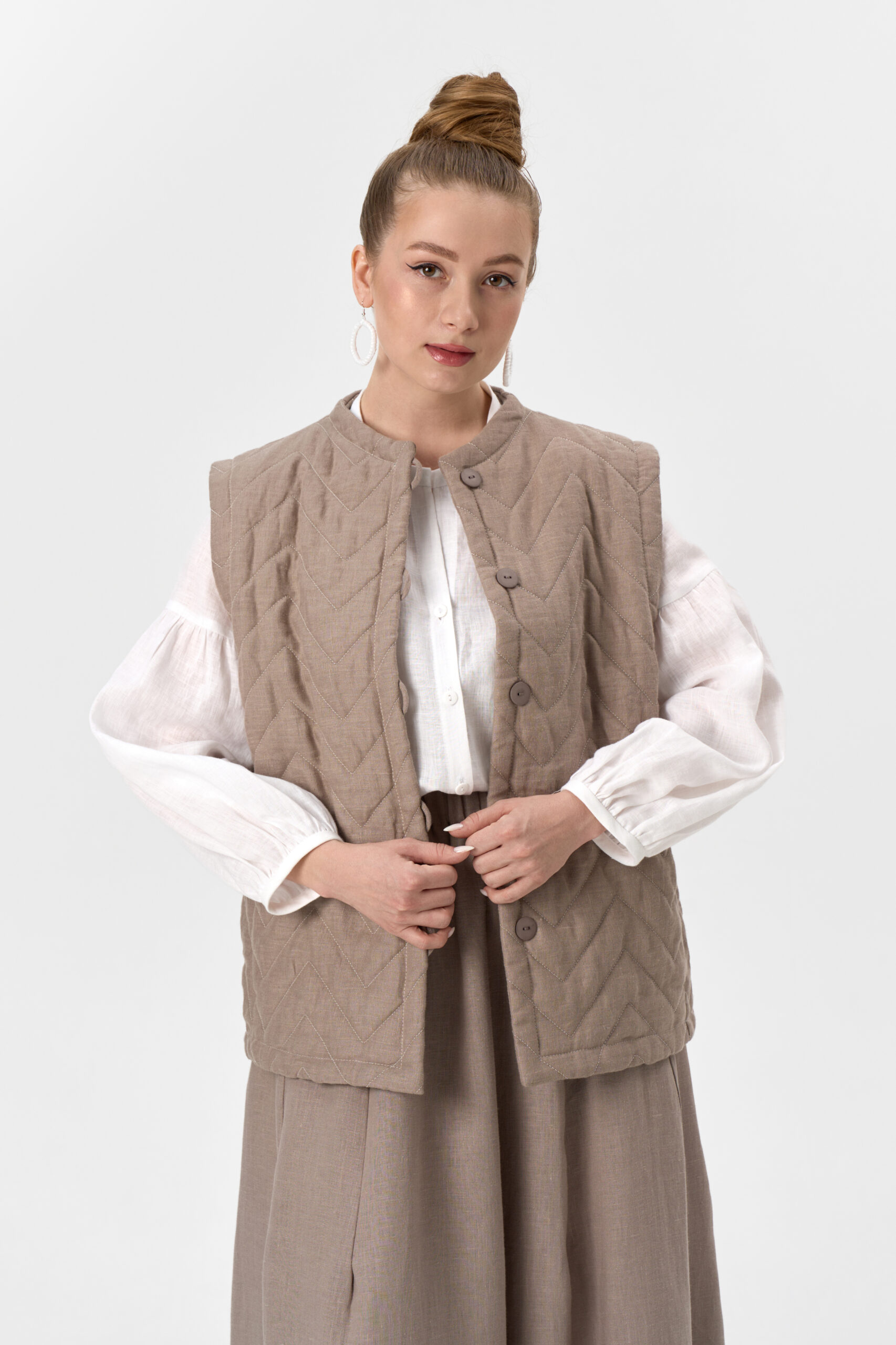 Жилет женский стеганый на синтепоне с подкладкой. Воротник цельнокроеная стойка. Карманы в боковых швах.