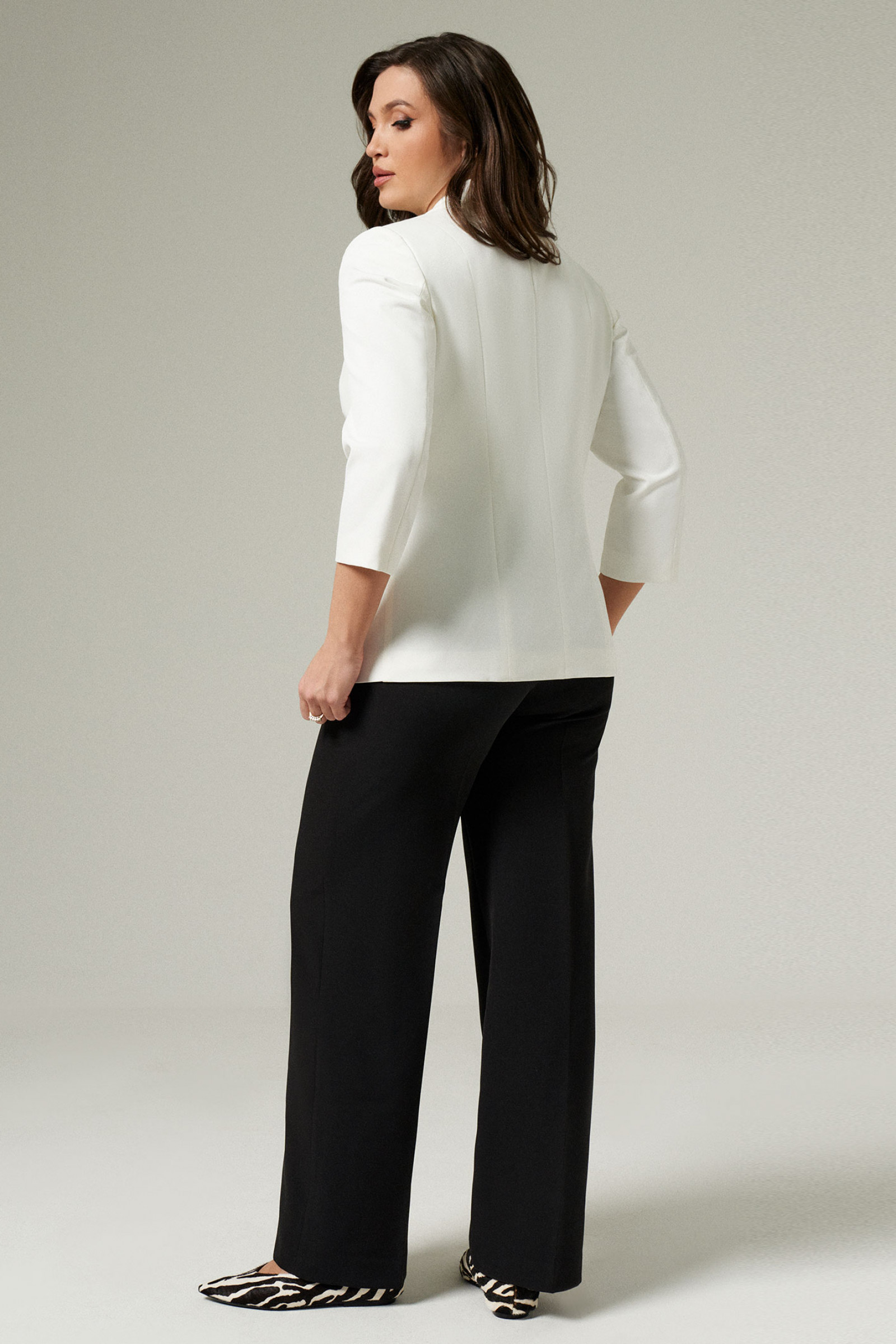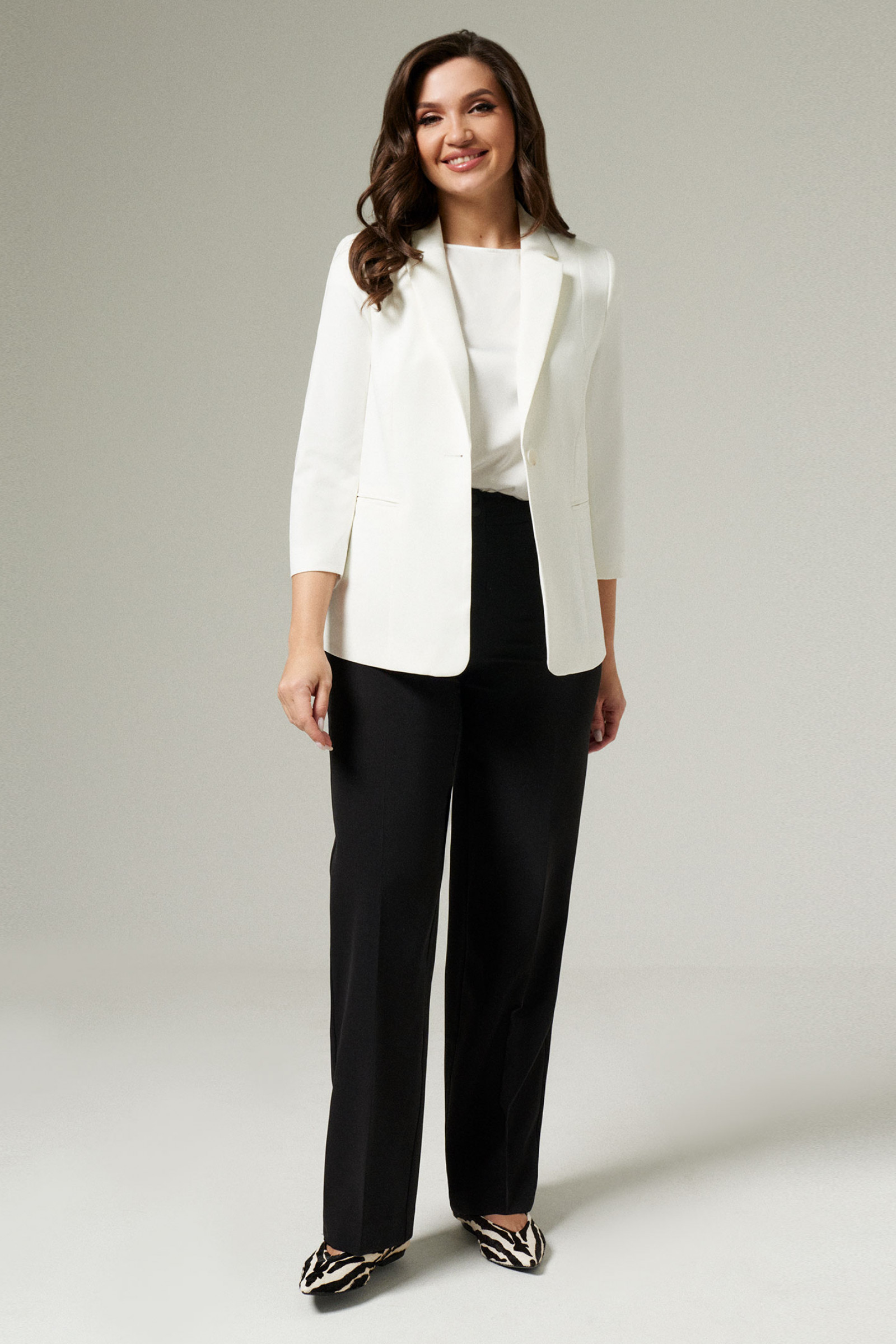 Классический жакет для повседневной носки из костюмной ткани. Жакет однобортный с длинным рукавом. Застёжка на одну петлю-пуговицу. По переду и спинке имеются рельефы. На передней части изделия прорезные карманы. рукав длинный двухшовный. Силуэт приталенный.