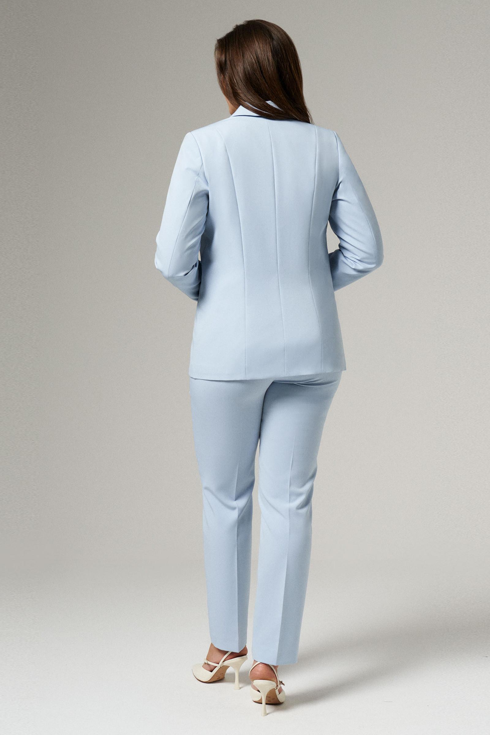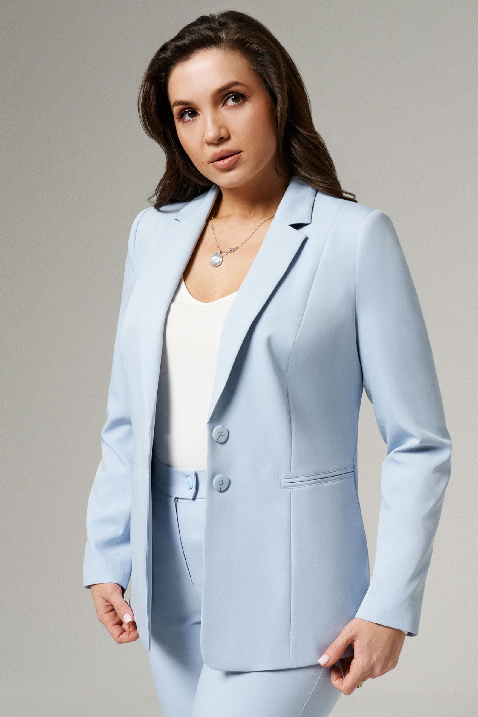 Жакет классический из костюмной ткани для повседневной носки. Жакет однобортный, по переду и спинке рельефные швы. Жакет однобортный прилегающий, застёжка на одну петлю- пуговицу Рукав длинный, двухшовный. По переду и спинке рельефные швы. По переду жакета прорезные карманы.