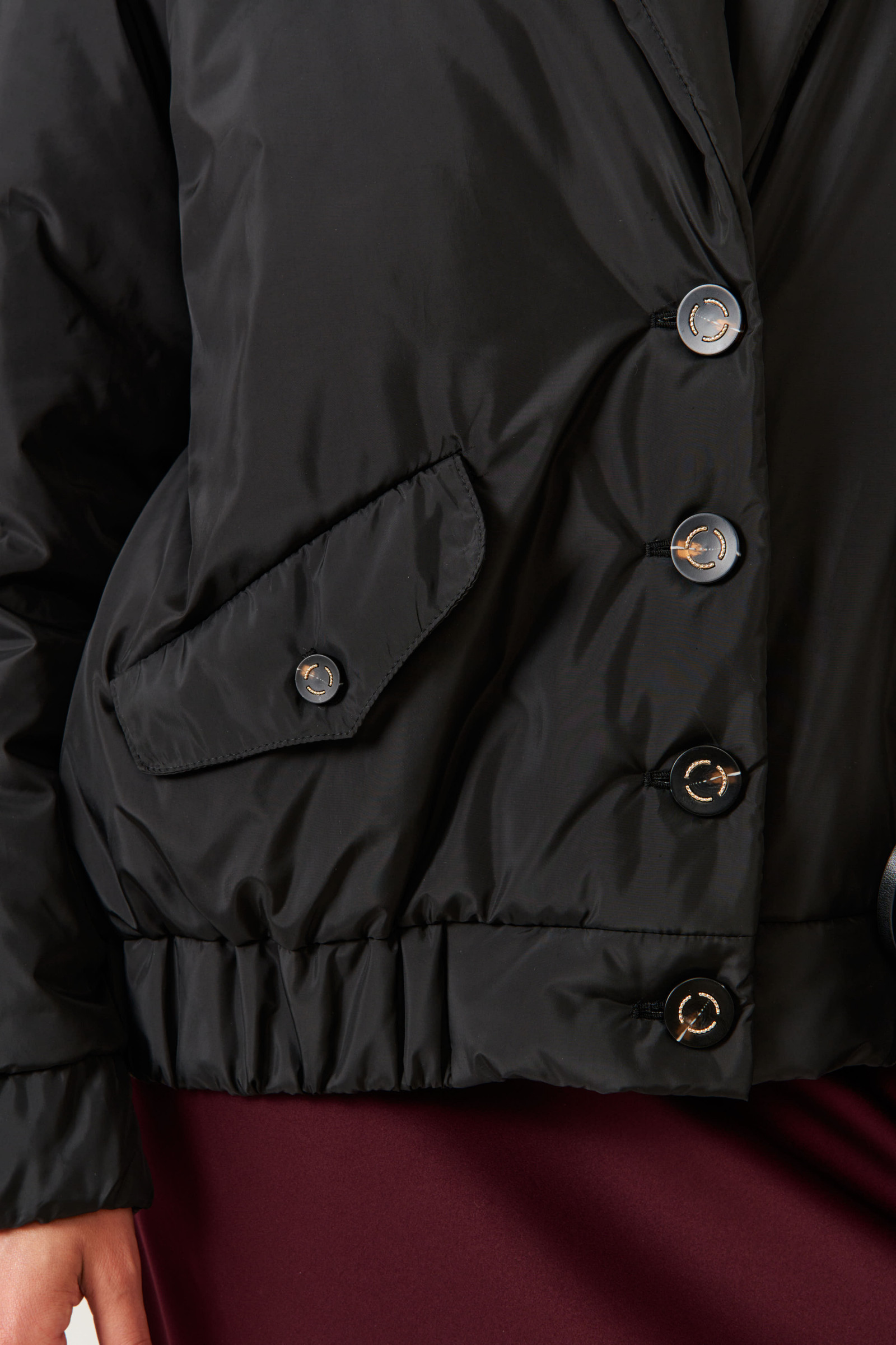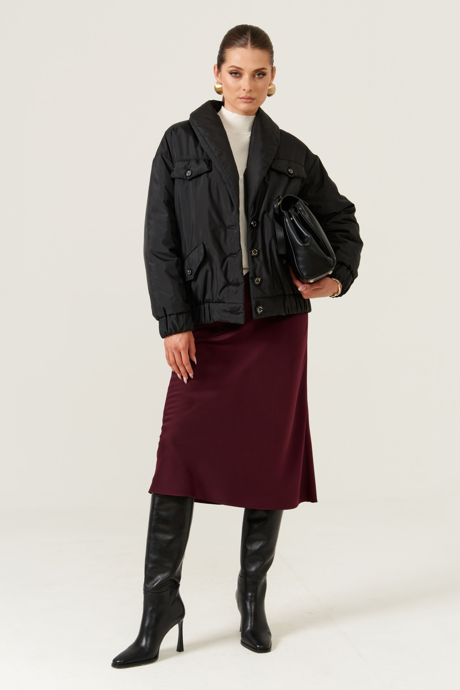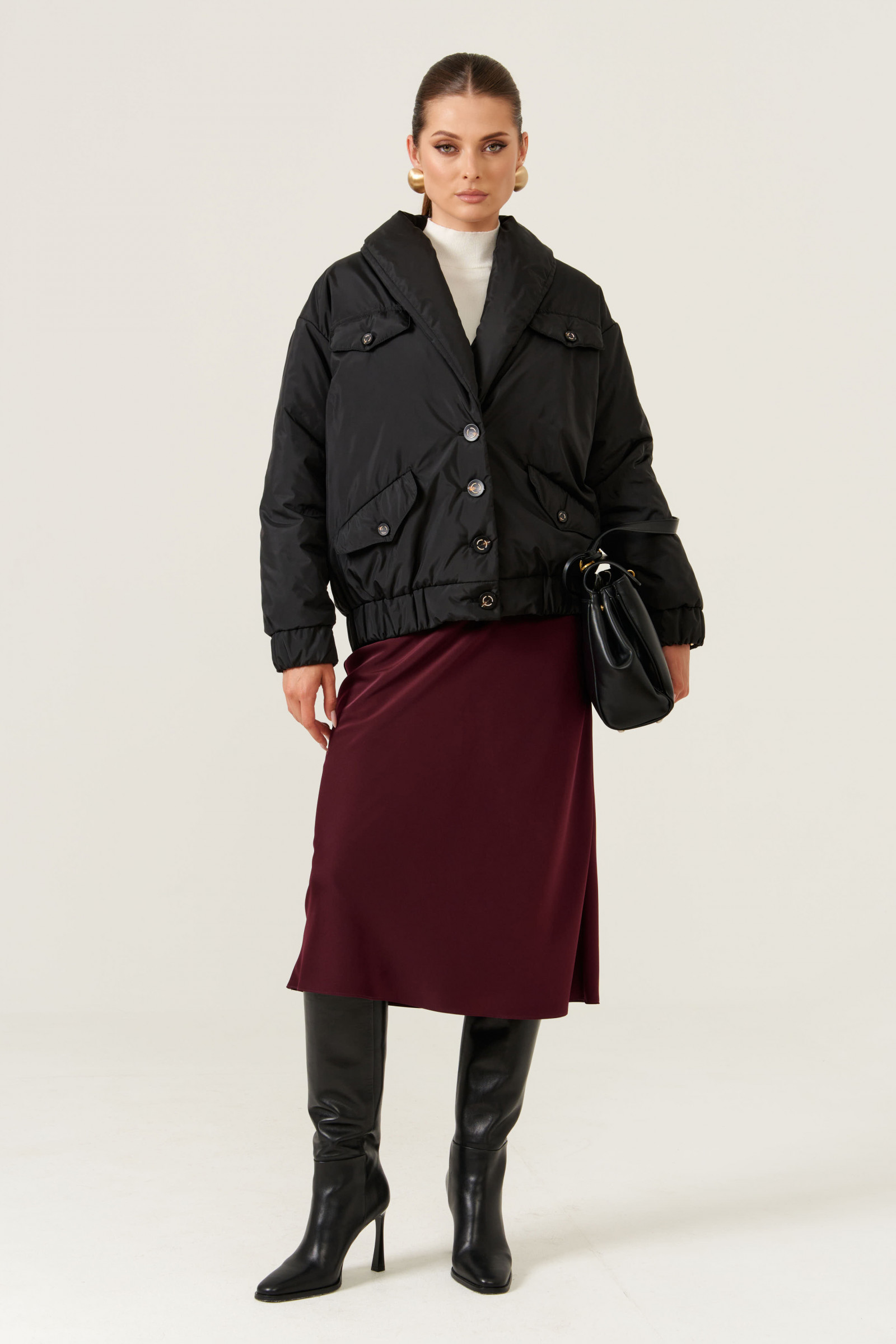 Это женская куртка на легком синтепоне, предназначенная для повседневной носки. Модель выполнена в классическом стиле с практичными деталями и аккуратным дизайном. Центральная застежка — бортовая на обметанные петли и пуговицы, обеспечивающая надежность и удобство при носке. Передняя часть украшена двумя накладными клапанами с декоративными пуговицами, а также двумя карманами с листочкой и клапанами, застегивающимися на одну обметанную петлю и пуговицу — все элементы добавляют модели стильности и функциональности. Низ изделия выполнен на резинке, что создает комфортную посадку и защищает от ветра. Воротник-шаль придает образу элегантность, а длинные втачные рукава с низом на резинке обеспечивают свободу движений и уют. Куртка на подкладке, что делает ее более удобной в носке. Цвет — чёрный, универсальный и свежий, легко сочетается с различными образами.