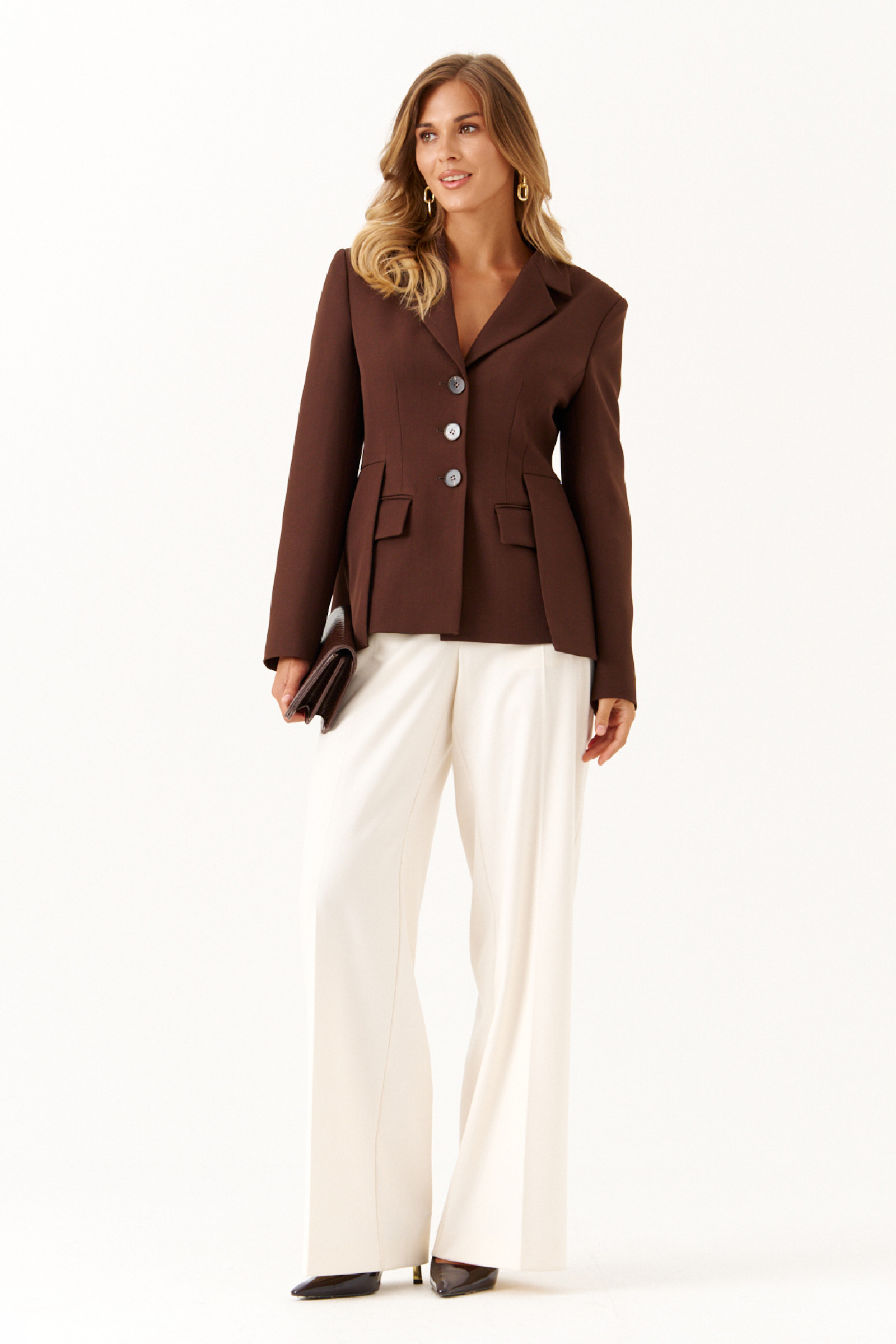 Жакет женский шоколадного оттенка из смесовой ткани предназначен для повседневной носки и выполнен в полуприлегающем силуэте. Он застегивается по центральной бортовой линии с помощью обметанных петель и пуговиц. Передняя часть жакета украшена двумя талиевыми вытачками и двумя рельефами, которые начинаются от проймы и продолжаются до линии подреза, что обеспечивает хорошую посадку и форму. На передней части расположены два кармана с клапанами и обтачками, а также декоративная деталь, придающая изделию стильный вид. Спинка жакета выполнена со средним швом и украшена декоративной деталью, которая идет от линии подреза по талии. Также на спинке есть две талиевые вытачки и два рельефа, начинающихся от проймы и продолжающихся до линии подреза по талии, что способствует более аккуратной посадке изделия по фигуре.