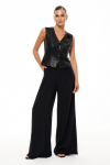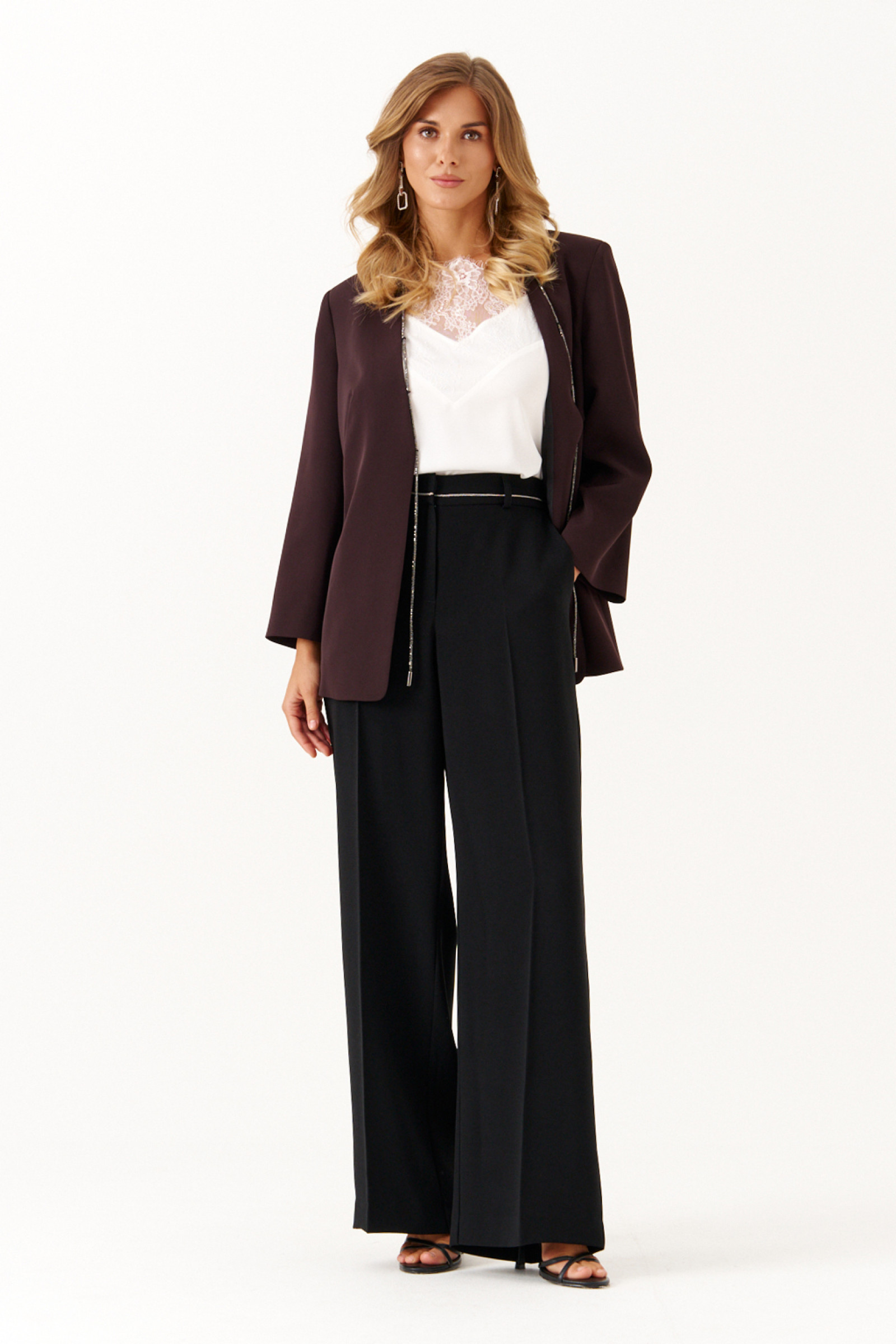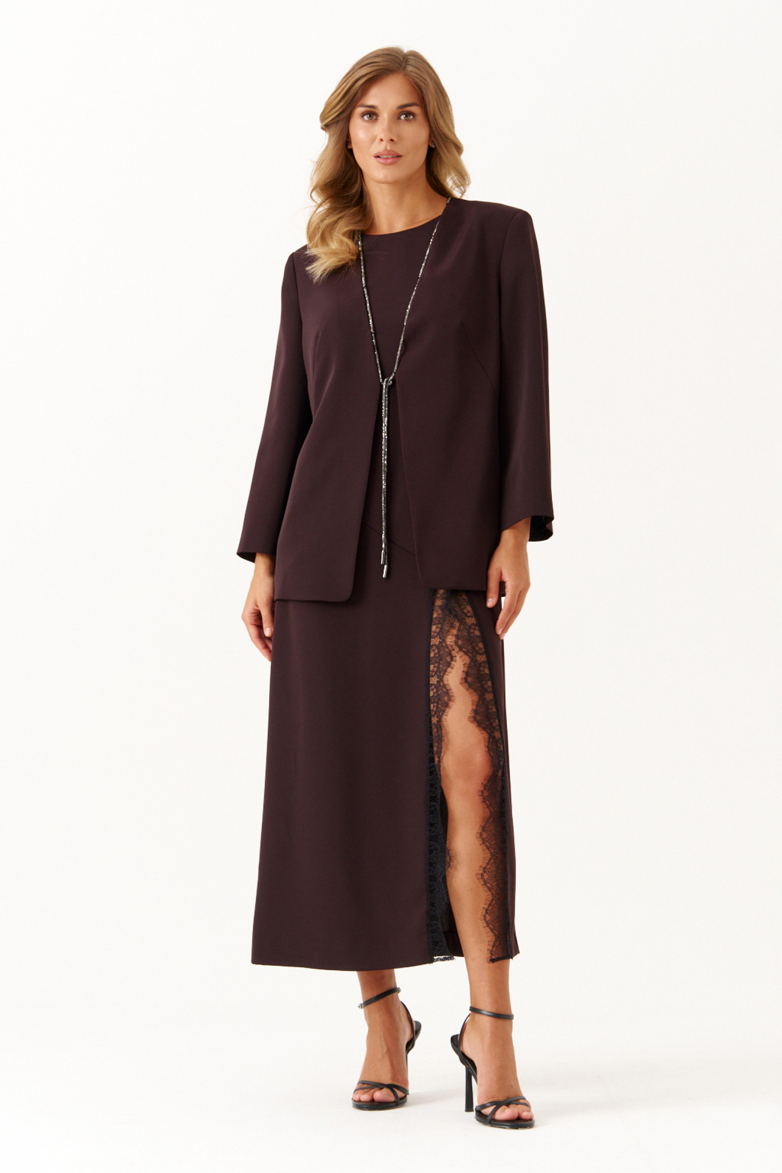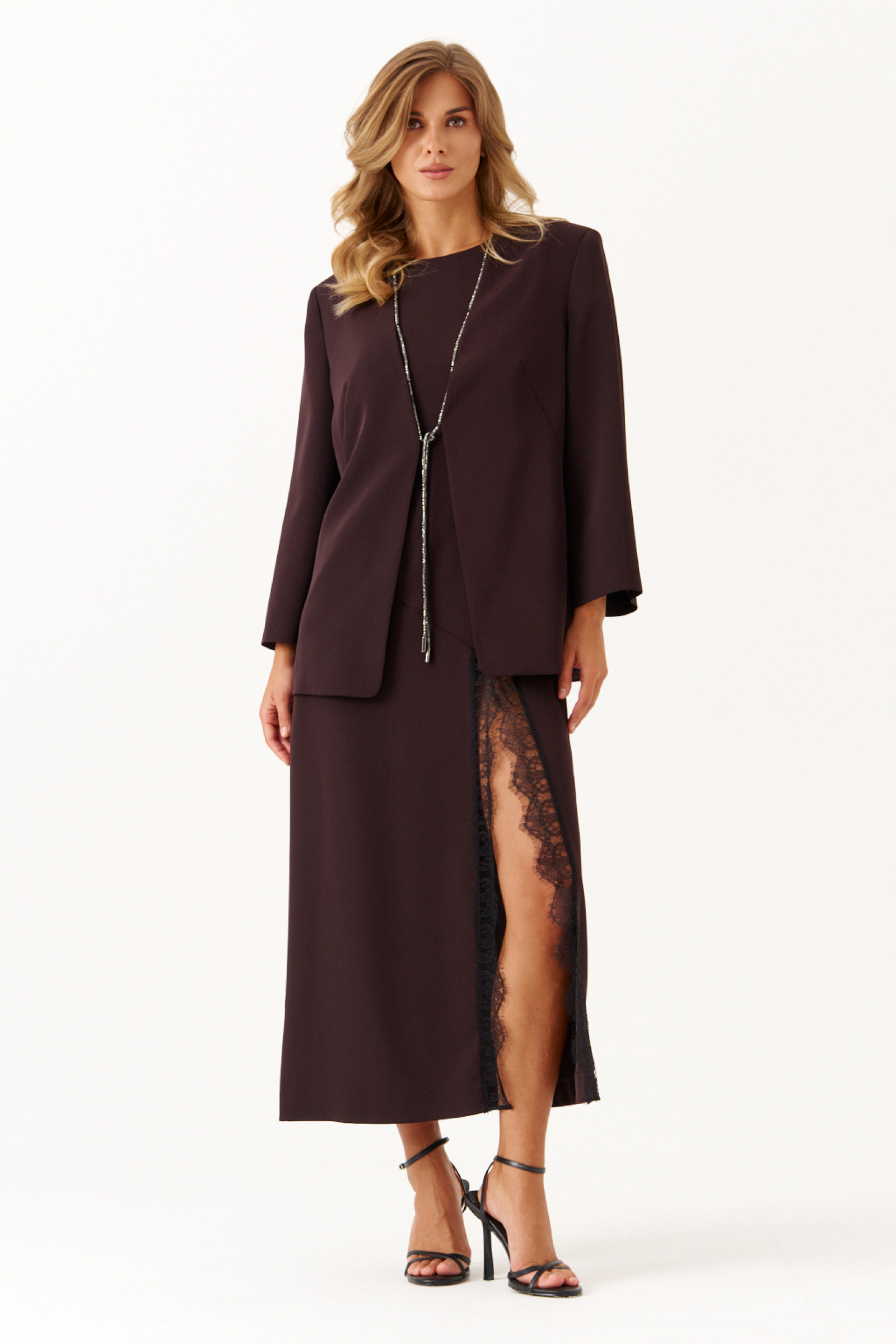 Жакет женский из легкой струящейся ткани, предназначенный для торжественных мероприятий. Модель выполнена в коричневом цвете и отличается элегантным кроем с двумя нагрудными вытачками на переде и средним швом на спинке, что обеспечивает идеальную посадку по фигуре. Край борта украшен декоративным шнуром со стразами, который плавно проходит вдоль V-образной горловины и борта, придавая изделию утонченность и изысканный блеск. Широкие втачные рукава добавляют свободу движения и стильный акцент. Этот жакет станет прекрасным дополнением к вечернему или праздничному образу.