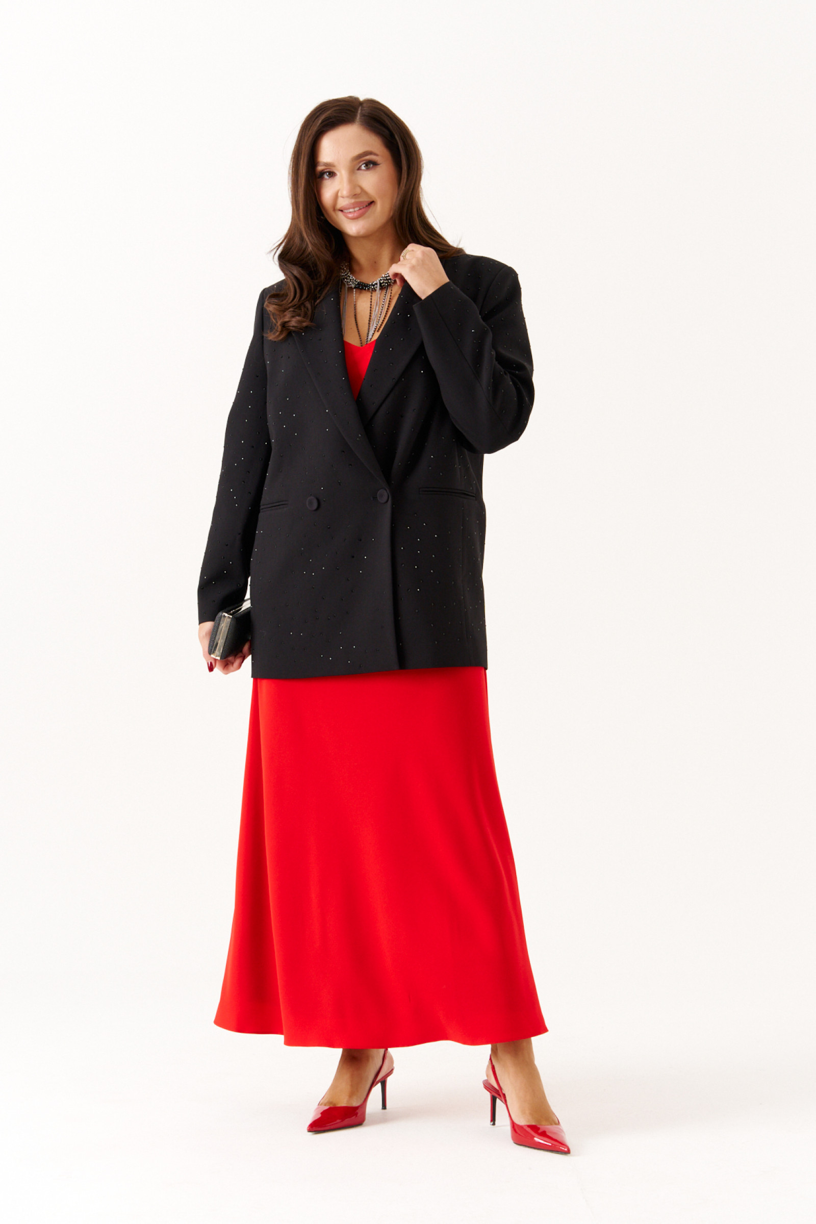 Этот женский жакет выполнен из элегантной поливискозной костюмной ткани черного цвета, идеально подходящей для торжественных и праздничных мероприятий. Модель отличается приталенным силуэтом, который подчеркнет фигуру и придаст образу изысканности. Застежка двубортная с обметанными петлями и пуговицами добавляет классический штрих и удобство в носке. Передняя часть украшена прорезными карманами в рамку с двумя обтачками, что не только придает модели утонченность, но и обеспечивает практическое использование. Спинка модели подчеркнута средним швом, создающим аккуратную линию силуэта. Горловина оформлена пиджачным воротником, придающим образу строгость и элегантность. Рукава втачные длинные, универсальны и позволяют комфортно носить жакет в любых условиях. Весь жакет украшен сияющими стразами, которые придают ему праздничный и женственный облик, превращая его в отличный выбор для особых случаев. Этот жакет сочетает в себе стиль, комфорт и нарядный внешний вид, делая его незаменимым элементом праздничного гардероба.
