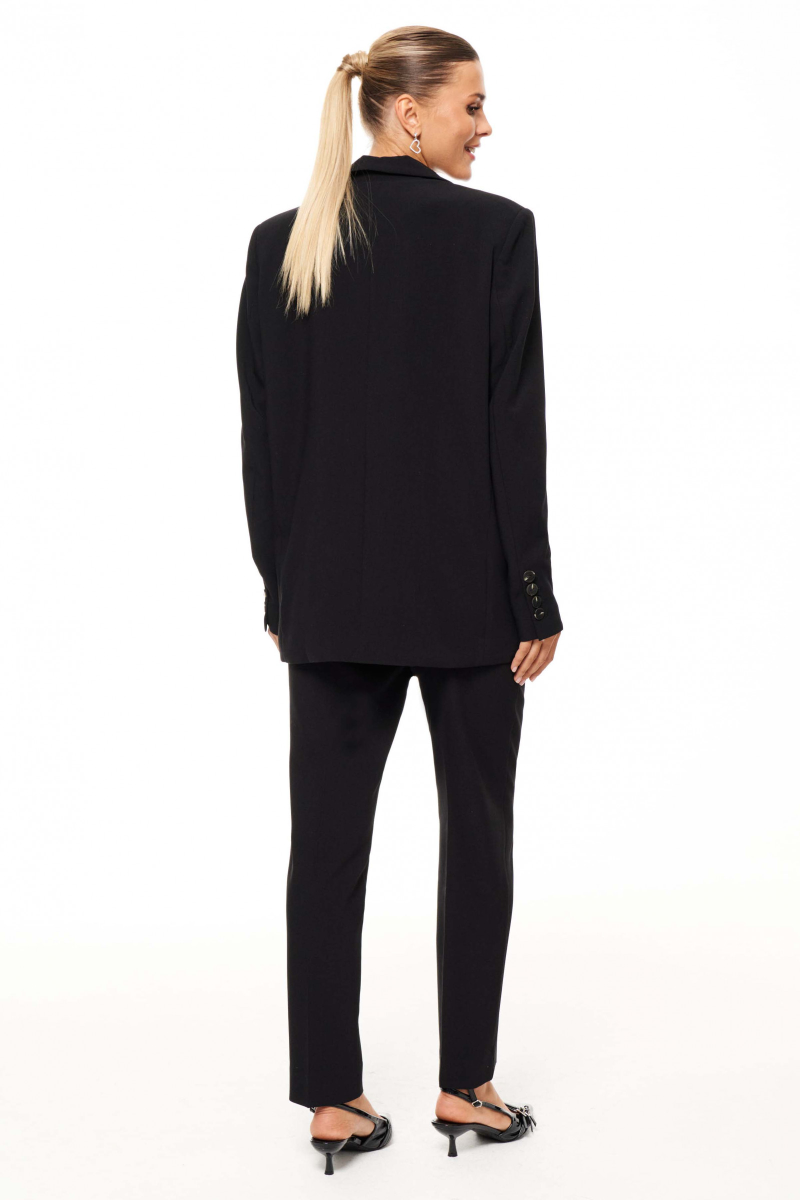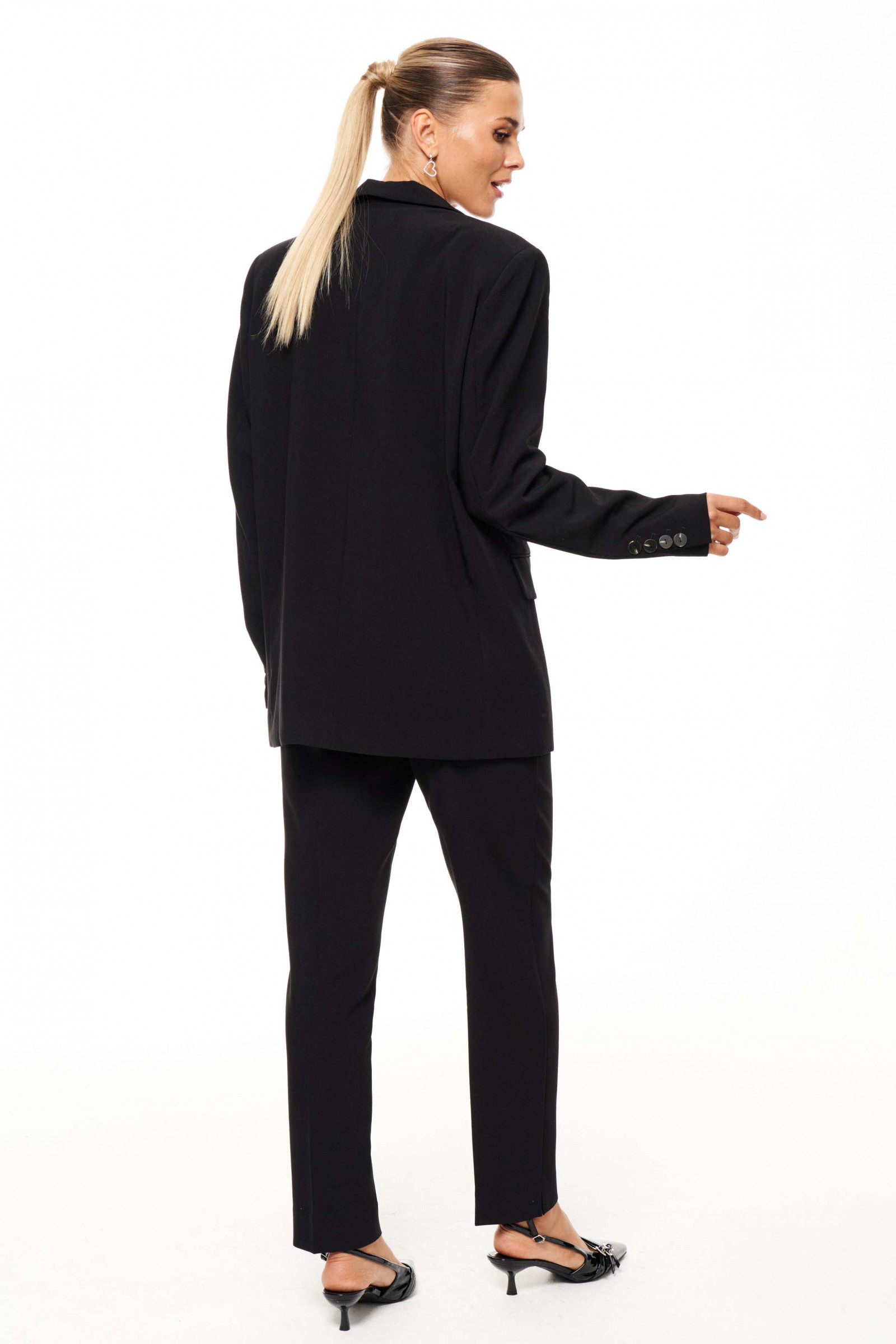 Этот женский жакет выполнен из поливискозной ткани, которая сочетает комфорт и приятное ощущение при носке, делая его идеальным для повседневного использования. Модель обладает классическим силуэтом с центральной бортовой застежкой на одну обметанную петлю и пуговицу, что обеспечивает удобство и стильный внешний вид. Передняя часть жакета украшена двумя карманами с клапанами, которые одновременно служат практичным элементом и дополняют его элегантный дизайн. Горловина аккуратно обработана пиджачным воротником, придающим образу строгий и завершенный вид. Длинные втачные рукава обеспечивают комфорт и свободу движений. Жакет полностью на поливискозной подкладке, что повышает комфорт при носке и позволяет легко надевать и снимать изделие. Выполненный в классическом черном оттенке, этот жакет станет универсальной частью гардероба, идеально сочетаясь как с деловым стилем, так и с более повседневными образами. Он подойдет для офисных будней, прогулок и различных мероприятий, добавляя образу лаконичность и элегантность.