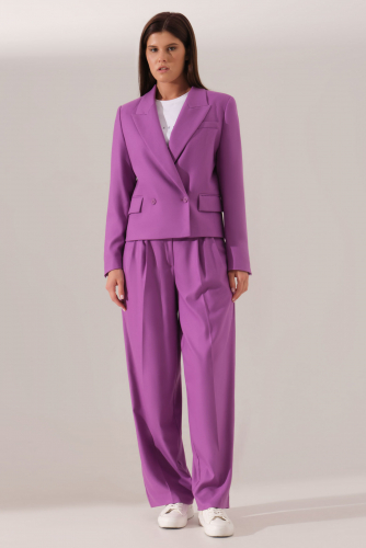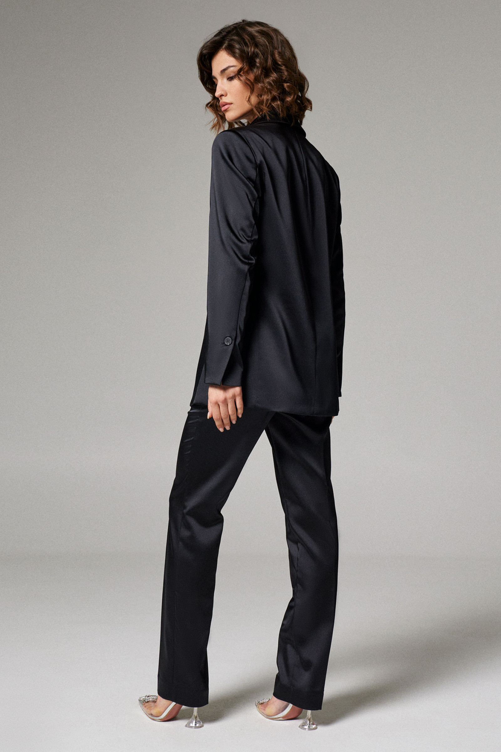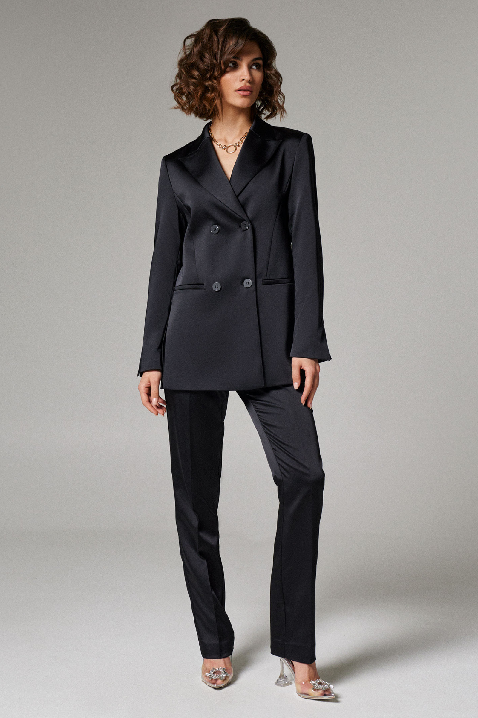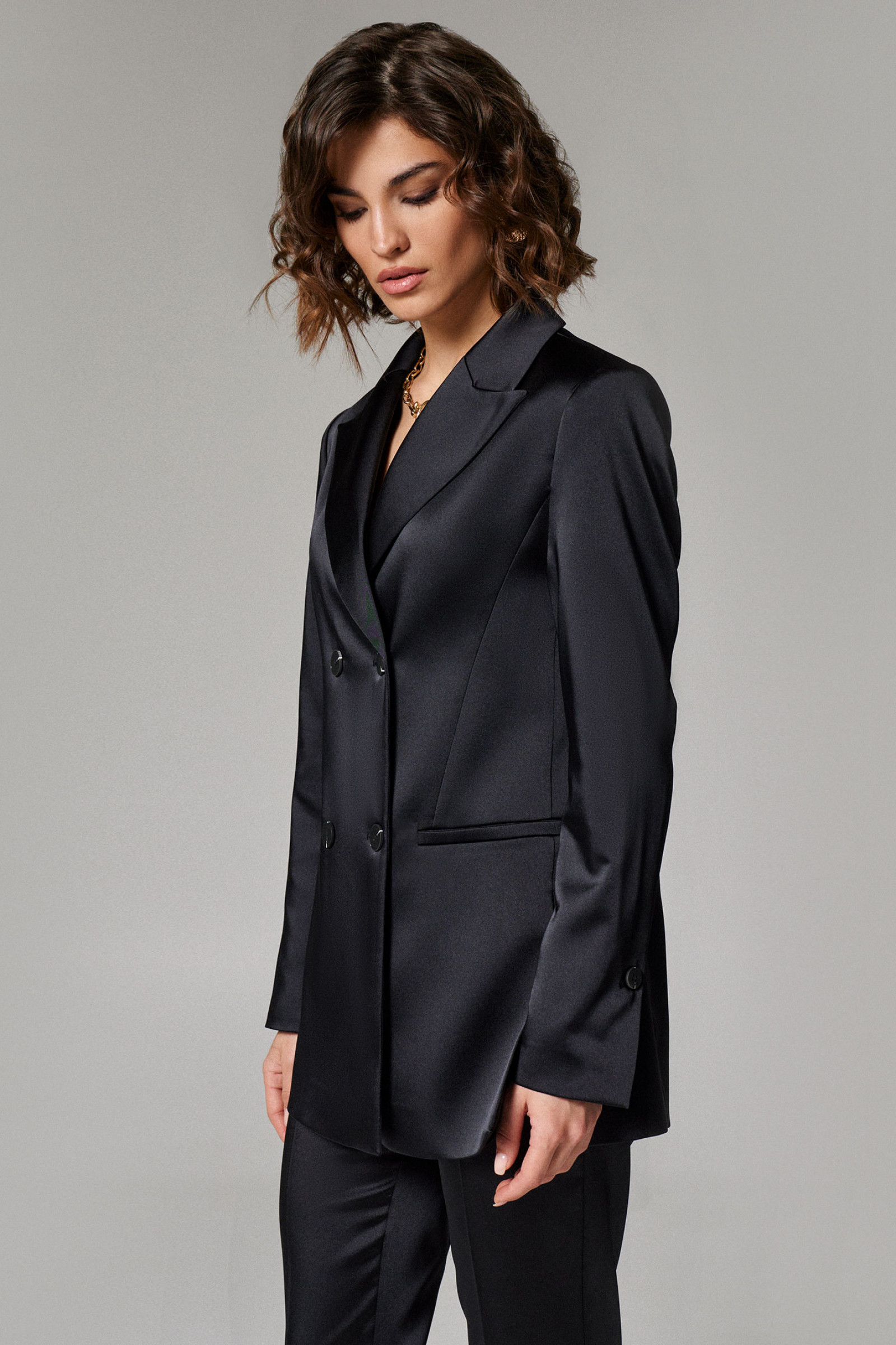 Жакет женский из атласной ткани для повседневной носки прямого силуэта, с отложным воротником и лацканом. Застежка в жакете двубортная на две обметанные петли и две пуговицы. Перед имеет два кармана с листочкой, а также боковую часть переда, идущую из проймы до кармана. На переде располагается два рельефа идущих из проймы до линии низа изделия. Спинка со средним швом и со шлицей в шве, а также рельефы, идущие из проймы до низа изделия. Рукава втачные двухшовные, по низу шлицы имеется застежка на одну обметанную петлю и одну пуговицу. Стильный и практичный жакет на любой выход, в нем вы будете чувствовать себя уверенней, а главное очень комфортно.