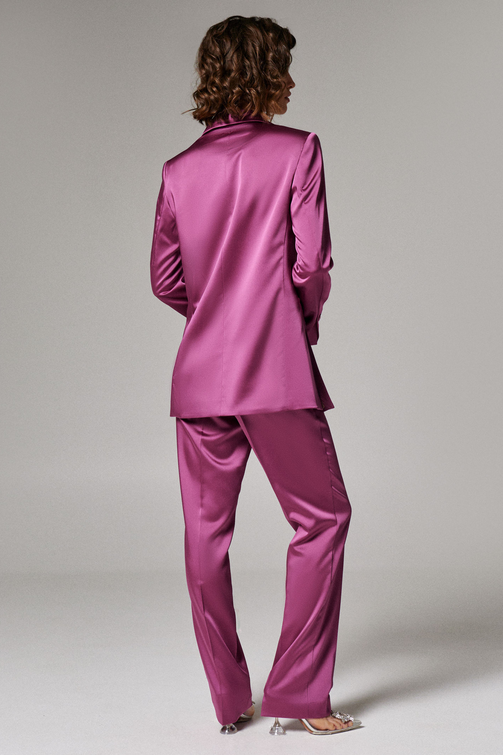 Жакет женский из атласной ткани для повседневной носки прямого силуэта, с отложным воротником и лацканом. Застежка в жакете двубортная на две обметанные петли и две пуговицы. Перед имеет два кармана с листочкой, а также боковую часть переда, идущую из проймы до кармана. На переде располагается два рельефа идущих из проймы до линии низа изделия. Спинка со средним швом и со шлицей в шве, а также рельефы, идущие из проймы до низа изделия. Рукава втачные двухшовные, по низу шлицы имеется застежка на одну обметанную петлю и одну пуговицу. Стильный и практичный жакет на любой выход, в нем вы будете чувствовать себя уверенней, а главное очень комфортно.