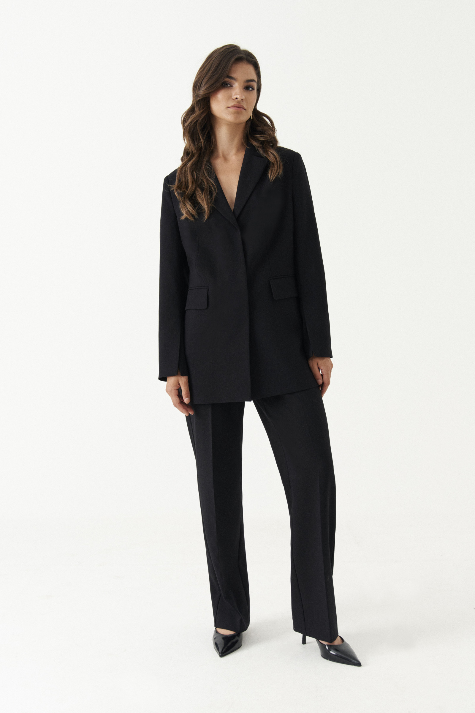 Жакет из поливискозной ткани для повседневной носки. Жакет однобортный полуприлегающего силуэта с длинным втачным рукавом. Воротник отложной. По переду прорезные карманы с клапаном, талиевые вытачки. Средний шов спинки заканчивается шлицей. Длина изделия классическая. Жакет полностью на поливискозной подкладке.