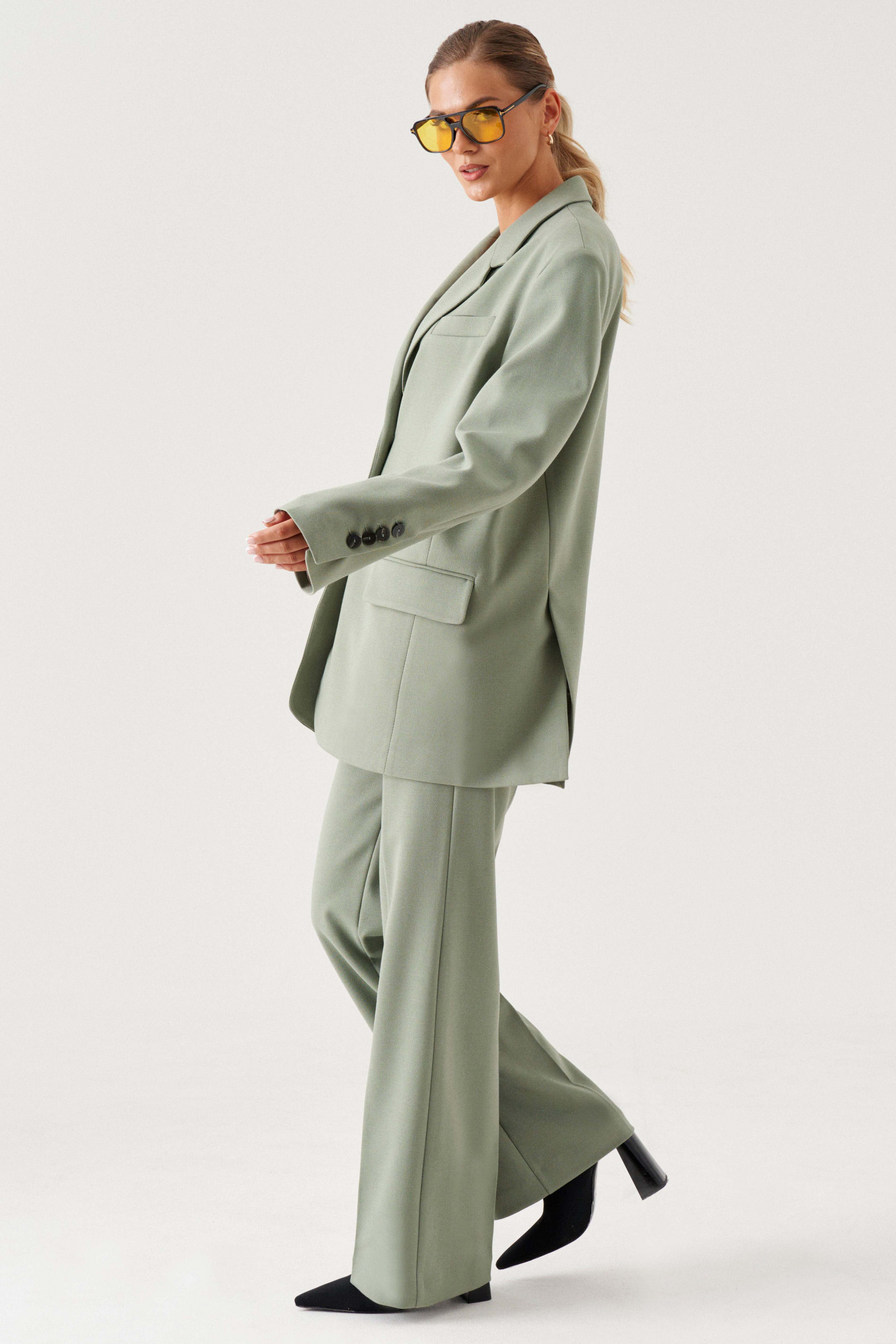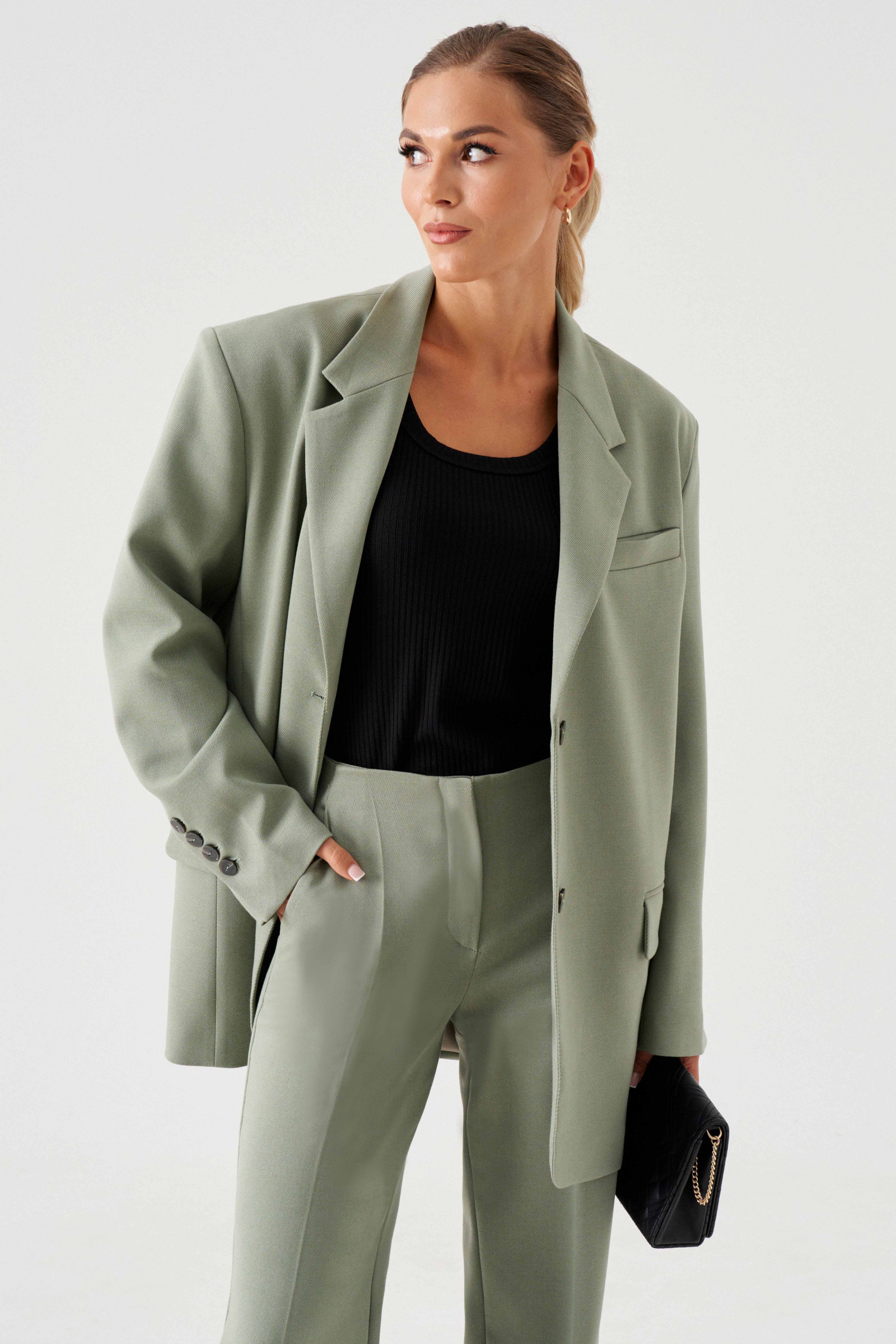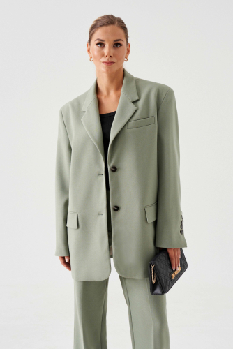 Жакет женский из поливискозной ткани для повседневной носки. Изделие прямого силуэта. Перед имеет нагрудный карман с листочкой, а также прорезной карман с клапаном и двумя обтачками. По переду имеются вертикальные рельефы, идущие от проймы до линии низа изделия. Спинка имеет средний шов и вертикальные рельефы идущие от линии проймы до низа изделия. В среднем шве по спинке располагается шлица. Горловина обработана пиджачным воротником. Длина изделия до середины бедра. Рукав длинный втачной со шлицей, застежка на четыре обметанные петли и четыре пуговицы.
