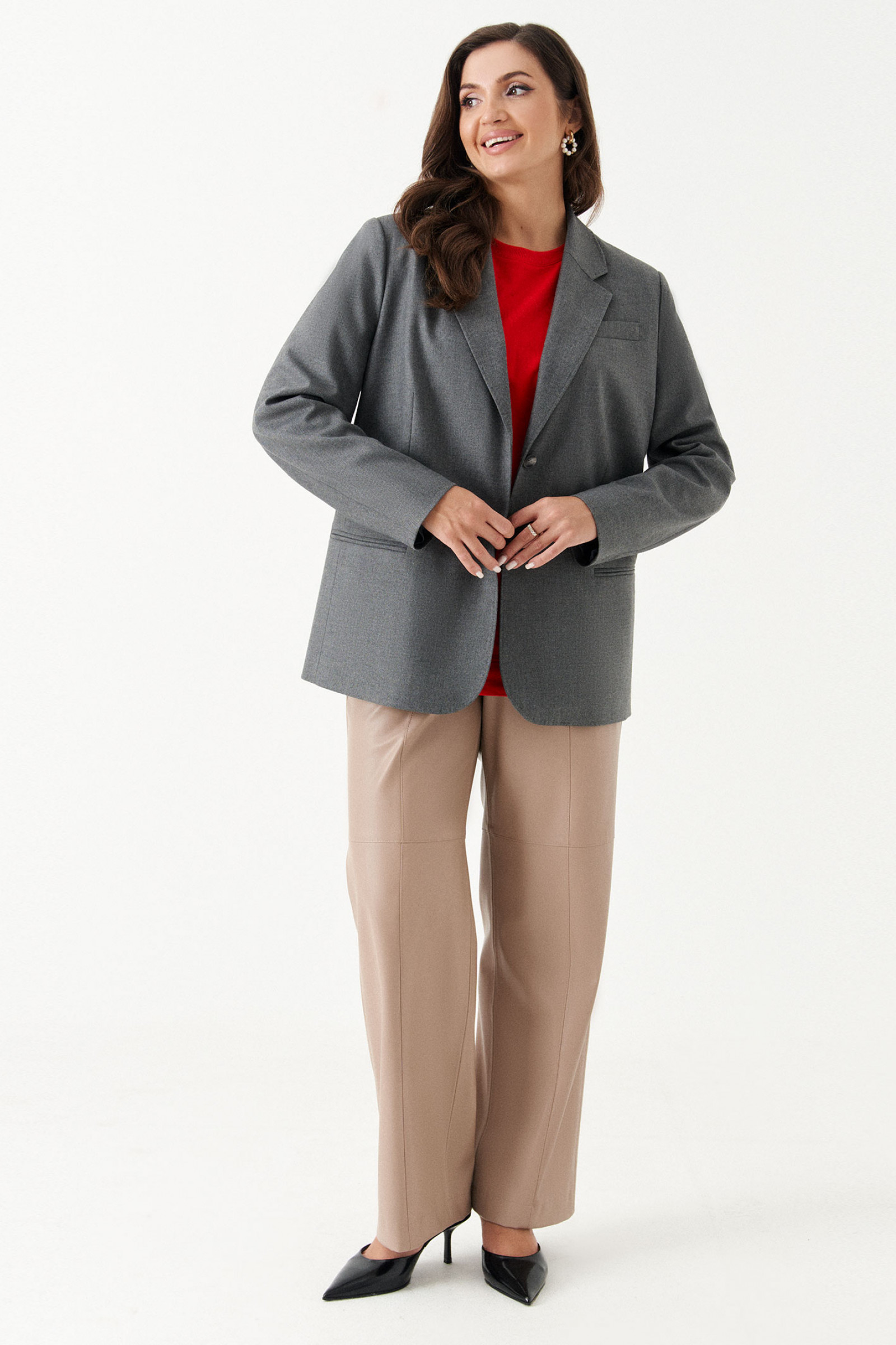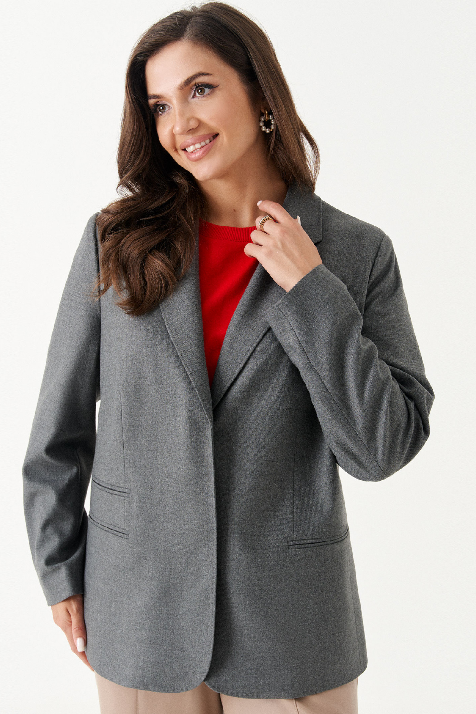 Жакет женский из смесовой ткани для повседневной носки на подкладке. Жакет полуприлегающего силуэта. Жакет с центральной бортовой застежкой на две обметанные петли и две пуговицы. Перед имеет два рельефа, идущих от проймы до низа изделия, а также на переде располагается нагрудный карман с листочкой. По переду имеются две нагрудные вытачки, идущие от груди до кармана, карман с клапаном и двумя обтачками, а особенностью жакета является то, что по правой части располагается два кармана с двумя обтачками. Спинка со средним швом и с двумя рельефами, идущими от проймы до линии низа изделия. Горловина обработана пиджачным воротником, по краю борта, по краю воротника проложена отделочная строчка (ручной стежок). Рукава длинные, двухшовные. Этот изумительный жакет станет вашим спасением для разного рода прогулок и мероприятий. Вы всегда будете в центре внимания.