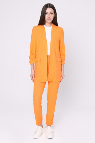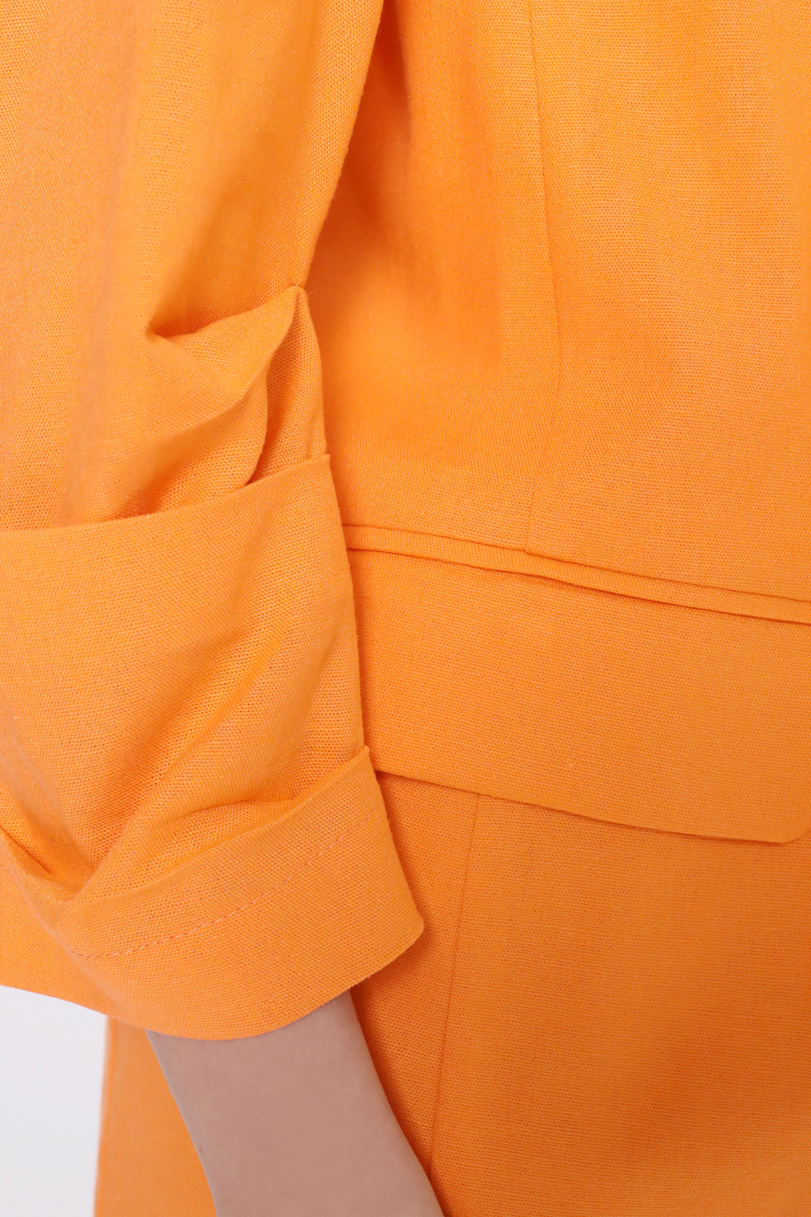 Стильный модный жакет из льняной ткани в стиле "кэжуал". Это повседневный удобный и практичный жакет, который отлично сочетается как с джинсами, так и с брюками. Жакет удлиненный, без застежки, рукава длиной ниже локтя. По переду имеются карманы. Спинка со средним швом, который заканчивается шлицей. Жакет без подкладки.