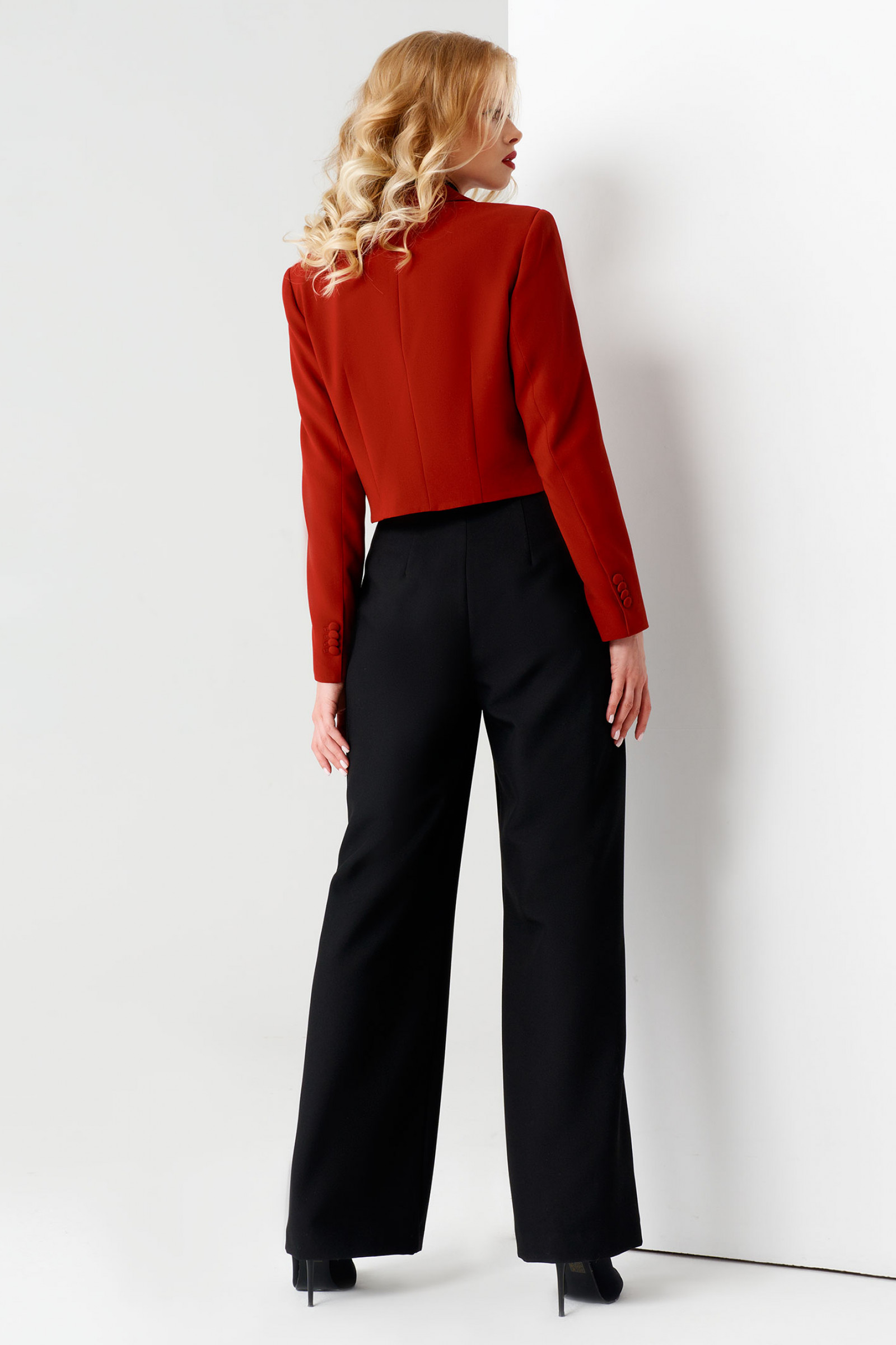 Короткий жакет изготовлен из ткани, которая буквально «дышит» и хорошо пропускает воздух. Благодаря свойствам ткани полуприлегающий силуэт не стесняет движений. Гладкий укороченный жакет дополнен тактильно приятной подкладкой.