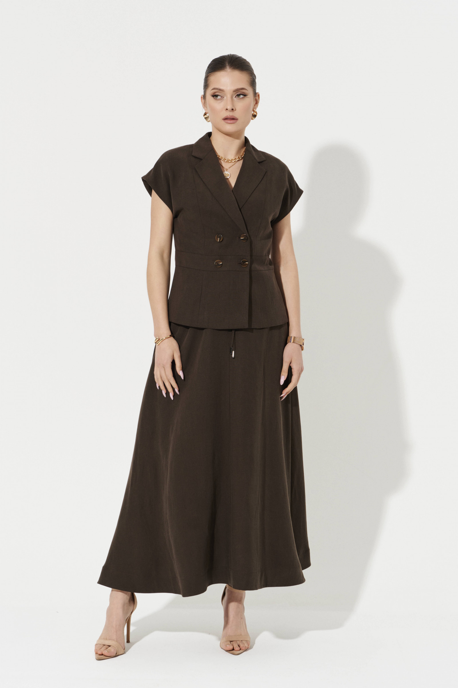 Жакет женский из смесовой ткани с добавление льна для повседневной носки. Жакет полуприлегающего силуэта. Жакет двубортный с застежкой на обметанные петли и пуговицы. Жакет отрезной по линии талии с имитацией пояса. Перед имеет два рельефа идущих от плечевого шва до отрезной части. Низ переда имеет две талиевые вытачки. Спинка со средним швом и двумя рельефами, идущими от плечевого шва до линии низа. Низ спинки имеет средний шов и две талиевые вытачки. Горловина обработана пиджачным воротником. Рукава цельнокроеные, короткие. Жакет на подкладке. Стильный жакет, который доставит вам массу удовольствия своим внешним видом. Данный жакет будет отлично смотреться на любой фигуре.