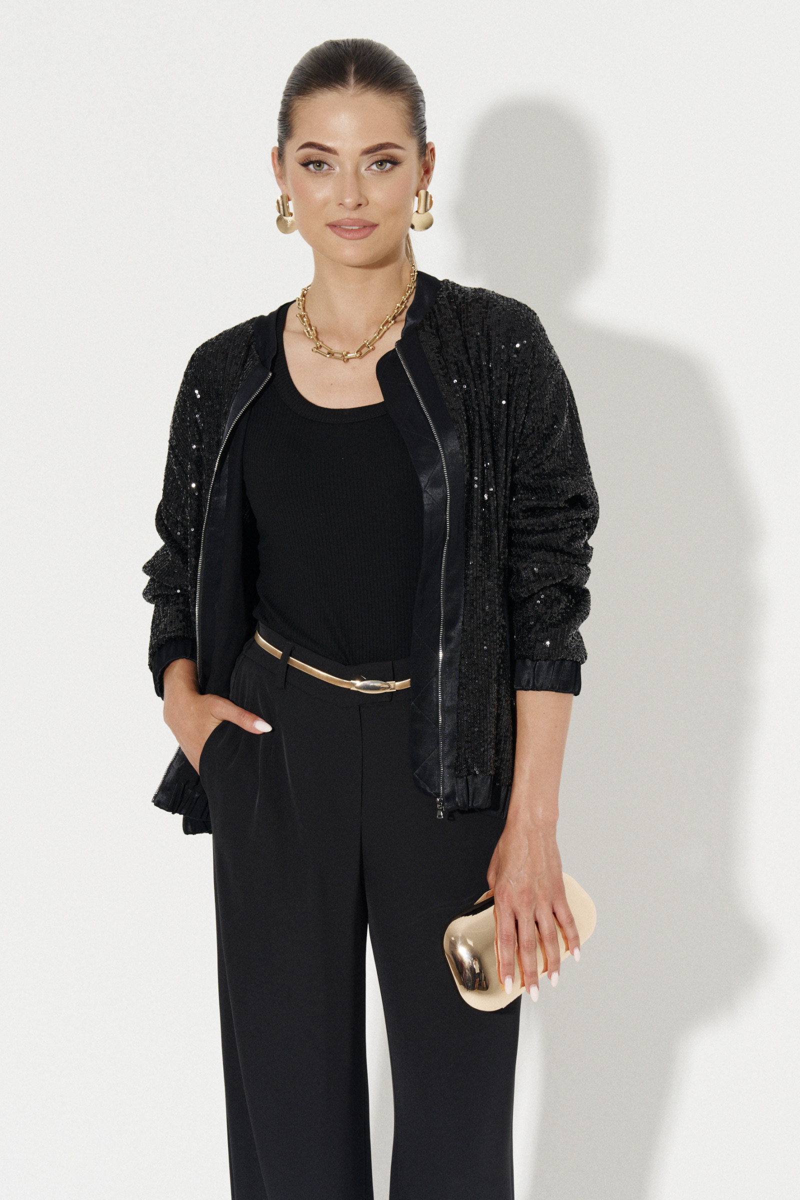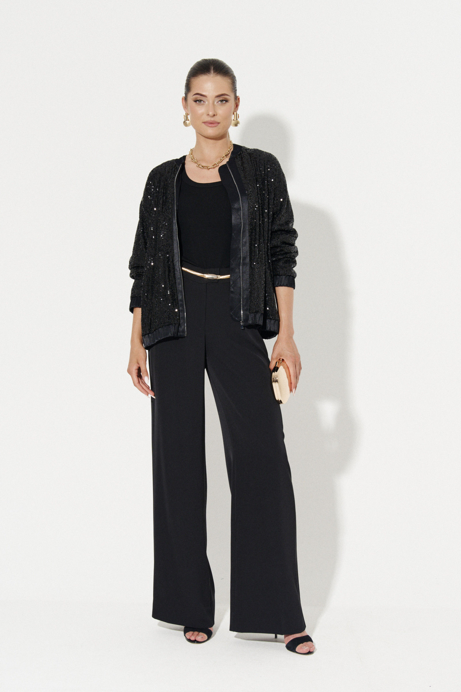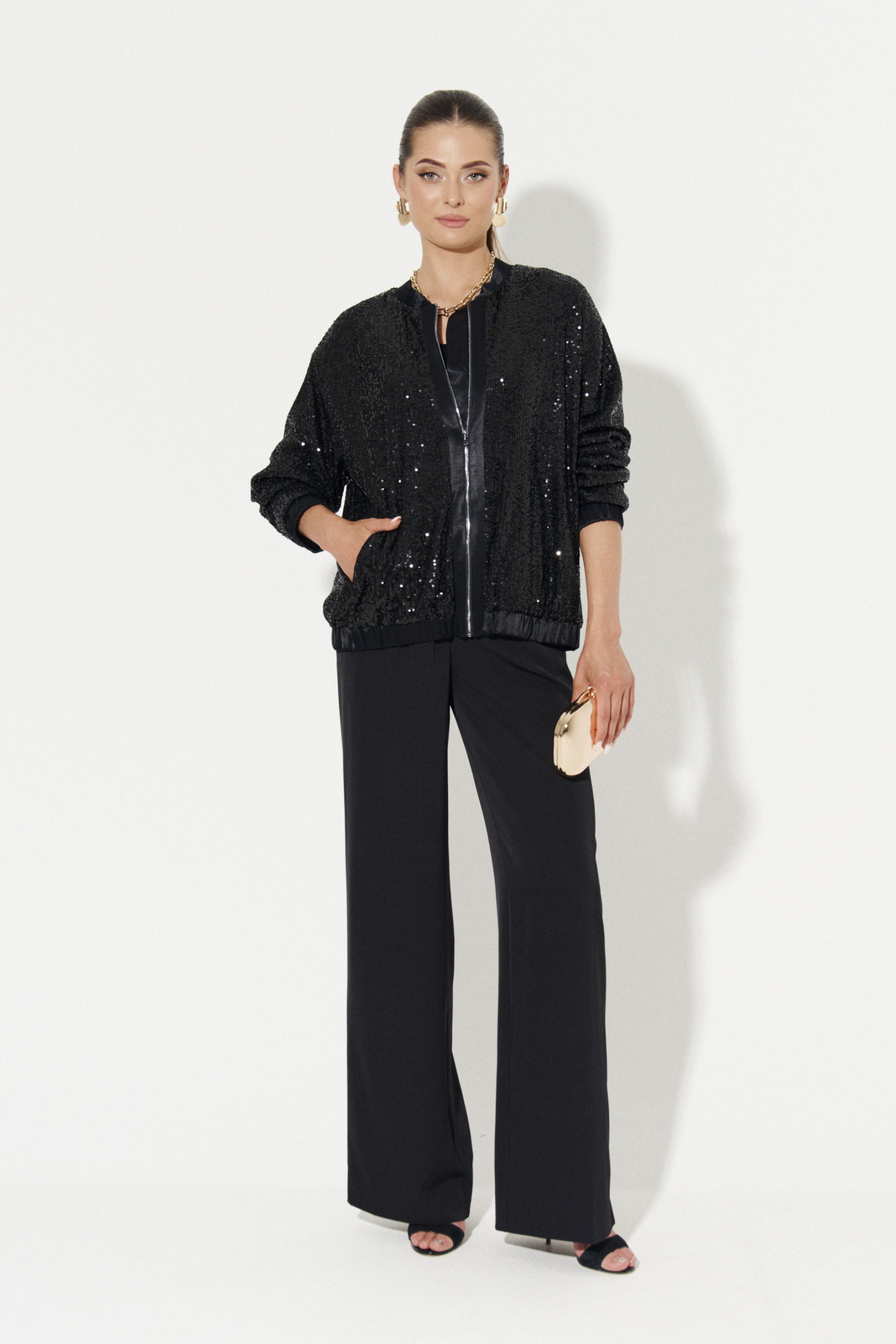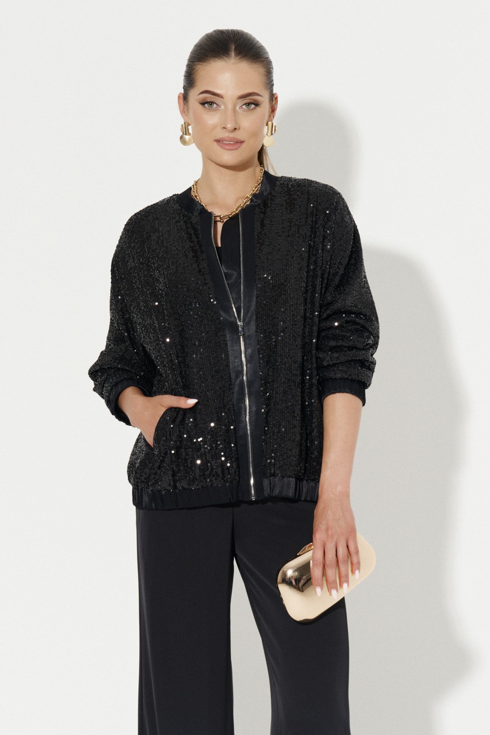 Жакет женский из нарядной ткани в пайетки. Жакет с длинным втачным рукавом. По низу рукава манжета на резинке. По переду имеются прорезные карманы в рамку. Горловина обработана стойкой. Застежка на молнию, вдоль которой отделочные планки. По низу жакета притачной пояс с резинкой. Планки вдоль молнии, манжеты, пояс по низу изделия оформлены деталями из атласной ткани. Жакет на вискозной подкладке. В этом нарядном жакете вы будете неотразимы!